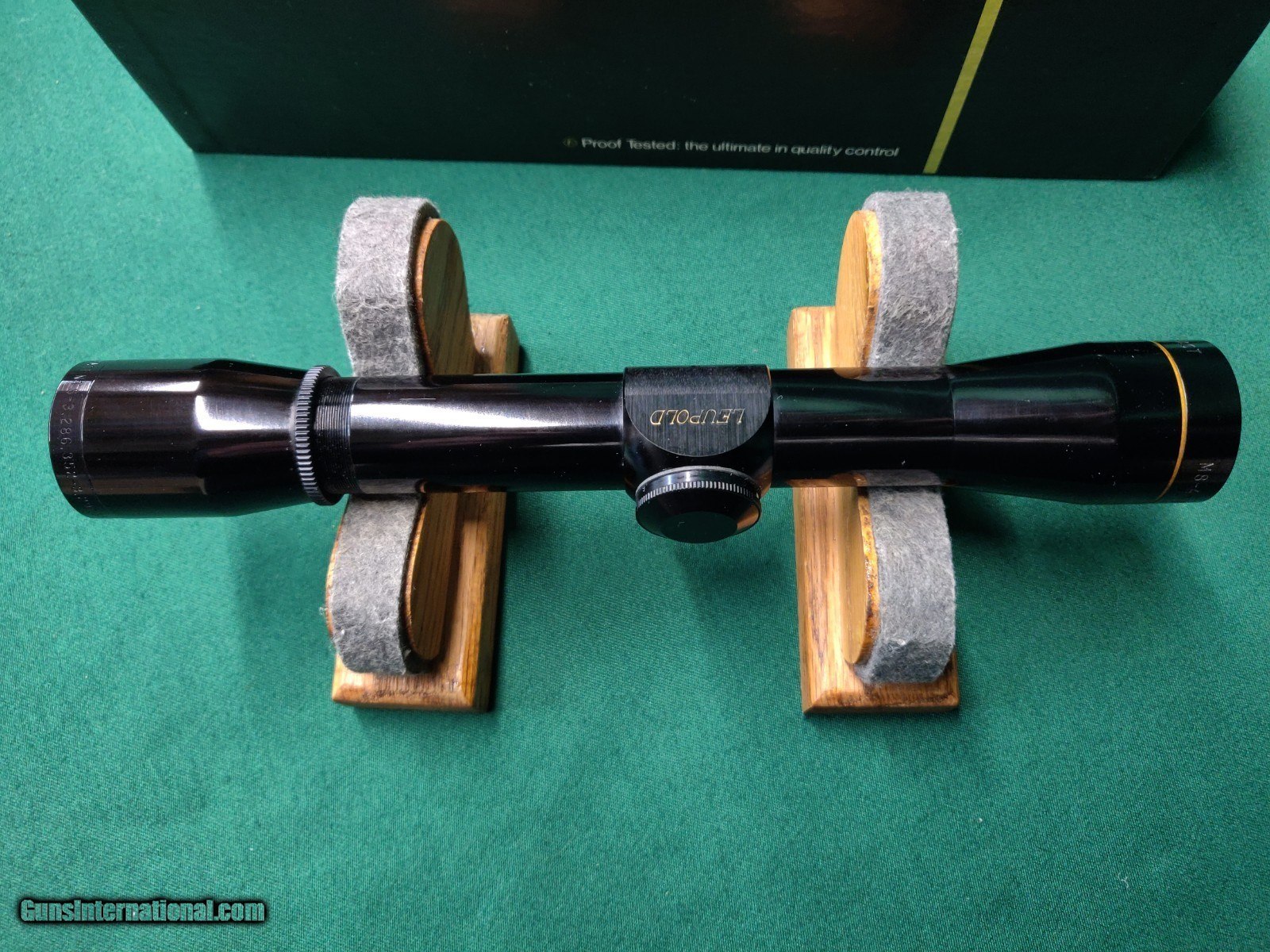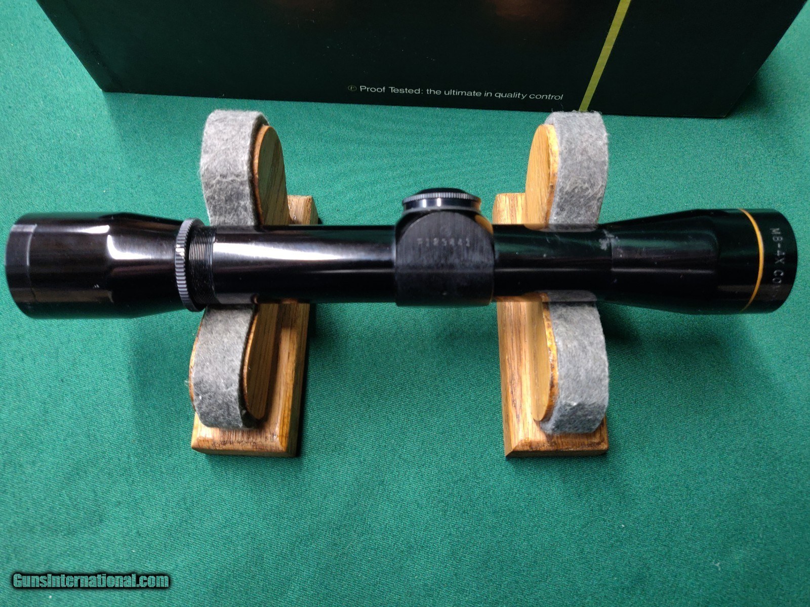 Description: Leupold M8-4x compact riflescope in the original box with duplex crosshairs. This scope has been mounted on a rifle but shows only very minor ring marks. Please examine the photos as to condtion. No international sales. Thanks for your consideration. SOLD |