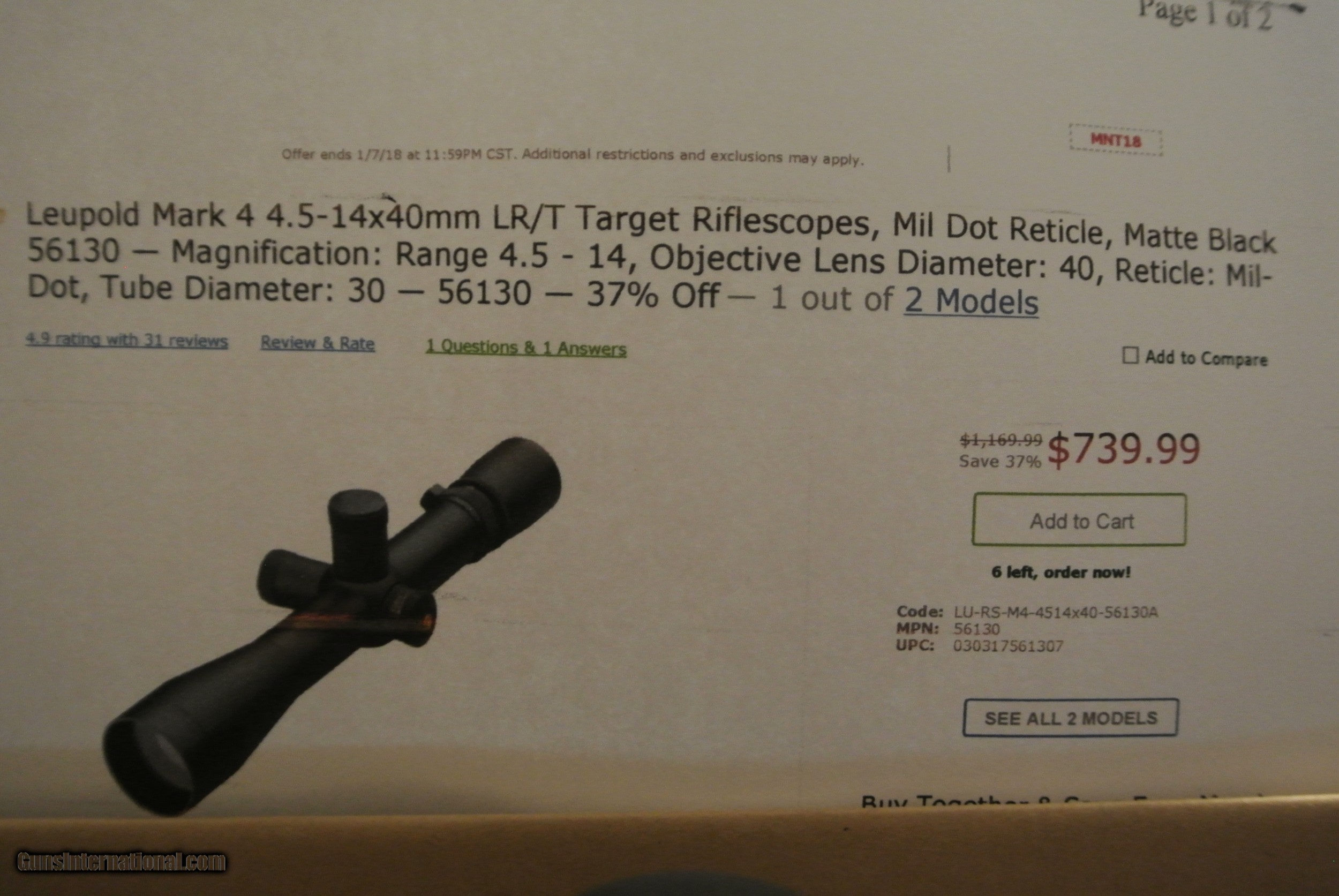 Description: Brand Spankn New in box!! 4.5-14x40MM,Matte finish,30MM Tube,Mill Dot reticle.Turret caps,Flip up covers.Click value:0.25.Weight 16oz. Field of view range:7.3-18.6, Eye relief range3.7-4.4, Length 12.6. Model #56130. SOLD |