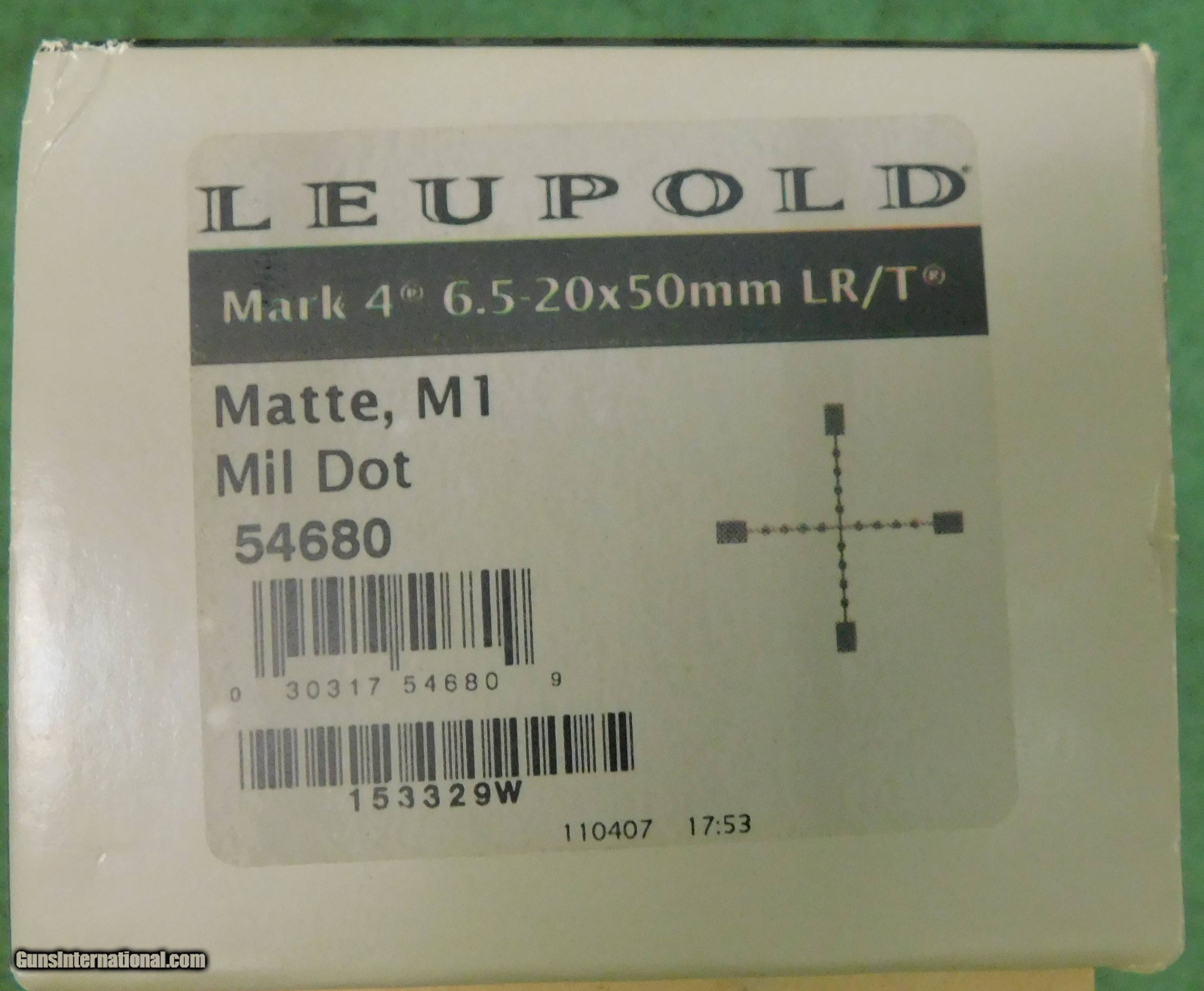 Description: Used leupold mark 4, 6.5 x 20 50mm LR/T, mil dot with box SOLD SOLD |