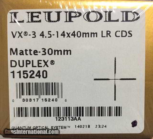 Description: Leupold VX-3 Scope New in Box LR (30mm Maintube Side Focus) 4.5-14 X 50mm Objective Lens CDS (custom dial system) Matte Black Finish Duplex Reticle Leupold Part #115240 Discontinued by Leupold SOLD |