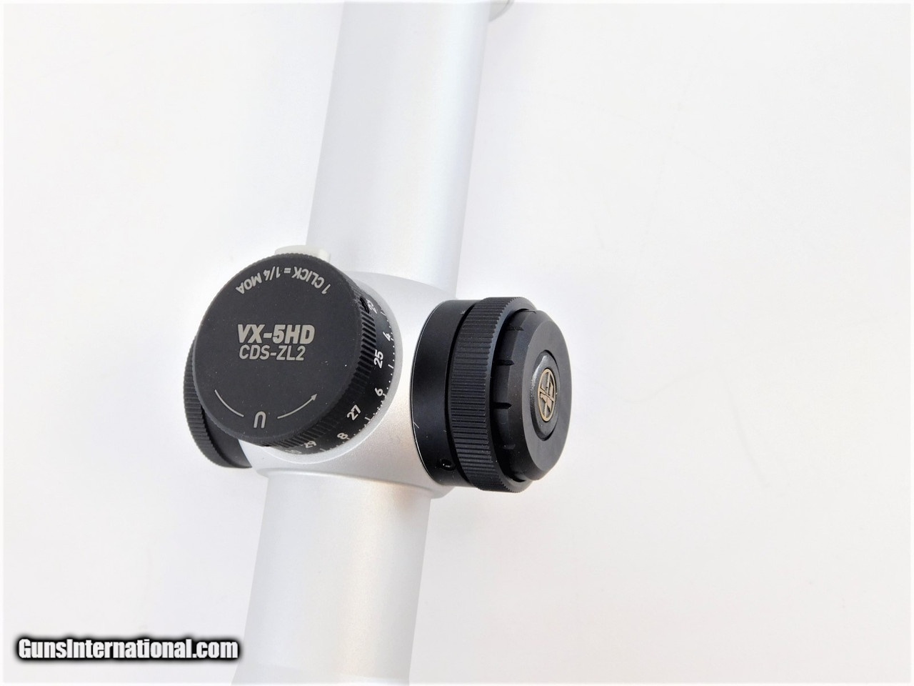 Description: Manufacturer: Leupold Model: VX-5HD 3-15x56mm CDS-ZL2 SKU: 171390 SS Finish: Satin Silver Cerakote Magnification: 3x - 15x Objective: 56mm Tube Diameter: 30mm Overall Length: 13.58" Weight: 22.3 oz Reticle: FireDot Duplex, Illuminated This scope features a custom Cerakote finish that has been applied by US CERAKOTE, our local trained and certified Cerakote technicians. Cerakote is a ceramic and polymer based proprietary formulation that offers industry leading durability, hardness, scratch resistance, corrosion resistance, flexibility, heat and chemical resistance. All items are factory new in box unless otherwise stated. Based on the information available to us, the above specifications describe this item to the best of our knowledge. For further information, please contact or visit the manufacturer's . SOLD |