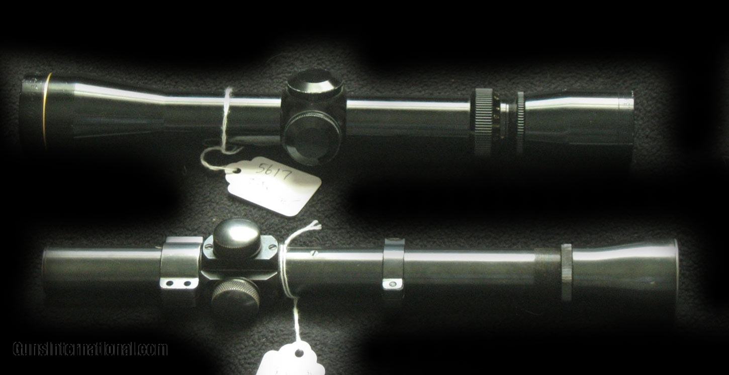 Description: Vintage 7/8" steel tube "All Weather" Alaskan with heavy post and fine crosshair reticle, very good shape, clear and crisp, mounted in period Redfield vertical split turn-in rings (rear ring is half width which just looks neat and these are very hard to find) also in very nice shape. 2.5x (Bottom scope in pics) SOLD |