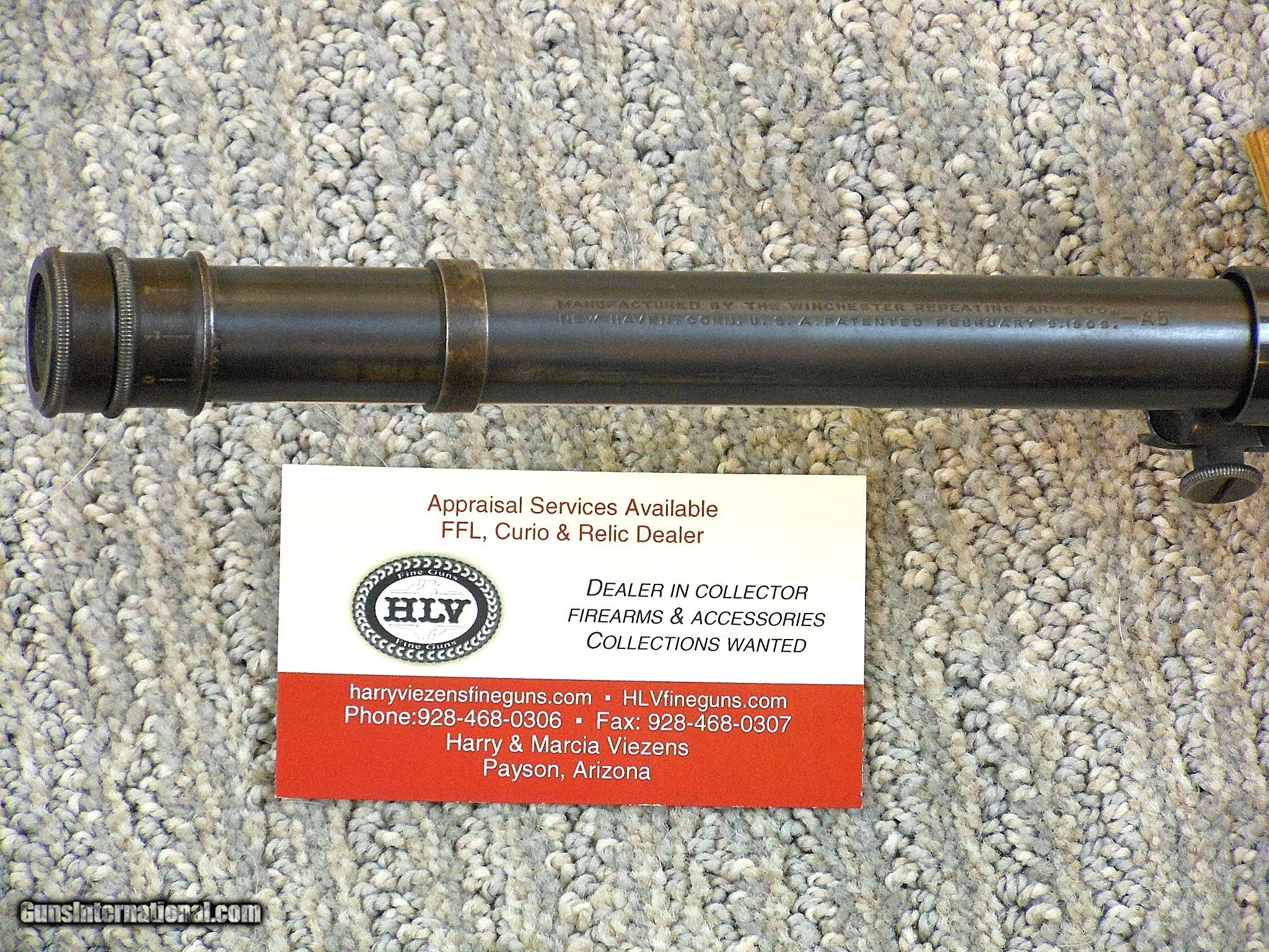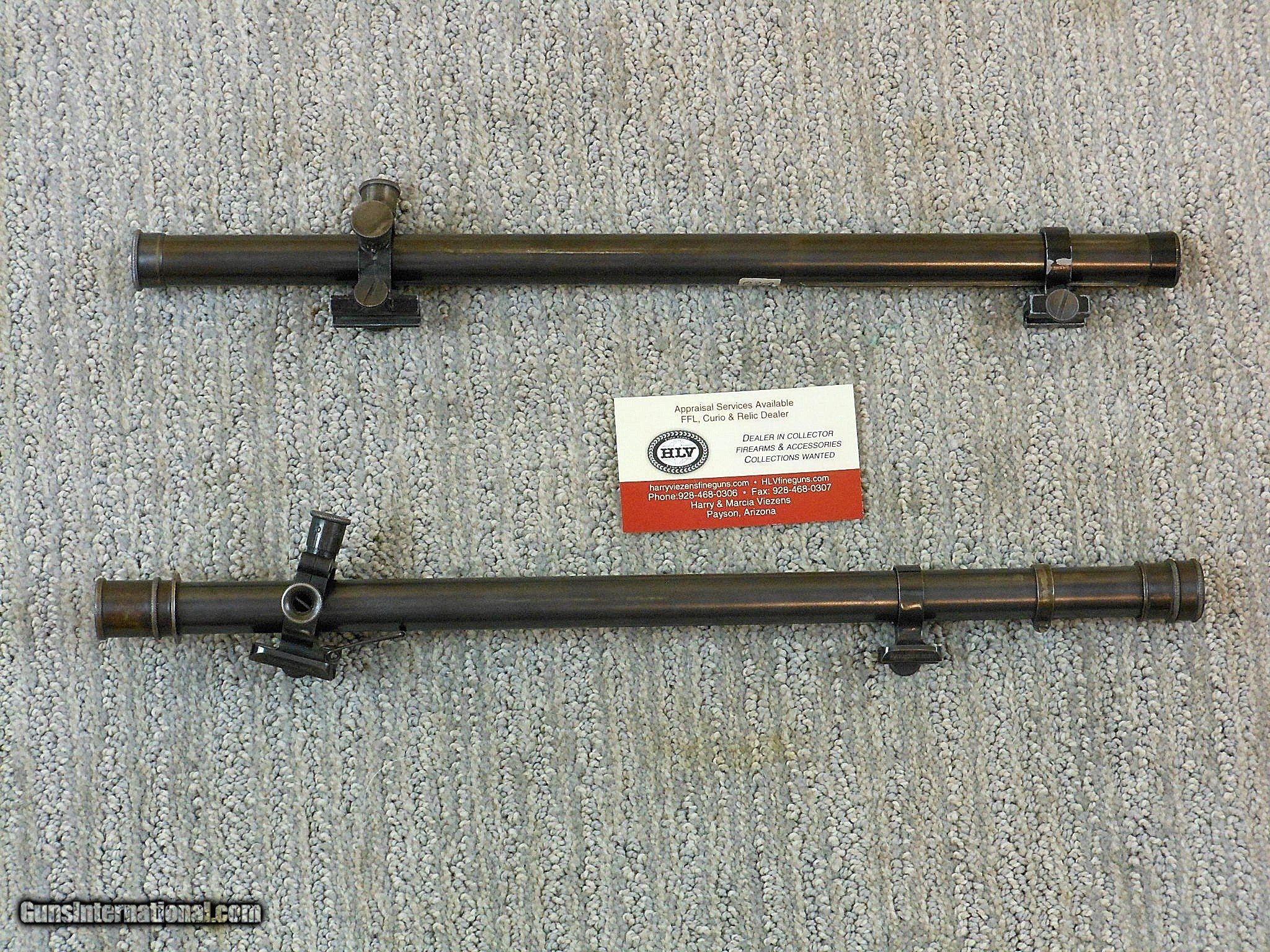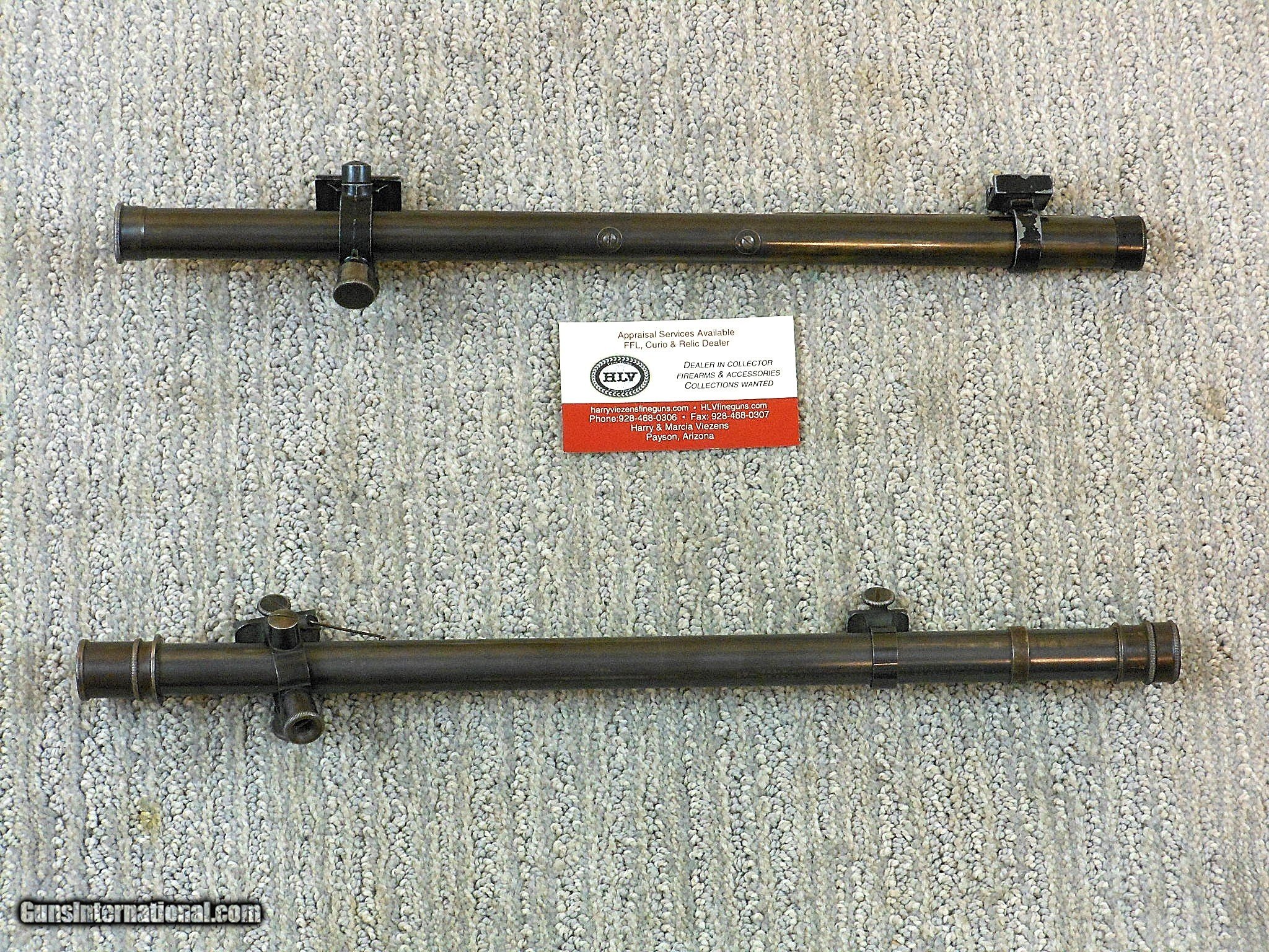 Description: This scope on the top is a Lyman Model 488 Field Scope. It is in very fine condition. The lens are bright and clear. The cross hairs are intact with no issues. The scope adjustments work correctly with no problems. The bluing shows some wear and light loss. This scope is ready to install! The scope on the bottom is a Winchester Model A5 This scope are the correct model for all the Winchester 22 rifles and some of the large bore rifles. The A5 lens is clear with a very light yellowing. The scope adjustments work correctly with no problems The cross hair is intact and clear. This scope is ready to install! J.L.V. Consn (7) F. No. 618 -22 SOLD |