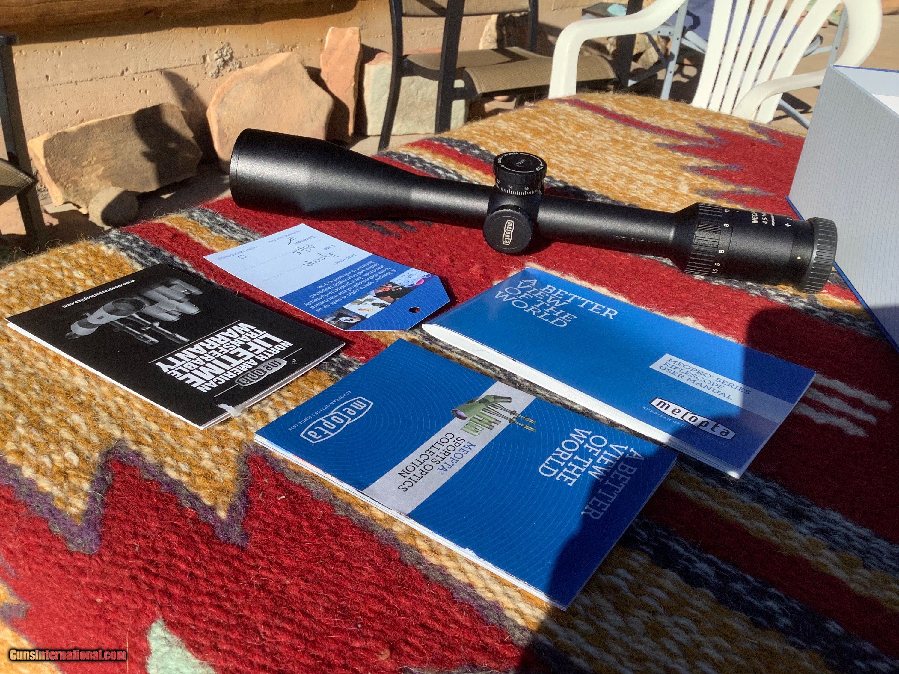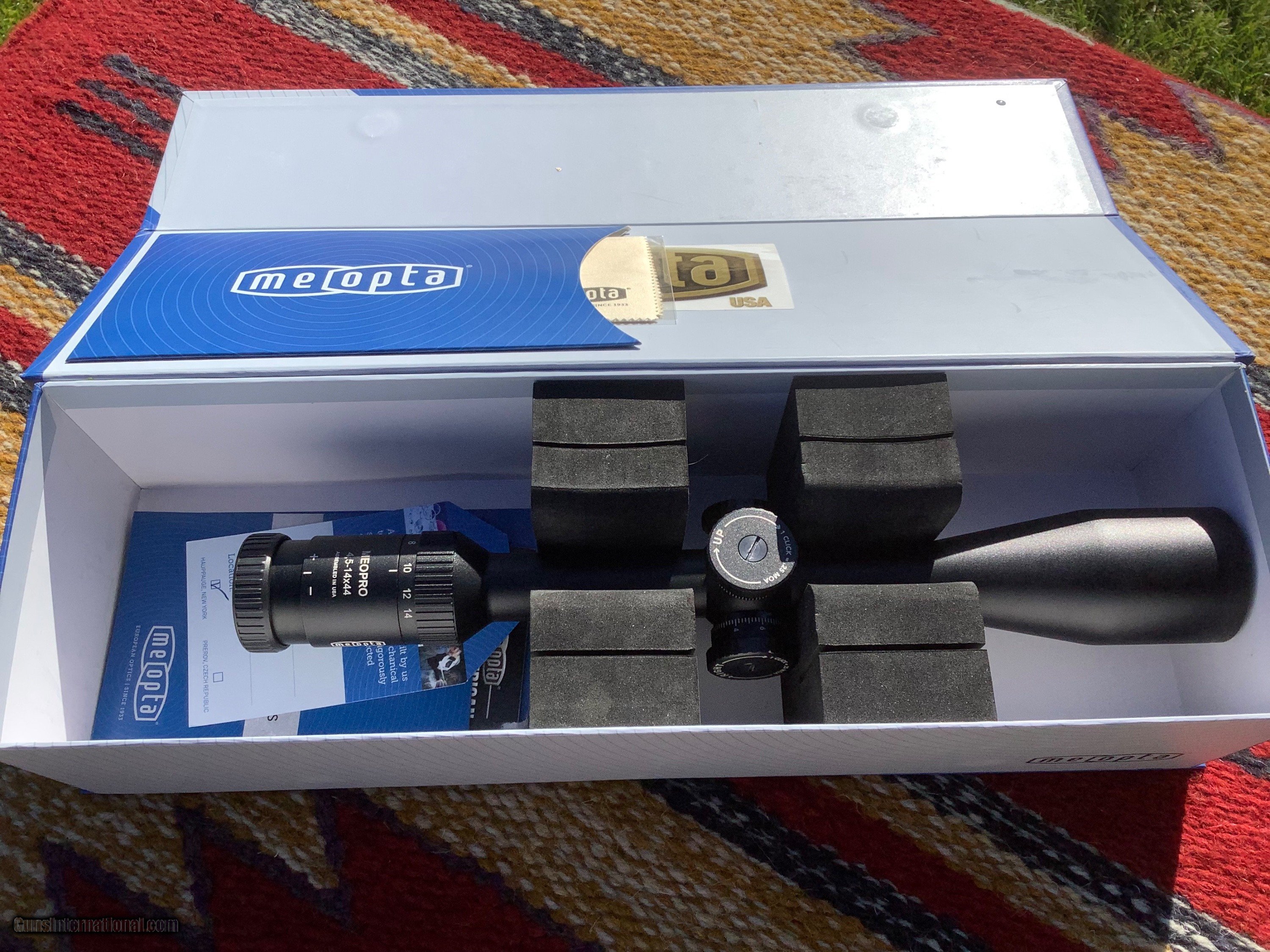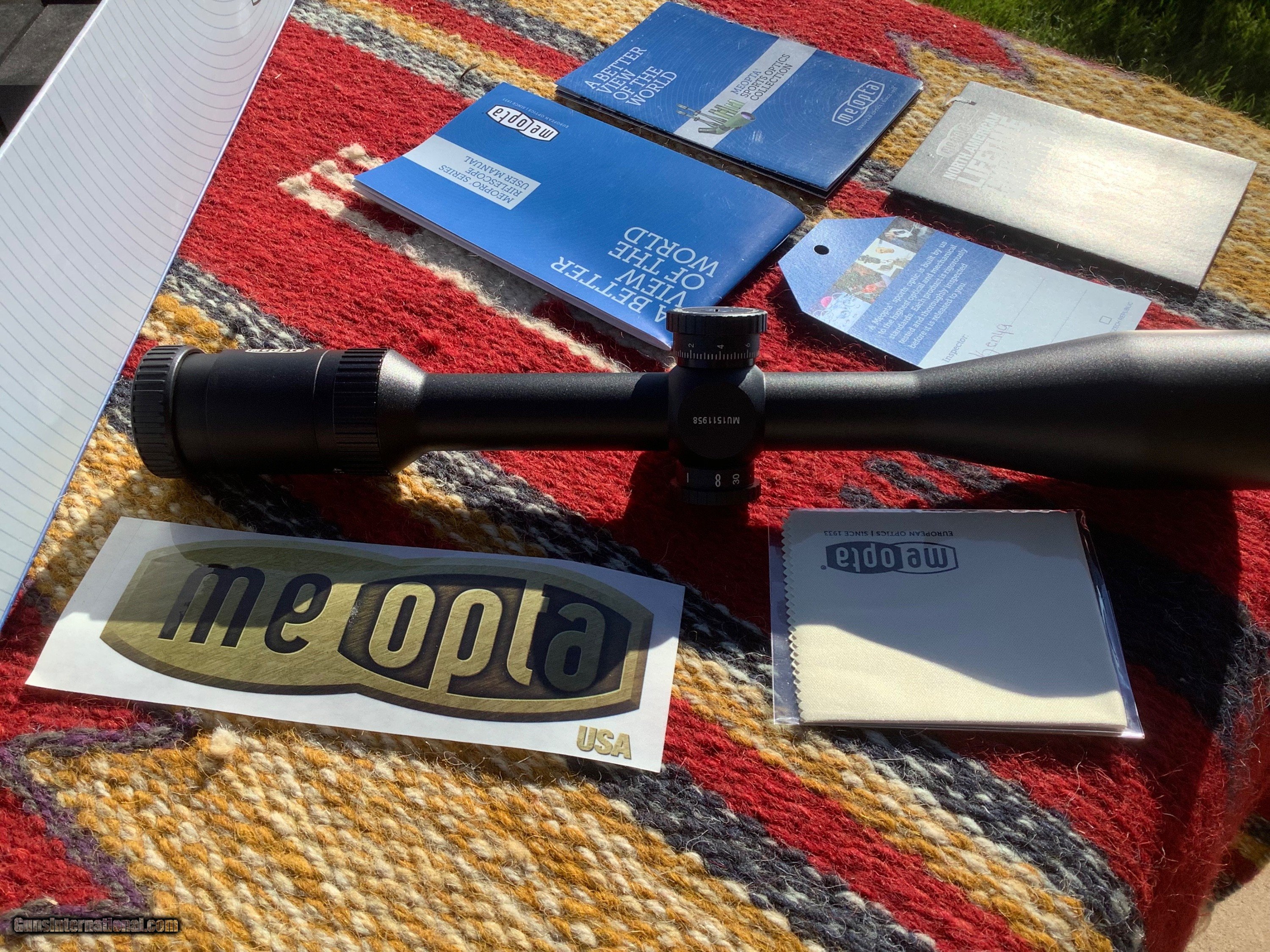 Description: Meopta Meopro 4.5-14 x44 rifle scope, target knobs, assembled in the USA, all manuals , cleaning Cloth, sticker and box in excellent condition. Looks to have been mounted before, a few very light marks on tube. Lifetime warranty on these units, 525.00, shipping included, check or money order. SOLD |