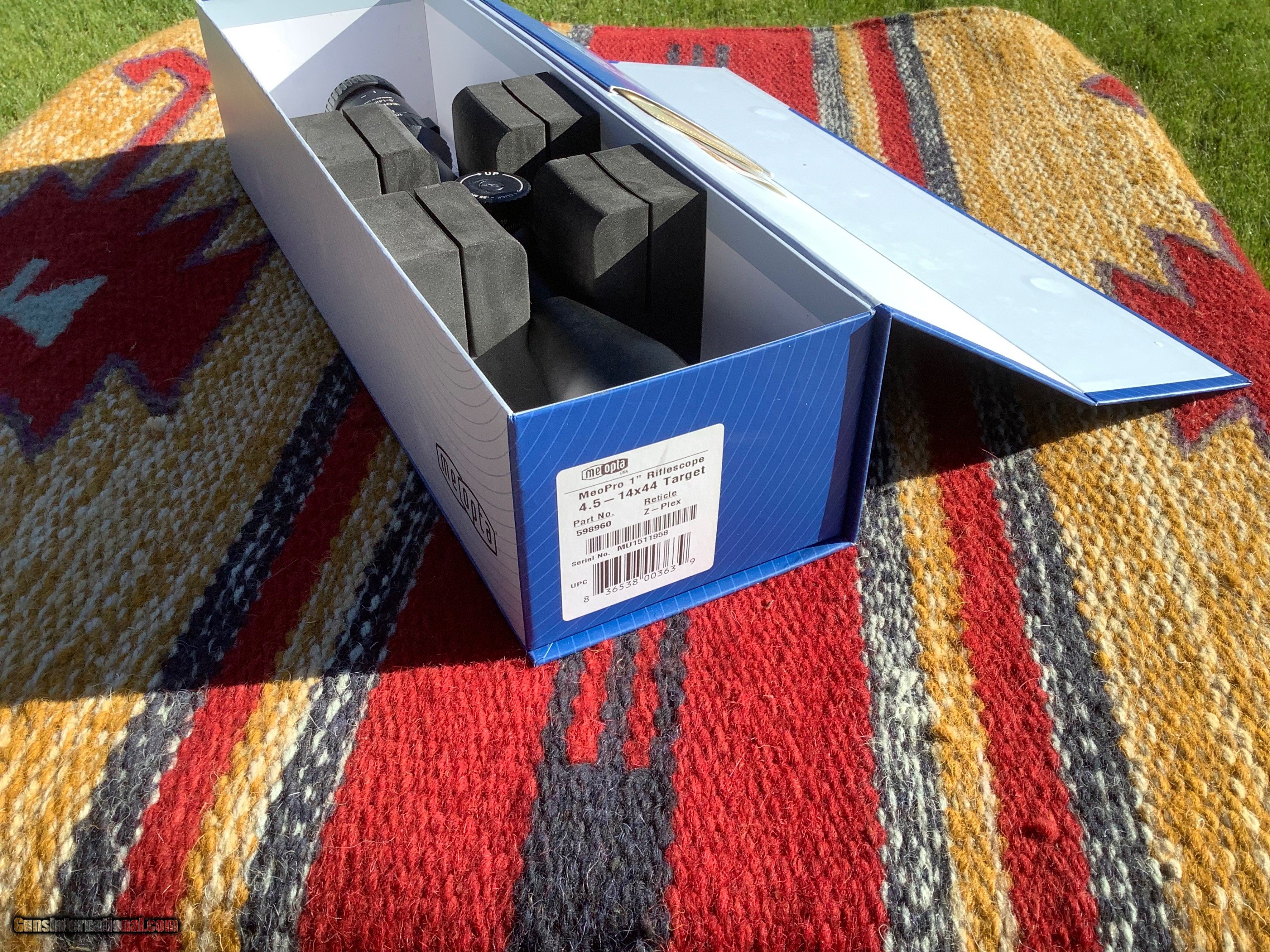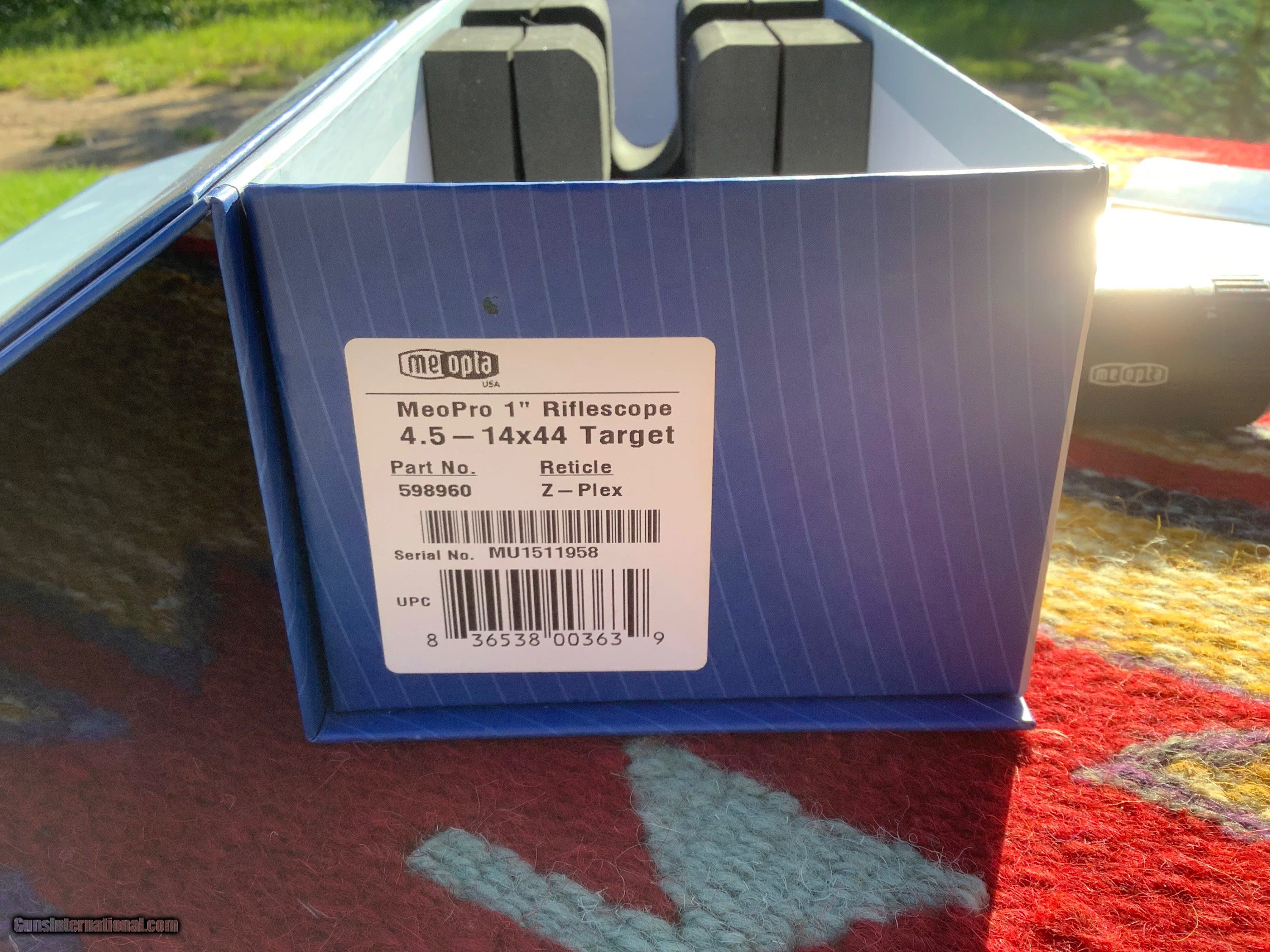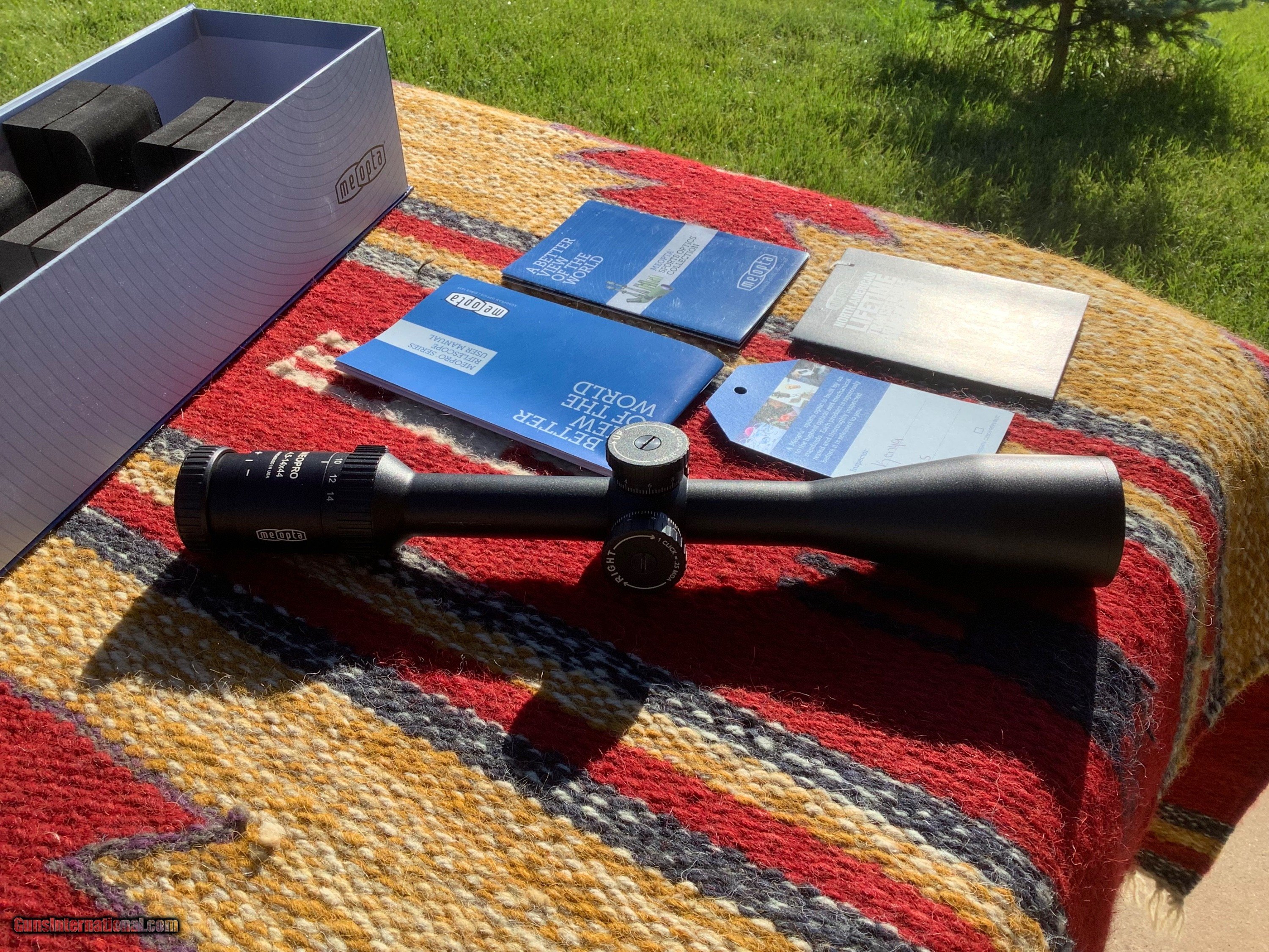 Description: Meopta Meopro 4.5-14 x44 rifle scope, target knobs, assembled in the USA, all manuals , cleaning Cloth, sticker and box in excellent condition. Looks to have been mounted before, a few very light marks on tube. Lifetime warranty on these units, 525.00, shipping included, check or money order. SOLD |
