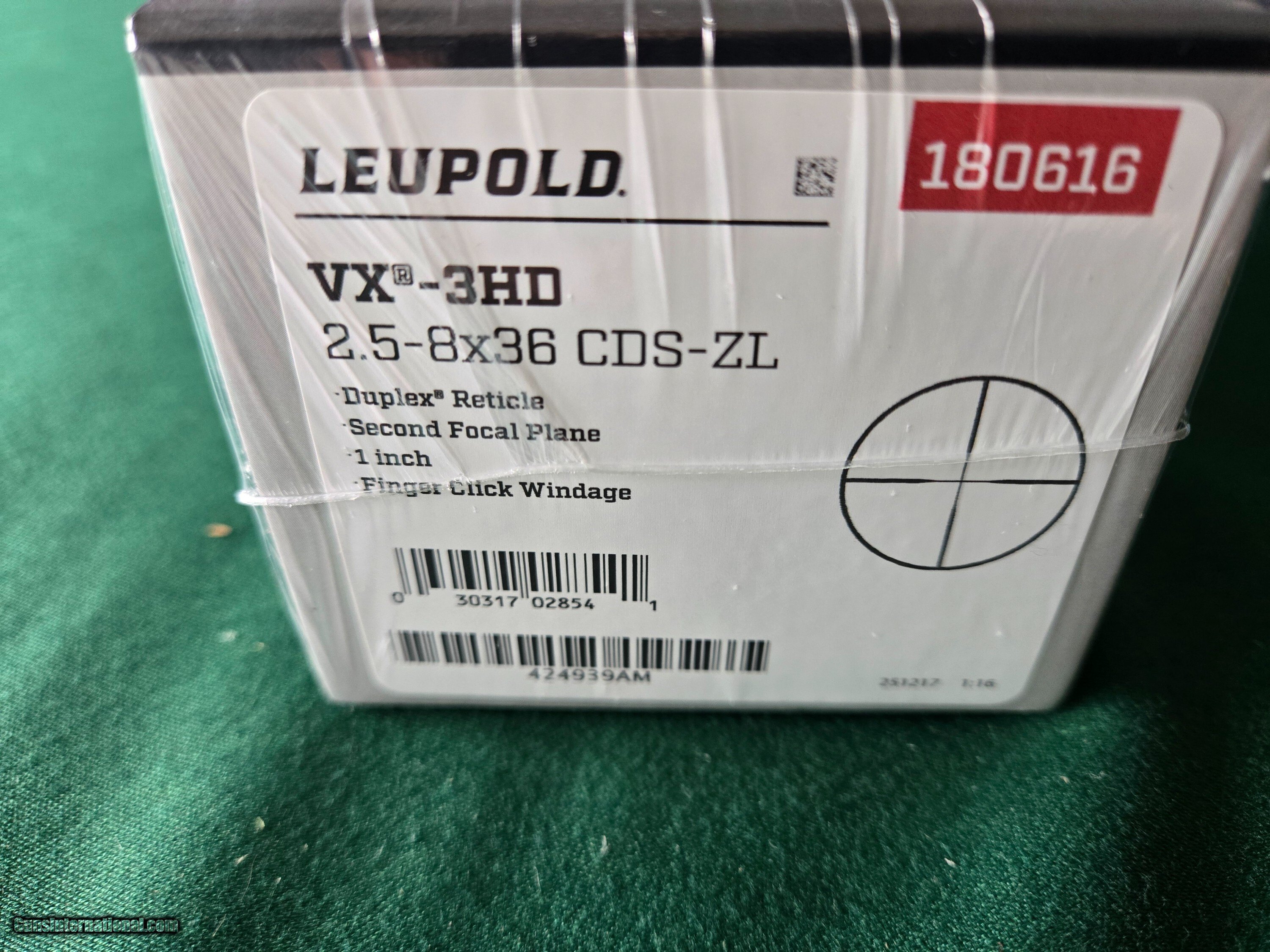 Description: NIB Leupold VX-3HD 2.5-8x36 CDS-ZL riflescope. This is a 1-inch tube diameter scope with a matte finish and duplex reticle. It is a second focal plane scope with finger click adjustments. This scope is still shrink wrapped from the factory so no photos of the scope. Disclaimer/Selling Notes