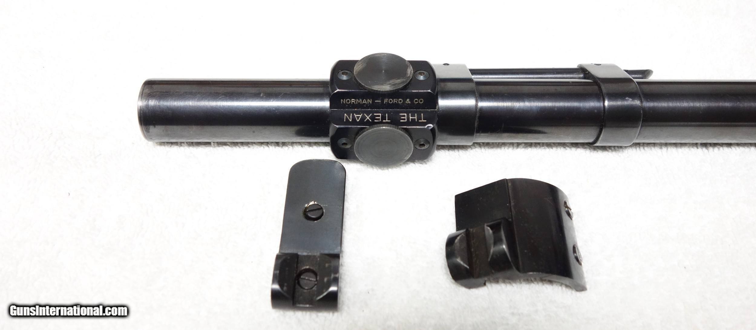 Description: High quality and ultra scarce Norman-Ford Company Texan 2 1/2x rifle scope. 7/8" tube. Standard crosswire reticle. Hard coated lenses. Optically brilliant with no scratches on glass nor any internal issues. Complete with equally rare King-Pike plunger type scope mount specifically designed to fit the factory drilled holes of a Pre War Winchester Model 70 to avoid having to drill the top of the rear receiver bridge. Will fit all other Pre 64 Winchester models 70 and 54 as well. A very high quality and difficult to obtain set up that would be ideal for your early undrilled 70! SOLD |