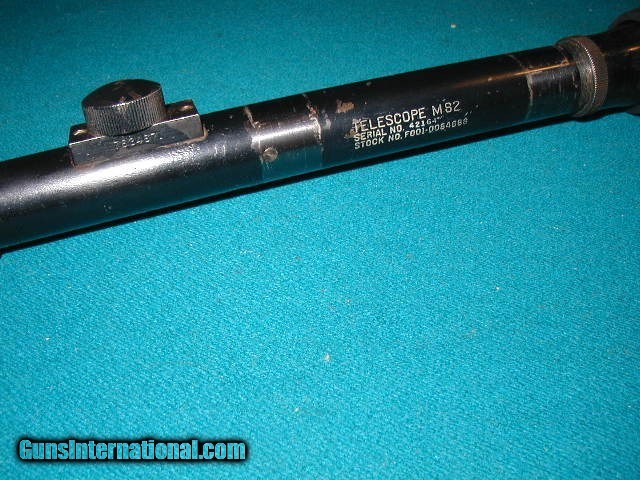 Description: THIS IS AN ORIGINAL WW 2 M-82 SNIPER SCOPE . IT WAS ORIGINALLY MOUNTED ON AN M1-C RIFLE. THEY ARE ALSO USED ON 1903-A4'S AND MI-D'S. THIS PARTICULAR ONE WAS ACTUALLY USED AND ISSUED ON AN M1-C.....IT CAME IN ON AN ISREALI M1-C RE-IMPORTED SNIPER AND THE RIFLE WAS SO MARKED. THERE ARE NO SUCH MARKS OR IMPORT MARKINGS ON THE SCOPE ITSELF. THE OPTICS AND RETICLE ARE CLEAR AND PERFECT. YOU CAN SEE THE ORIGINAL BLUE WHERE THE SCOPE RINGS SAT ON THE M1-C MOUNT/RINGS. THE ISREALI'S ACTUALLY PAINTED THEIR SCOPES WITH A SEMI DULL BLACK FINISH AND YOU CAN SEE THAT IN THE PHOTOS. APPARENTLY AT THAT TIME, THEY DID NOT WANT THEIR SNIPERS BEHIND A HIGHLY POLISHED BLUE REFLECTIVE SCOPE IT SEEMS. NOT A BAD IDEA. LATER ISSUED M-82'S WERE ALSO PHOSPHATED OR DULL BLUE FOR THE SAME REASON. THE ORIGINAL MARKINGS ARE ALL INTACT. THE FUNCTIONING FRONT SUN SHIELD, SCOPE CAPS AND ADJUSTMENT BASES ALL HAVE THEIR ORIGINAL PART NUMBERS . INCLUDES THE RUBBER EYE PEICE. SHOWS SOME HONEST WEAR AND FLAKING. OVER ALL, A VERY GOOD, OPTICALLY CLEAR , AUTHENTIC M-82 SNIPER SCOPE. ***** SEE NEW PICTURES...I TOOK THE LIBERTY OF REMOVING THE PAINT FROM THE SUN SHADE AND REAR EYE PIECE TO SEE THE FINISH UNDERNEATH.....CAME OFF WITHOUT ANY TROUBLE WITH FORBY'S, AND MIN WAX FURNITURE REFINSHER AND OO STEEL WOOL...... SOLD |
