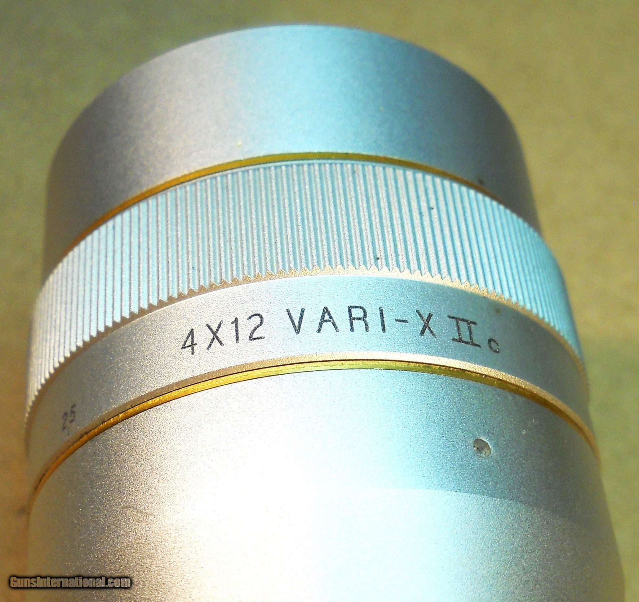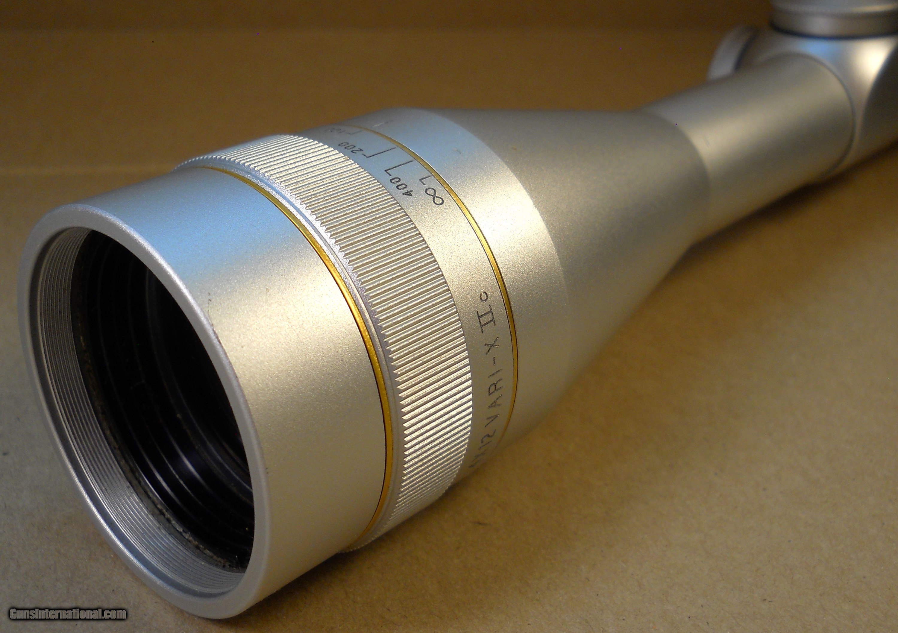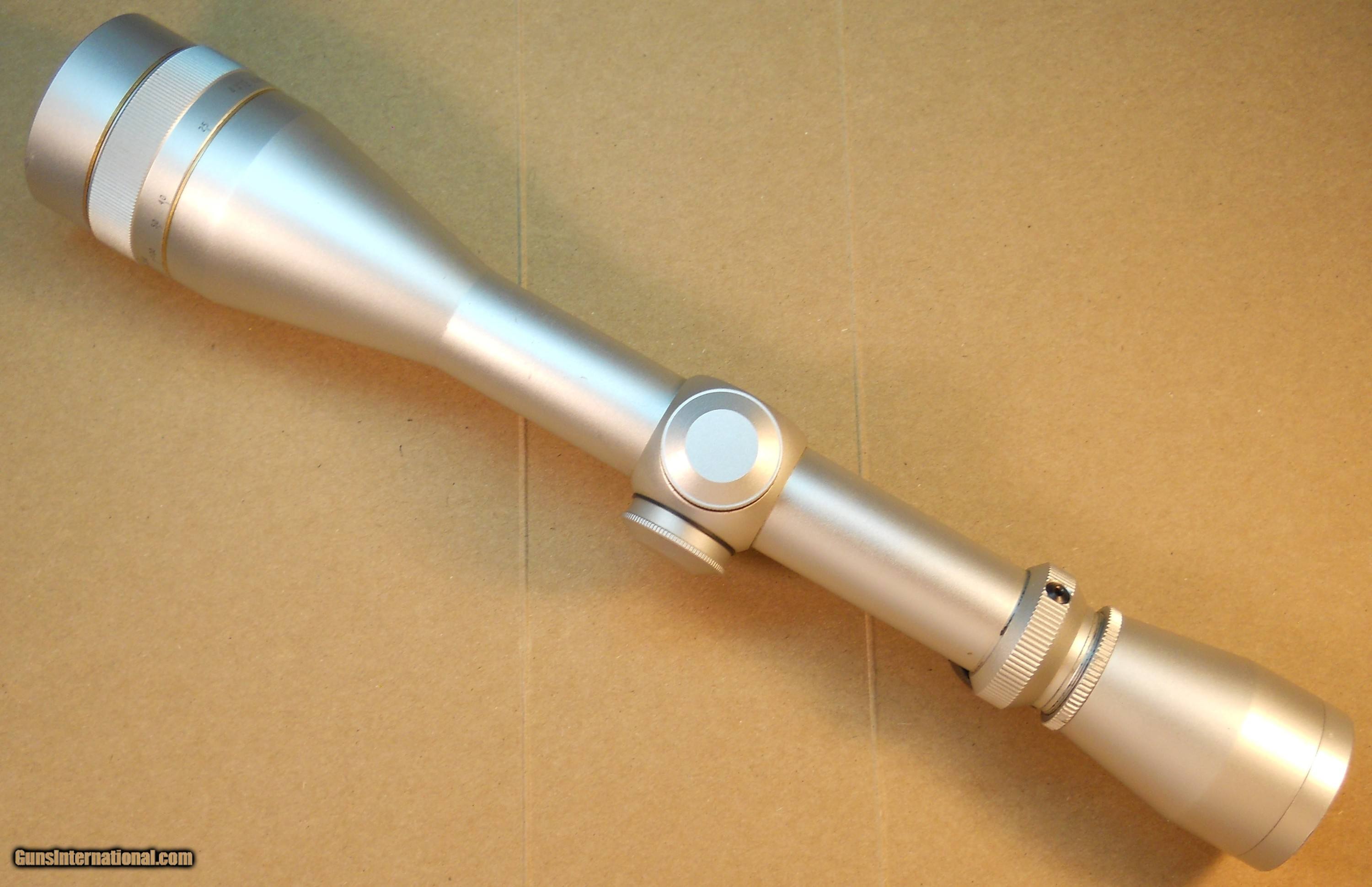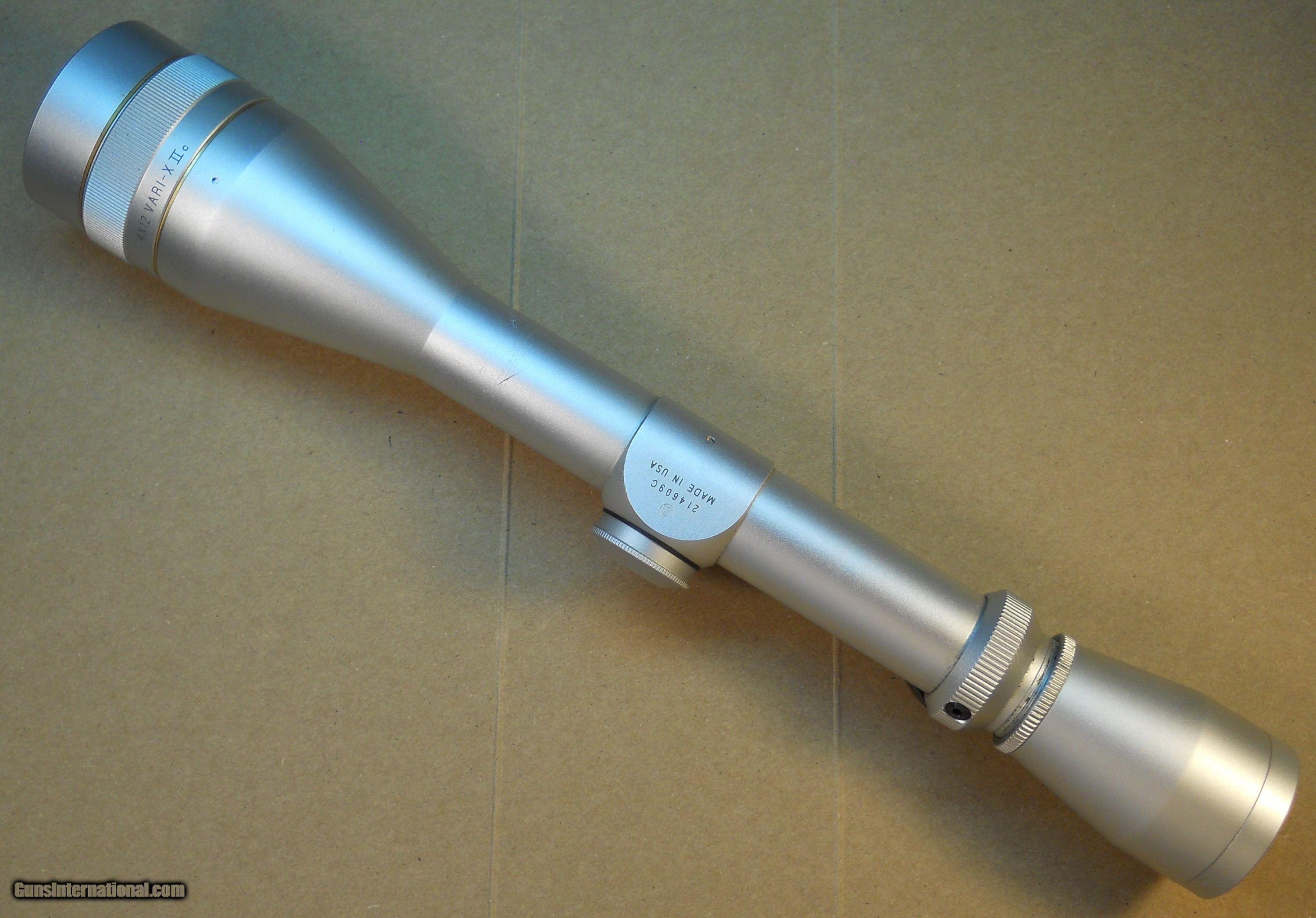 Description: Best offer accepted. This is a Leupold 4 x 12 VARI-X IIc Silver rifle scope. It is a variable power 4 to 12 power scope with a 40mm adjustable objective lens. The adjustable objective lens ring is marked from 25 yards to Infinity. The main tube is one inch diameter and the scope is 12-1/4 inches long. It has a duplex reticle. This scope has a serial number with the letter "C" suffix which means this scope was made in 1995. Leupold no longer makes silver rifle scopes. If you want a silver Leupold scope you must buy it on the used scope market. This scope is covered by Leupold's life time guarantee which I have copied from Leupold'ssite and included here: With the Leupold Gold Ring Full Lifetime Guarantee, if your Leupold product doesn't perform as promised, we will repair or replace it for free, whether you are the original owner or not, forever (excludes electronic components). You don't need proof of ownership. Or a warranty card. And there is no time limit. We do this because we believe in superior quality and craftsmanship, and we are confident your Leupold won't let you down. That is the power of our company, and we stand behind our work. This scope is in good condition. It has 98% of its original finish. The view through the scope is clear and bright. The duplex reticle is clean and straight. There are a few very small ring marks from normal use and mounting. There is one slightly larger scratch on the top of the front bell that is shown in the last 2 photos. This scratch does not affect function. Everything works as it should. This is a nice looking, fully functional high-quality scope ready to install and give a lifetime of service on your rifle. The photos show the condition well. US Sales only. Shipping via priority mail with delivery confirmation, tracking and insurance will be $10.00. Postal Money Order payment is prefered. If you pay by noon, I usually ship the same day. Satisfaction is guaranteed. If you do not like this item send it back in the condition received within 7 days for a full refund. Thanks for looking. SOLD |