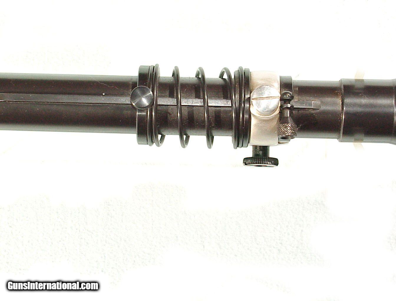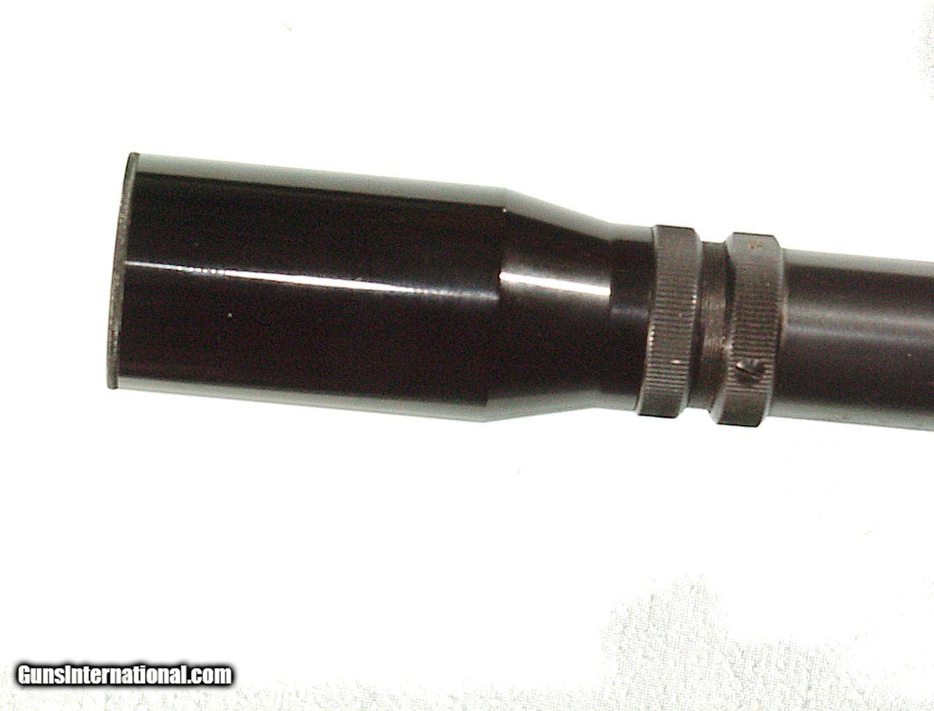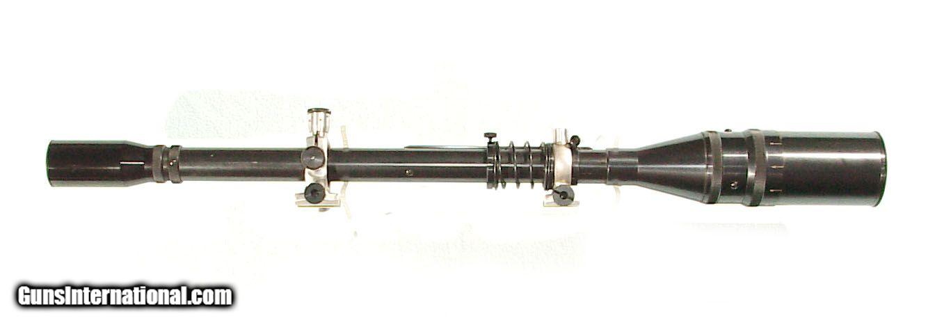 Description: 15X power with adjustable front ring for windage and elevation. 24" length with both the front and rear screw on lens caps. Showing little evidence of use. Perfect optics. Standard cross hair reticle. SOLD |