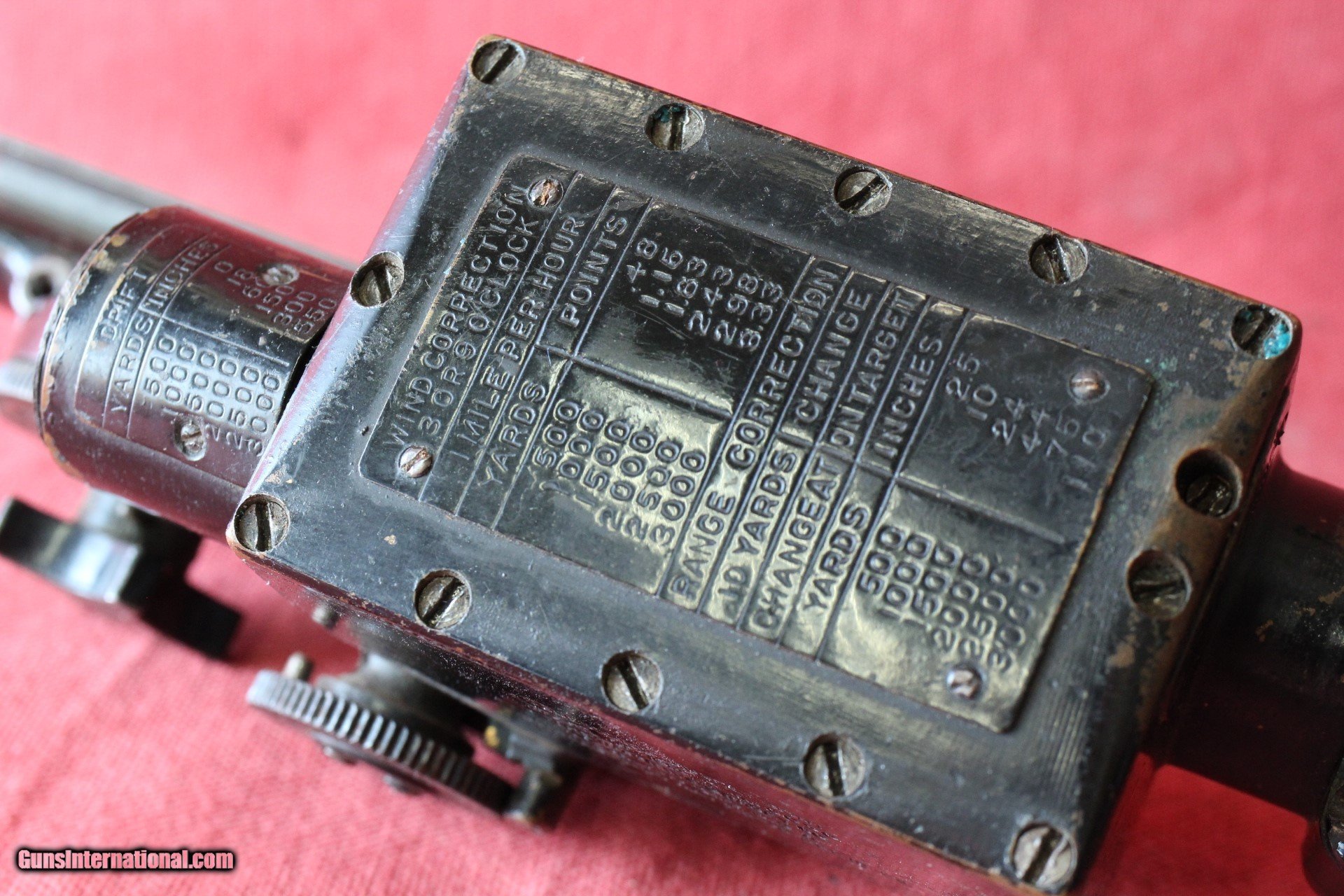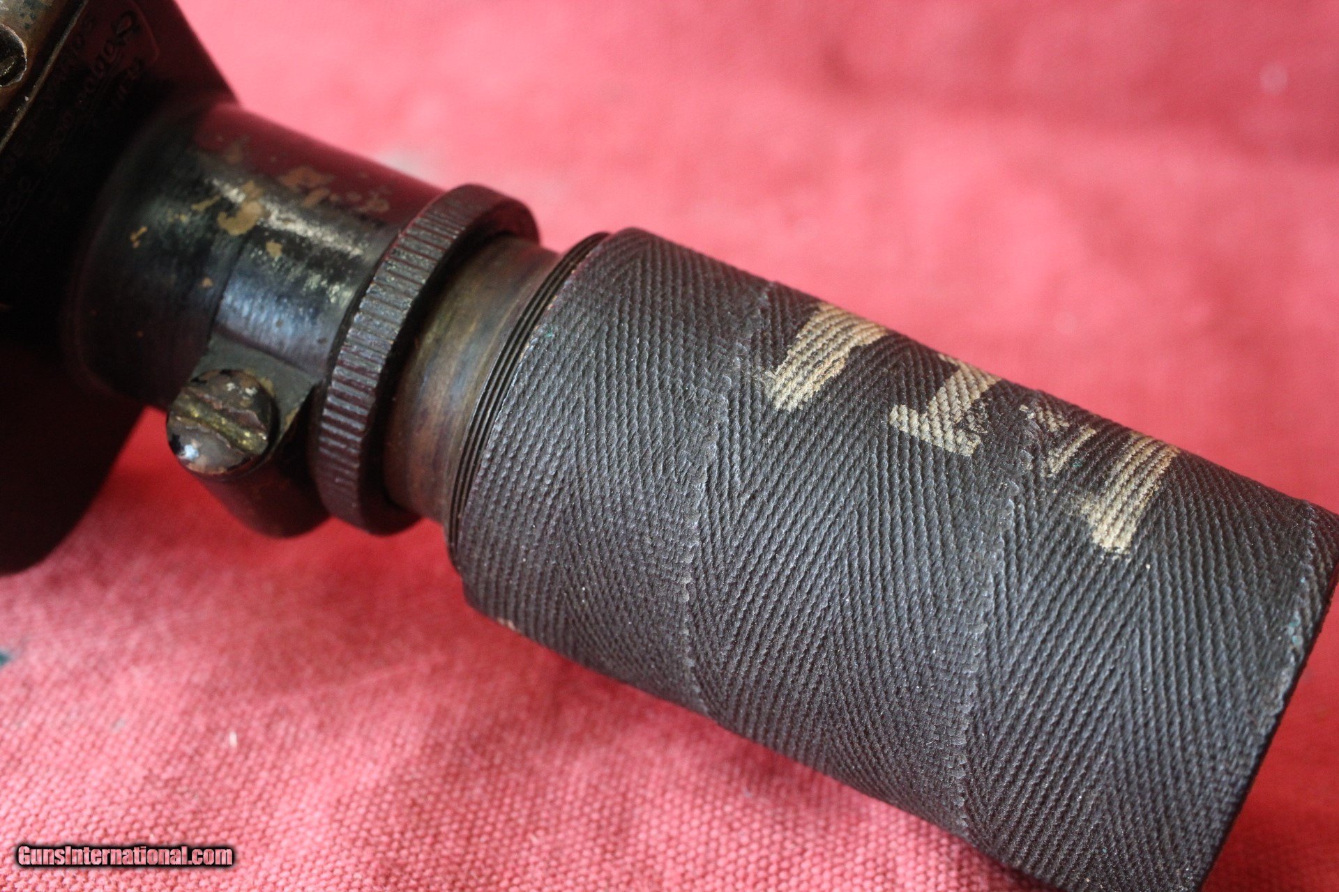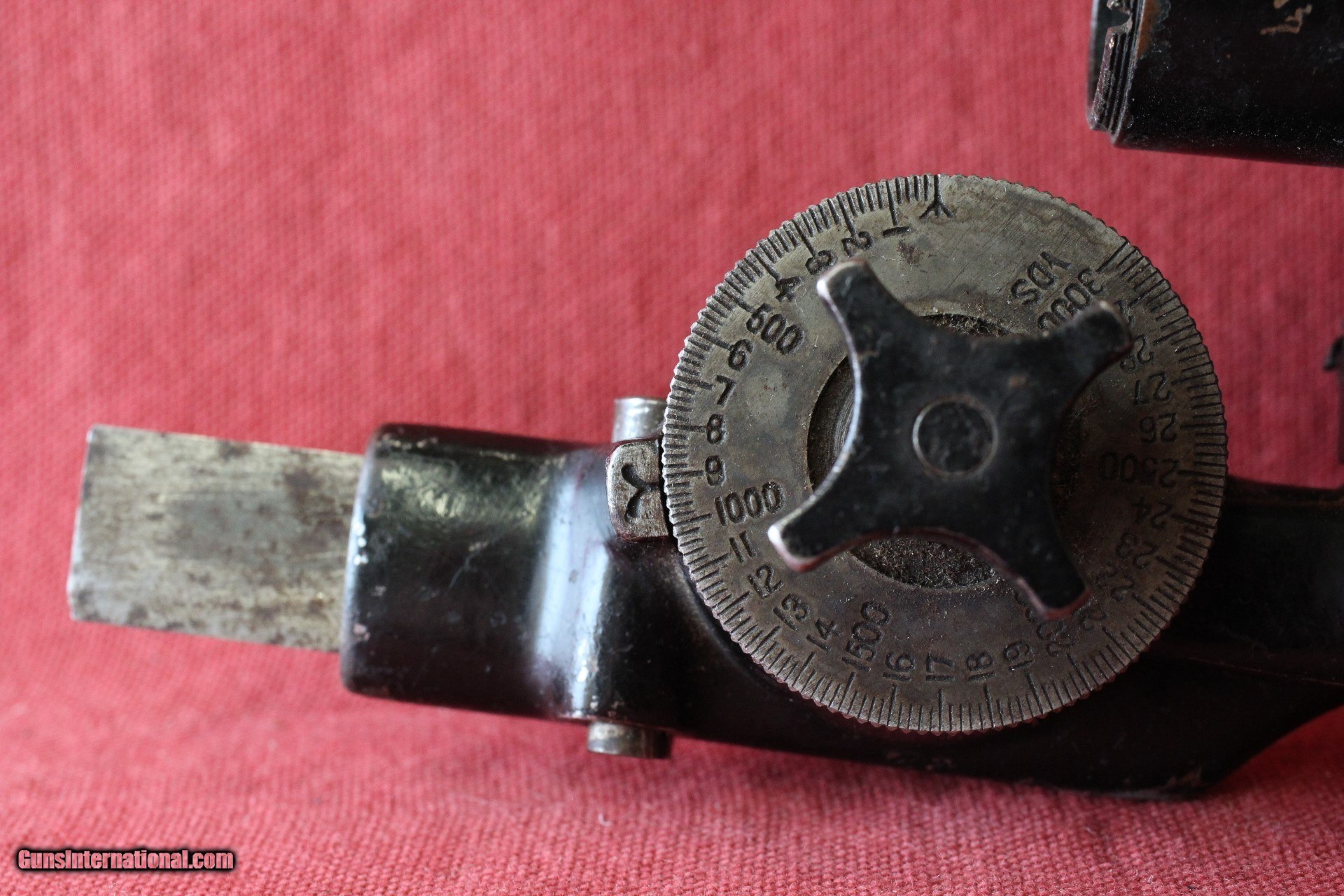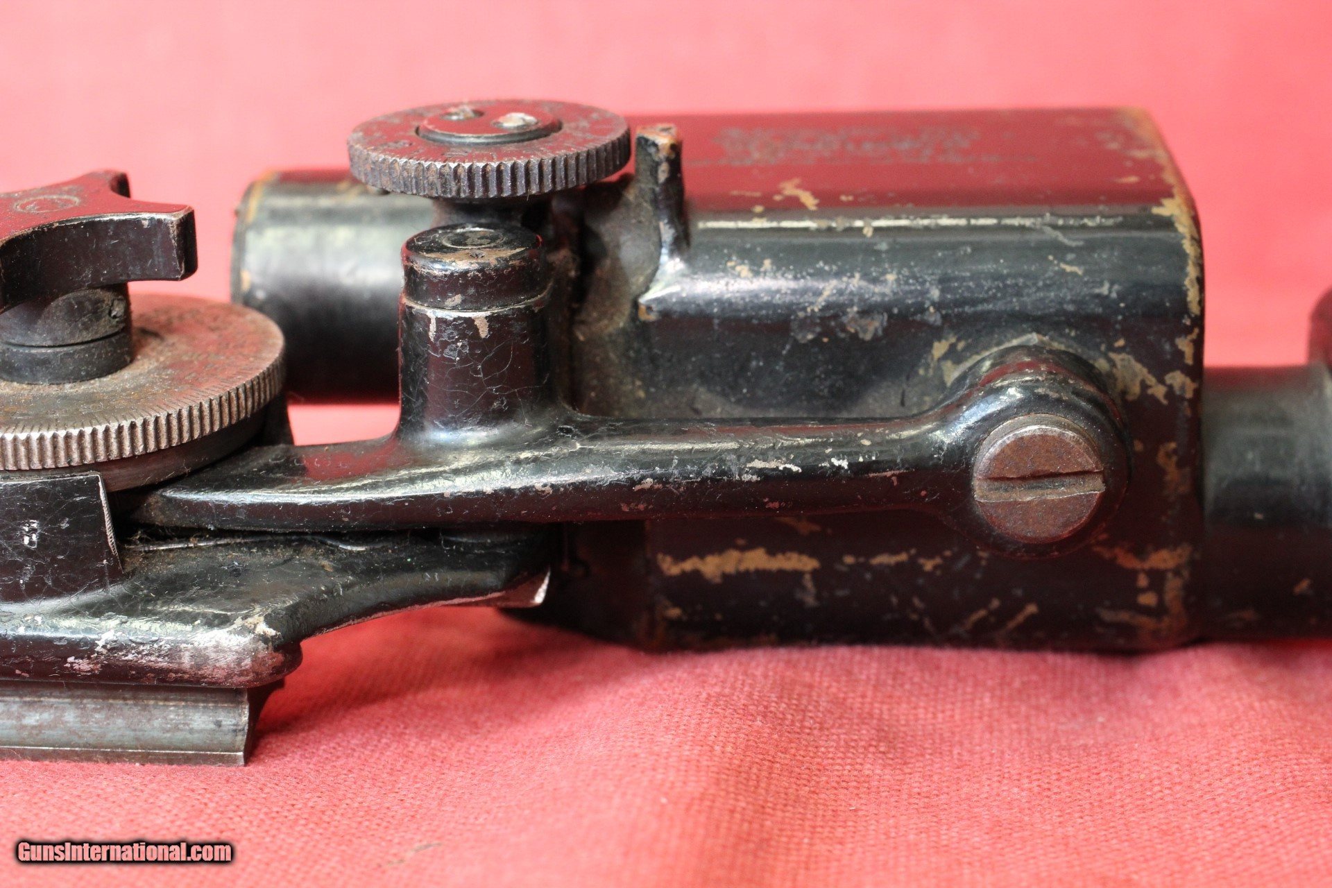 Description: Musket sight for 1903 Springfield. Serial number 60XX. Marked "The Warner & Swasey Co, Cleveland Ohio". Overall in good condition, shows age appropriate wear. Appears complete, including base for side mount on Springfield receiver. Incorrect eye-cup. Optics slighly yellowed with inner coating crackling/deteriorating. Comes with original leather case. More photos on request. SOLD AS-IS. Please add $30.00 for shipping and insurance. SOLD |