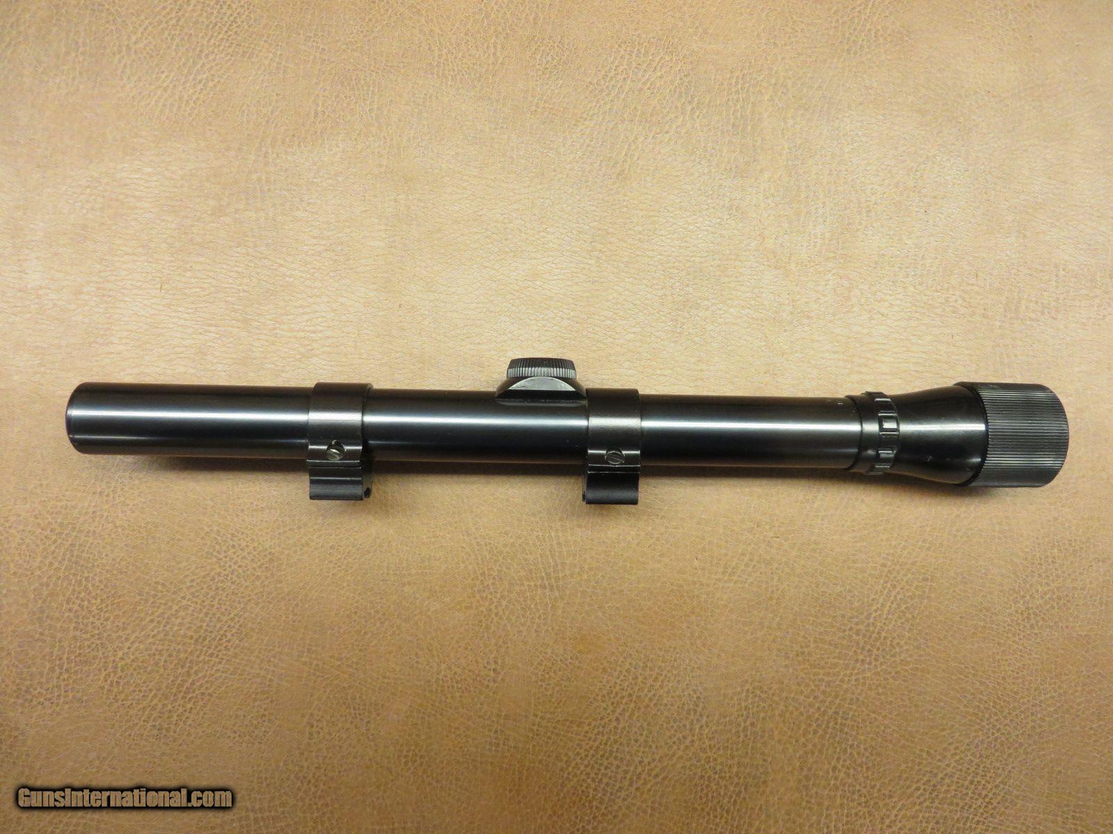Description: American made 4 power 7/8 inch steel tube scope with standard crosshair and rings for mounting on a grooved .22 receiver. 98% condition. SOLD |