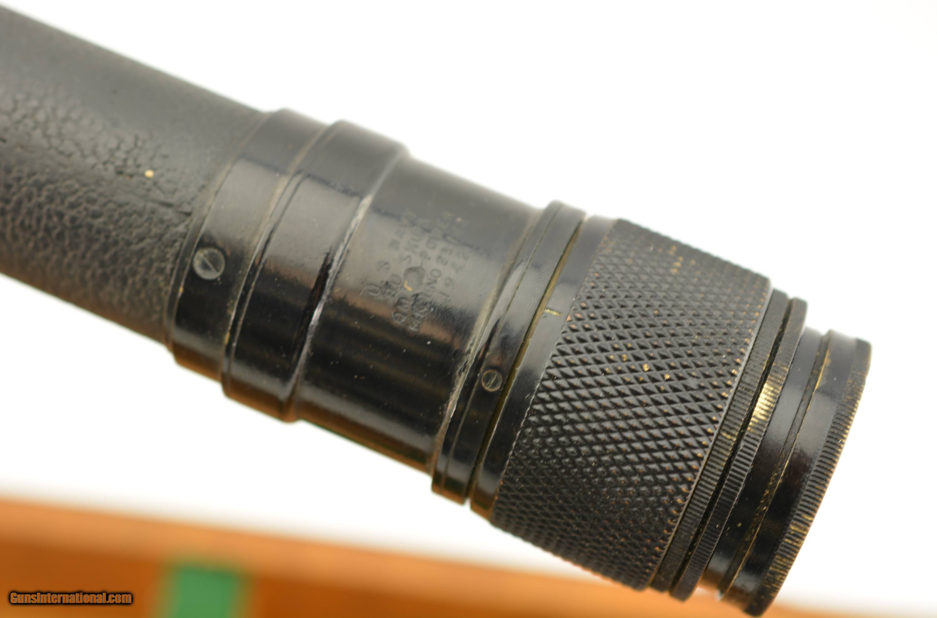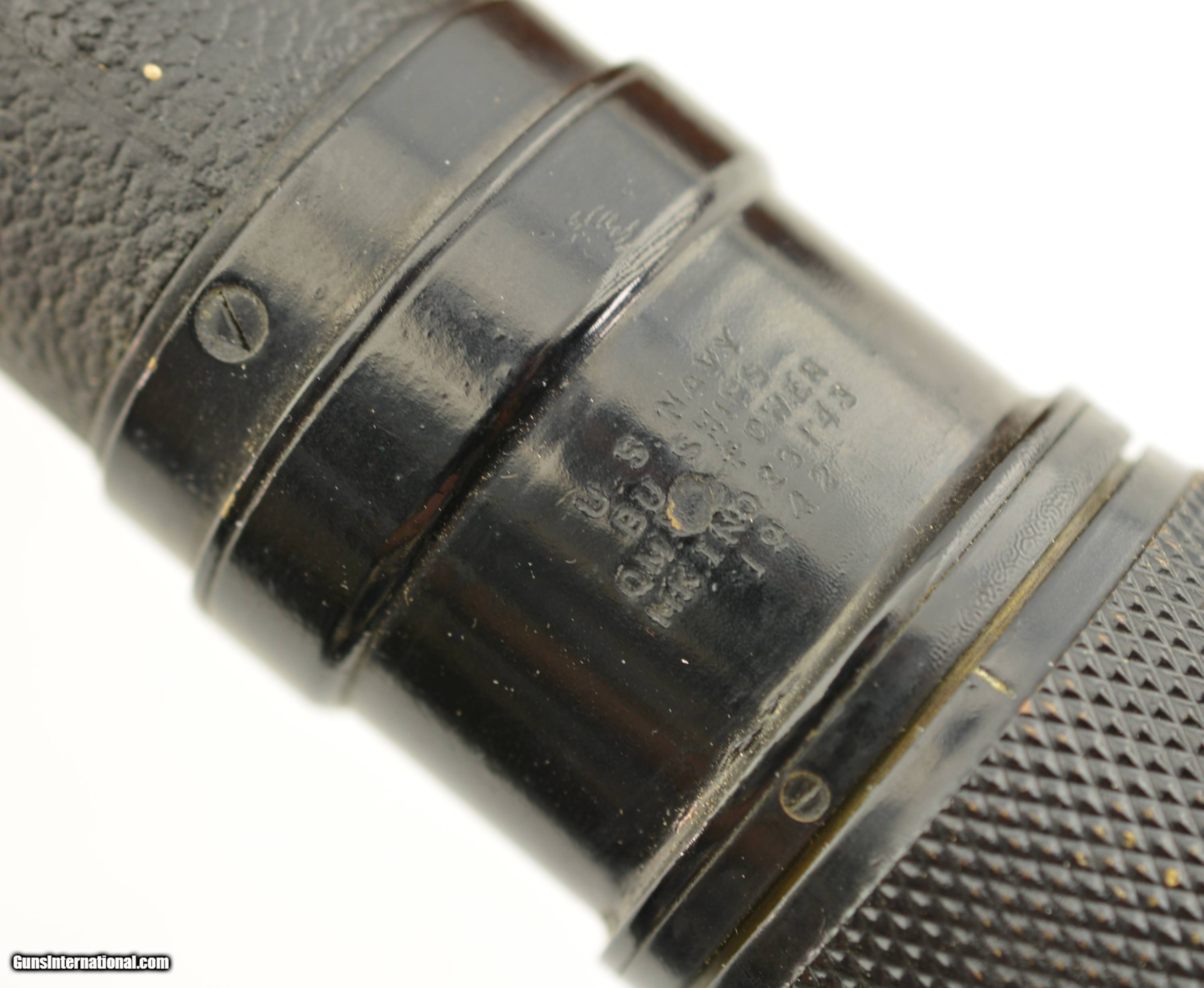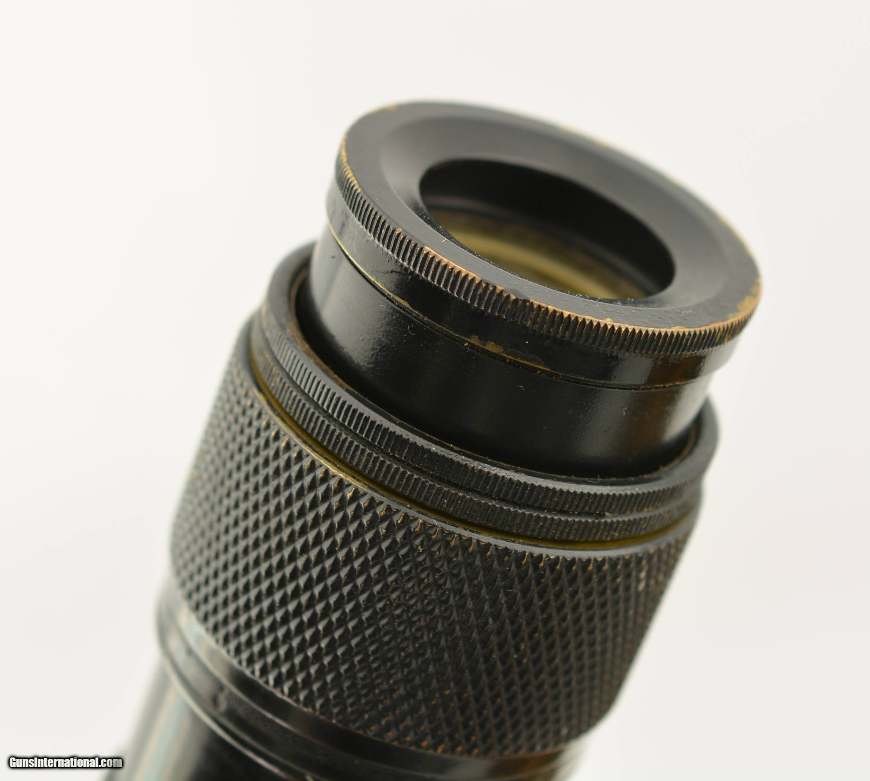 Description: 1942 WWII 25 Power MK I Navy Observation Telescope, eyepiece engraved "US Navy BU Ships, QM. Power, MK I, no. 23143, 1942." 31.5" Long. Rare power variant, only example I could find. All matching numbers on other parts. Leather cover in excellent shape. Bright and clear optics. Stamped U.S. NAVY 25 POWER on metal band in center of the scope. In the original oak case, no front metal plate. SOLD Manufacturer: US Military |