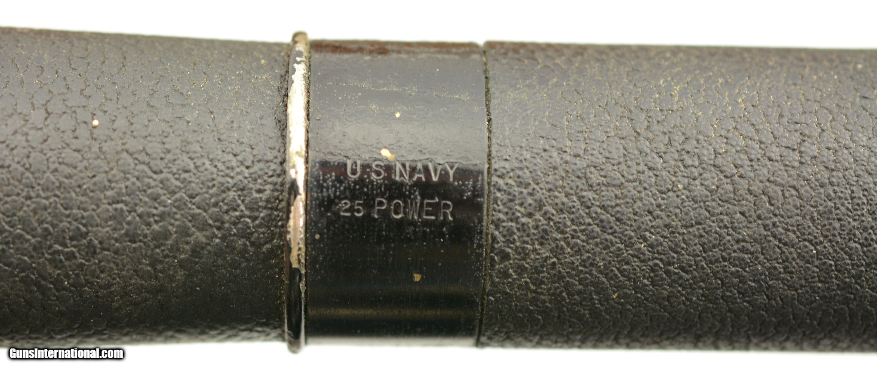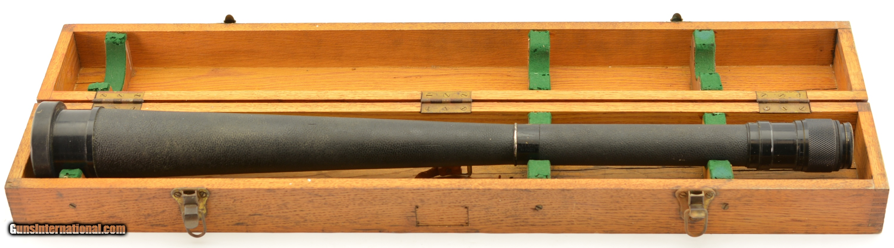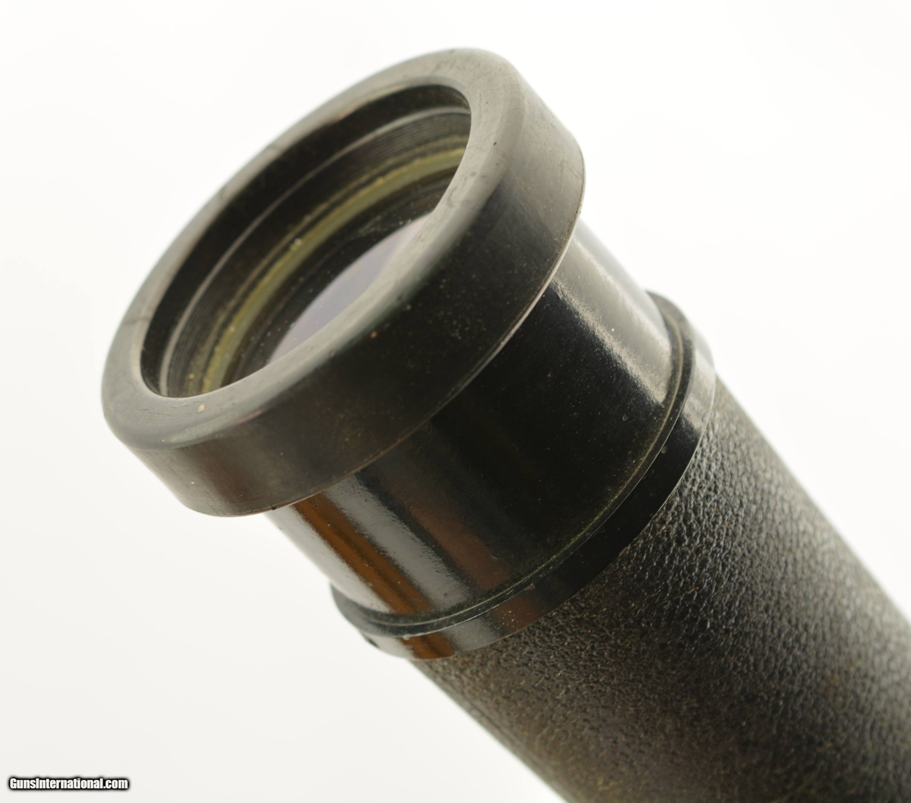 Description: 1942 WWII 25 Power MK I Navy Observation Telescope, eyepiece engraved "US Navy BU Ships, QM. Power, MK I, no. 23143, 1942." 31.5" Long. Rare power variant, only example I could find. All matching numbers on other parts. Leather cover in excellent shape. Bright and clear optics. Stamped U.S. NAVY 25 POWER on metal band in center of the scope. In the original oak case, no front metal plate. SOLD Manufacturer: US Military |
