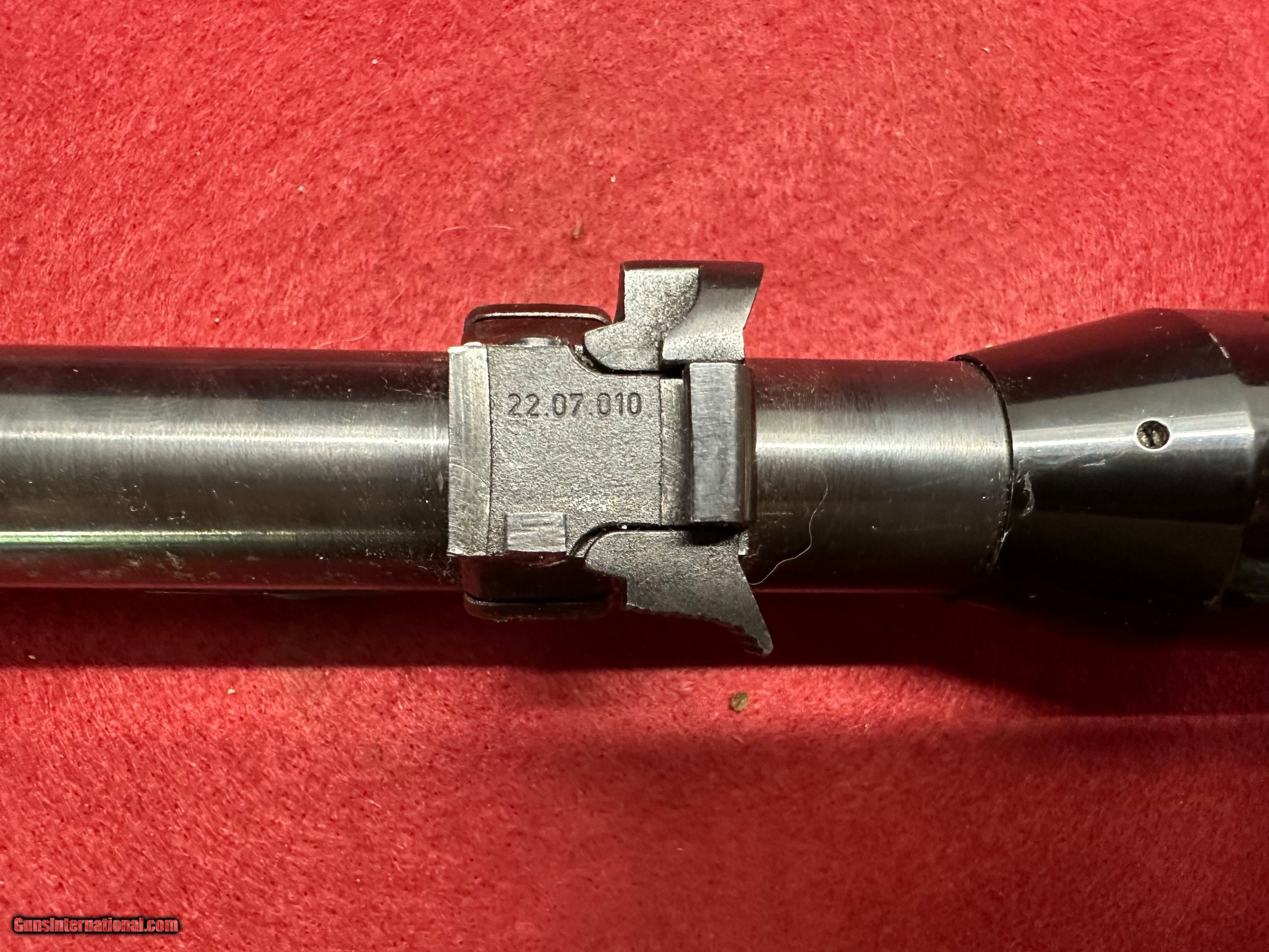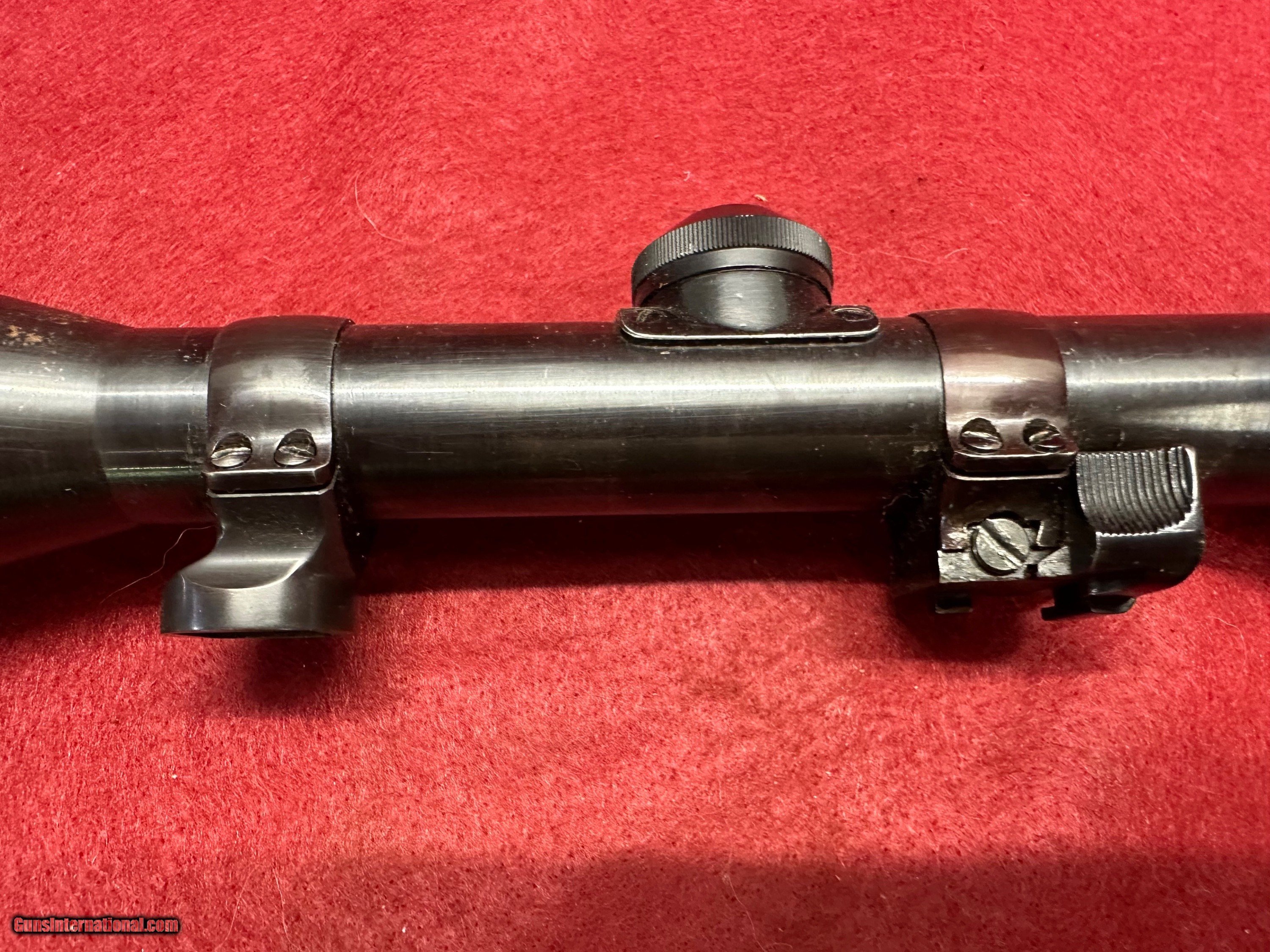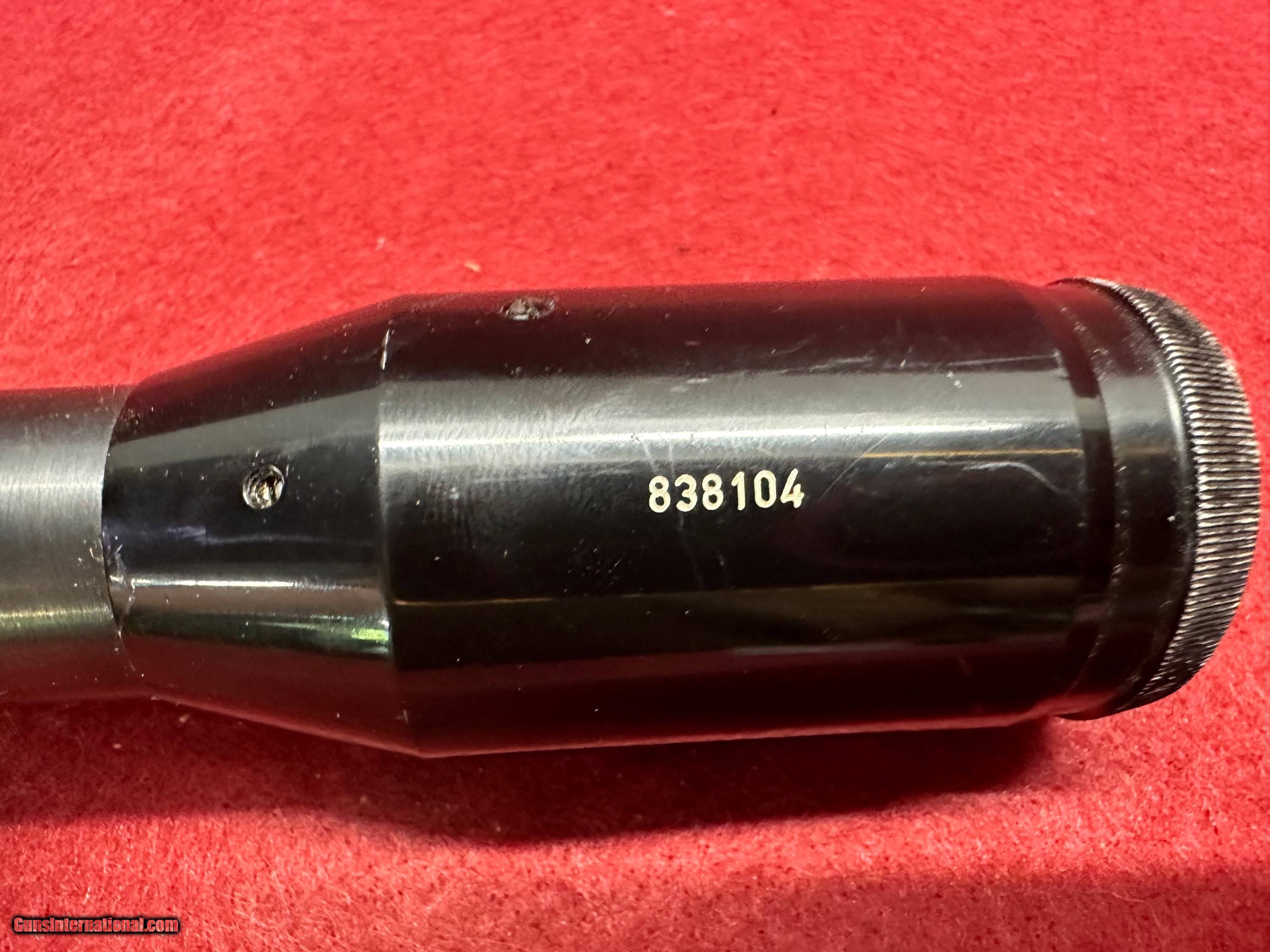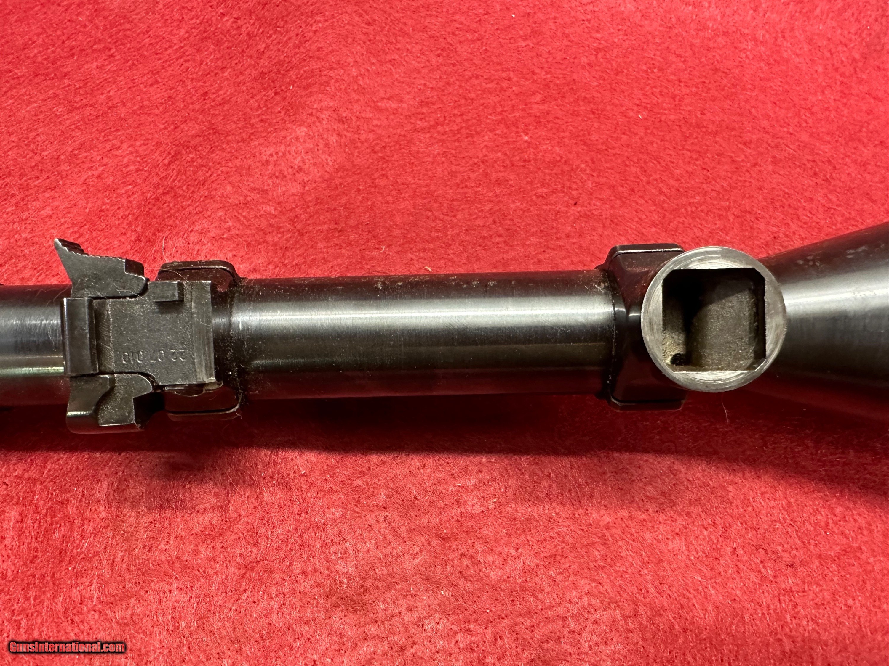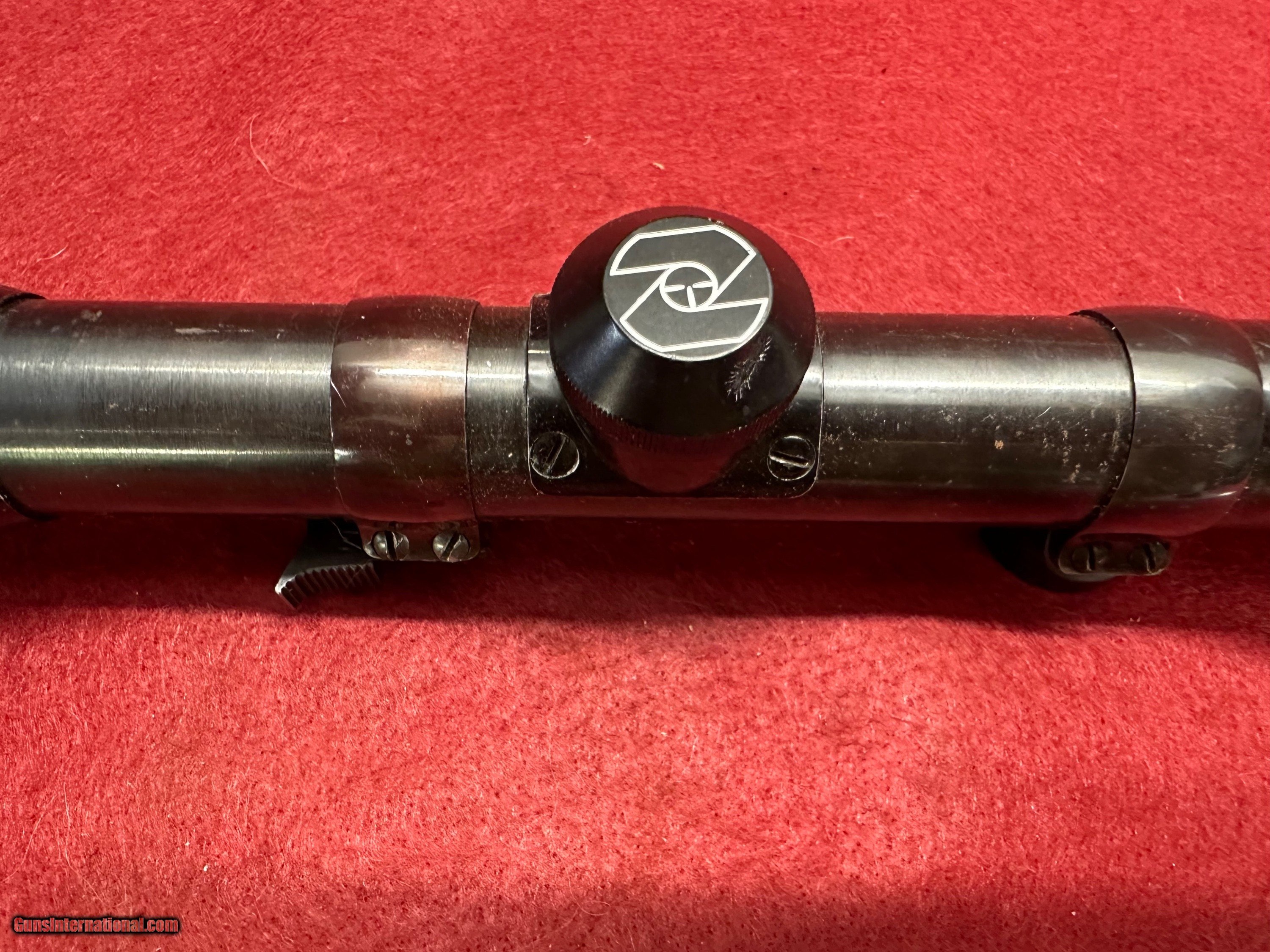 Description: Carl Zeiss 8x52 Scope with Rings and QD Tip off bases. THe bases were on a 3/8" dove tail that was drilled and Tapped. Probably will need to be properly fitted to your rifle. It has a German # 1 style reticle to look through the scope it has a crystal clear field of view. It does have wear and scratches on the outside of the tube from use. it looks to also have a few dots on the inside of the glass on the front objective. Price includes all shipping and CC fees. SOLD |