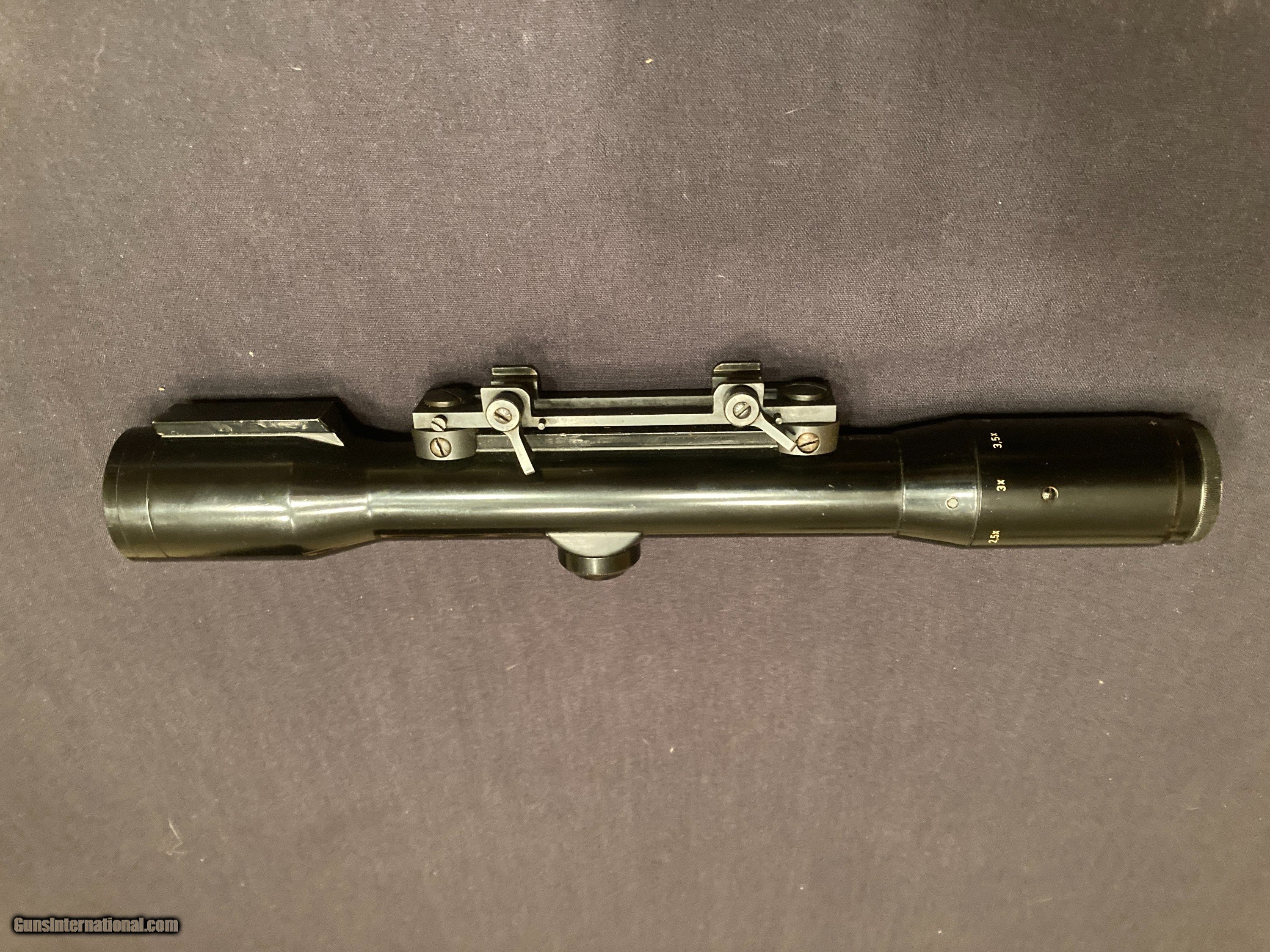Description: made in Germany, 30 mm tube, the eyepiece turns to the left to increase the power and clicks into place for each half power, a focus on the eyepiece, standard straight crosshairs, visibility is crystal clear, the base is made to attach to a 5/8 inch flat front and rear bridge, such as Krico and other German rifles $25 shipping SOLD |