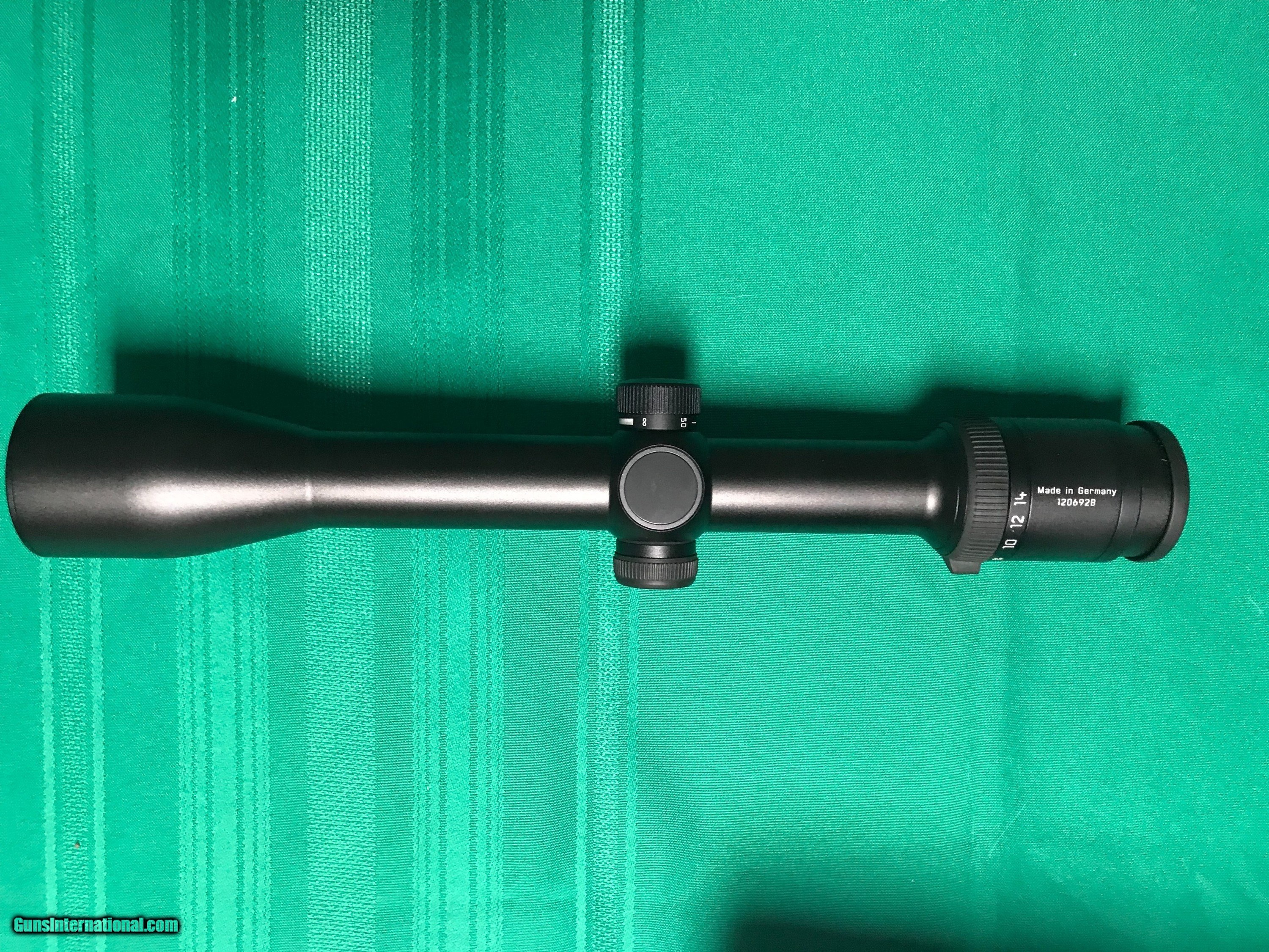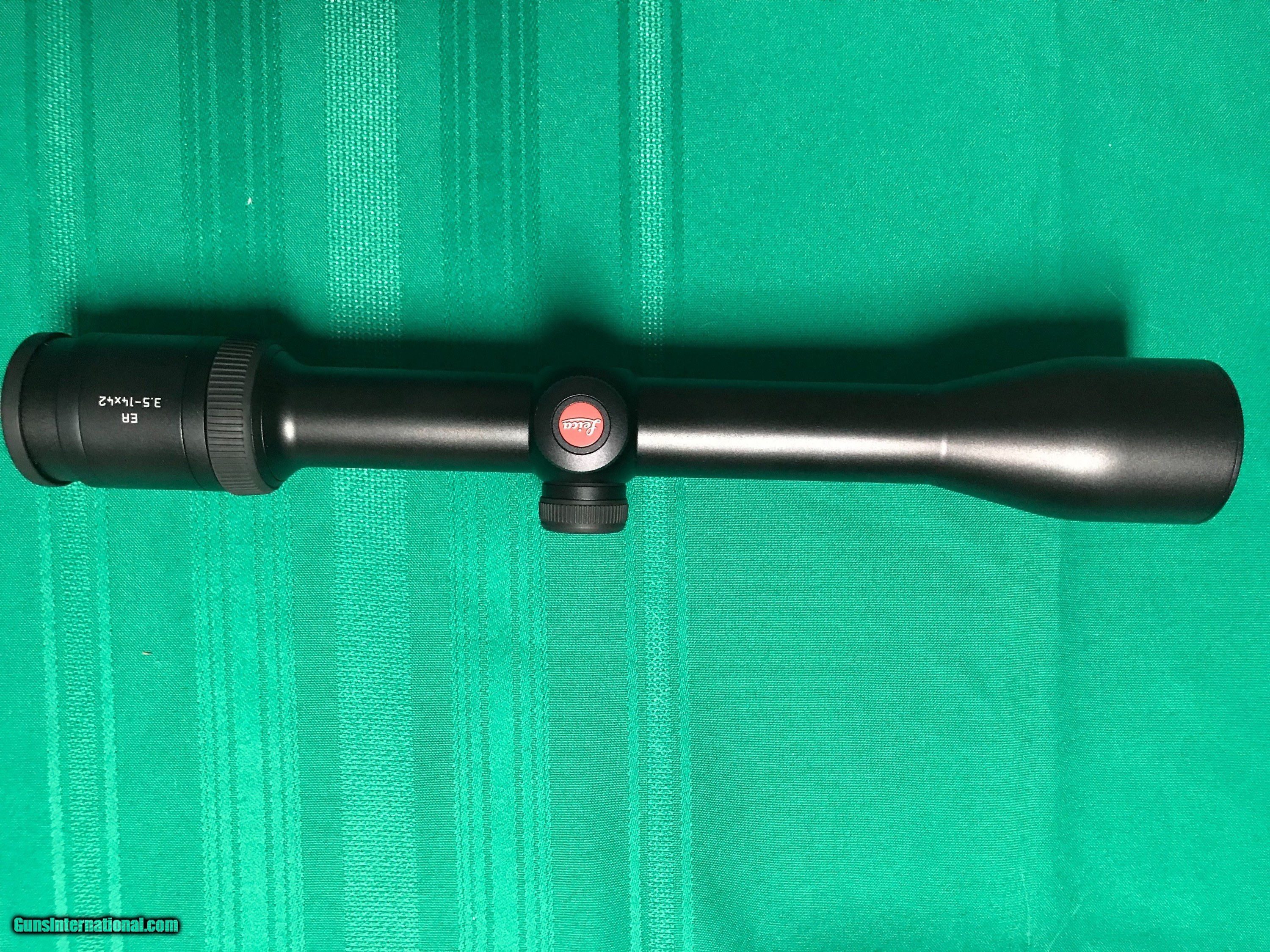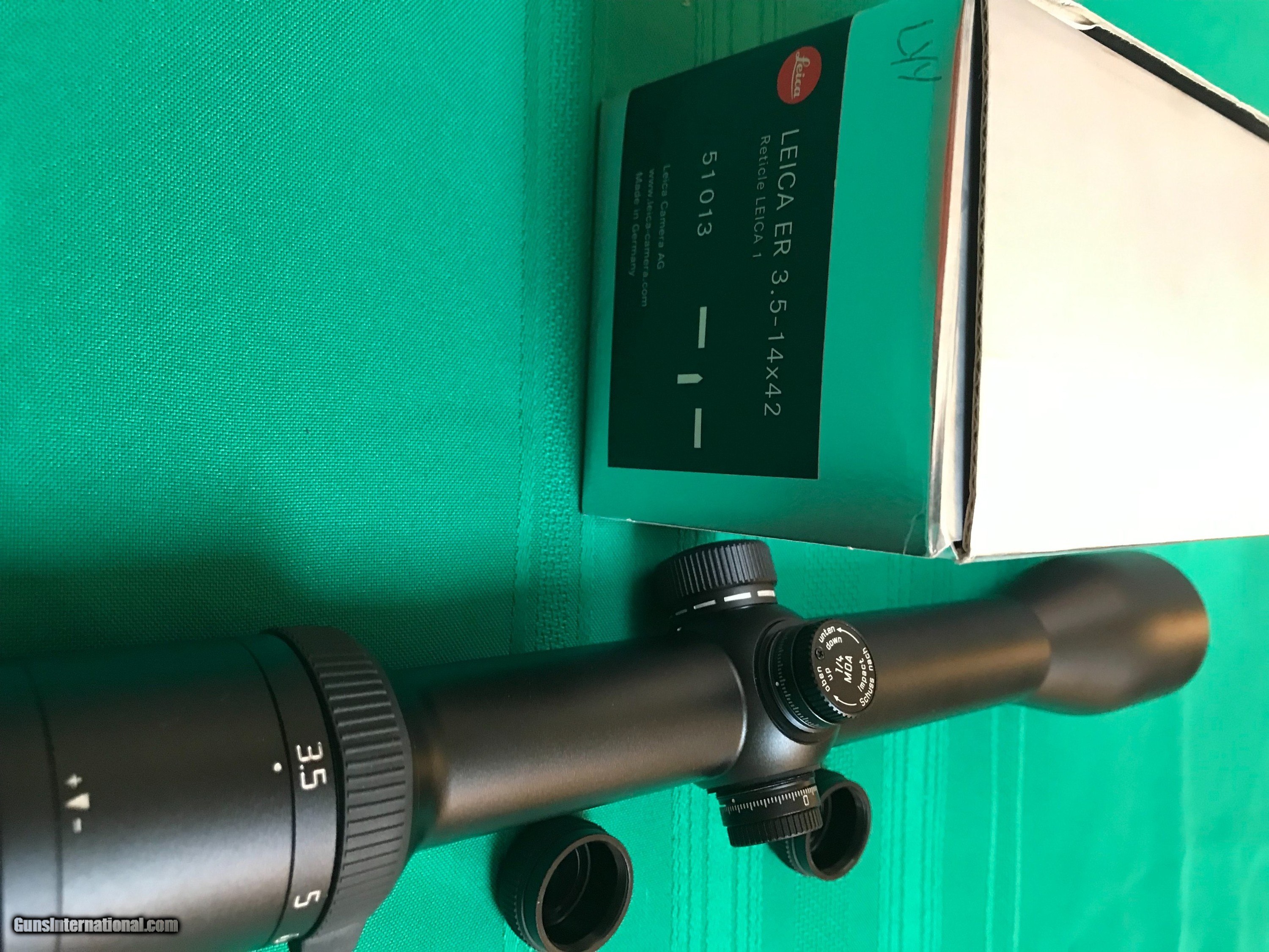 Description: Leica ER 3.5-14x42 is ANIB. I purchased this as a DEMO scope from SWFA several years ago. It has been in my safe from day1. This one has the #1 Reticle as shown on the boxalong with some parallax adjustment . The lens have Leica's Aqua Dura coating. The turrets are 1/4 MOA. I had intended to use this on larger caliber rifles due to the long 30mm mounting tube and the 4' of eye relief. A. SOLD |
