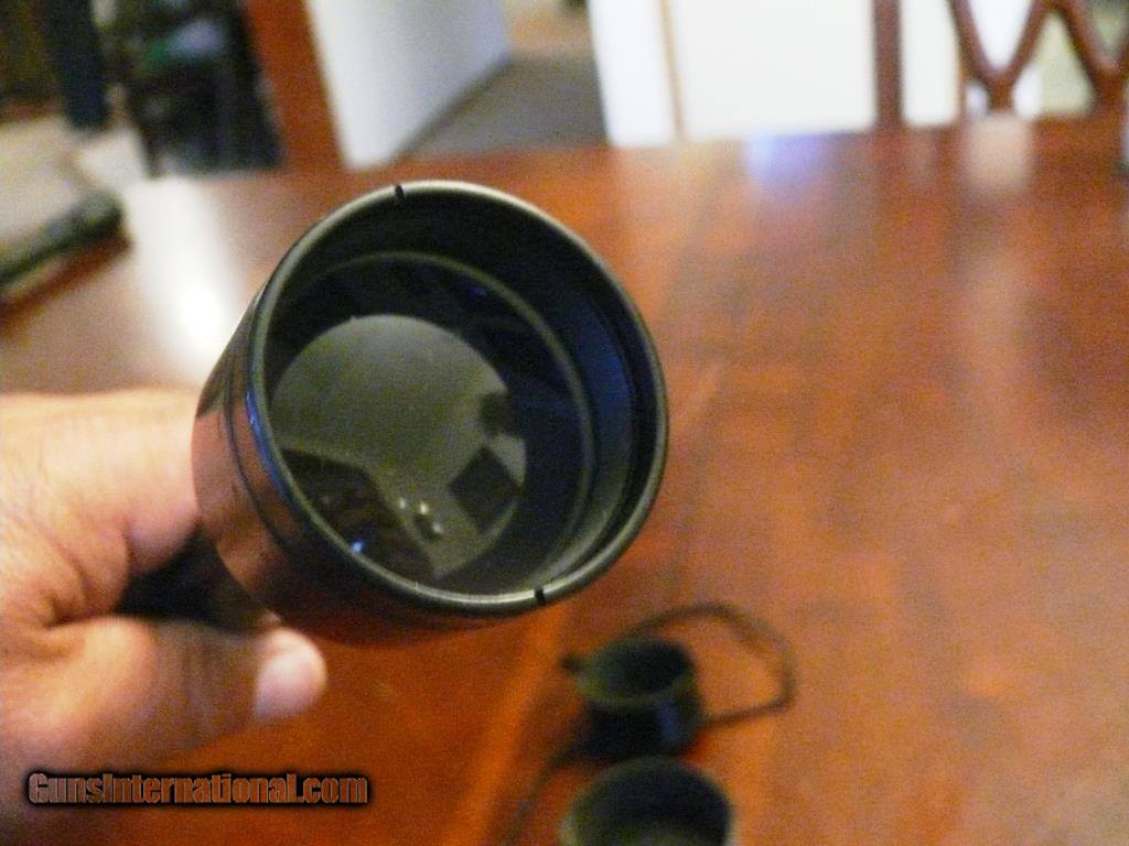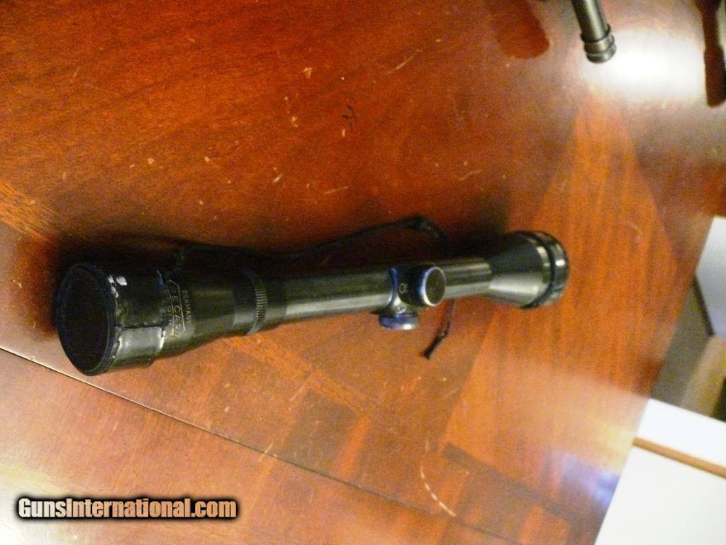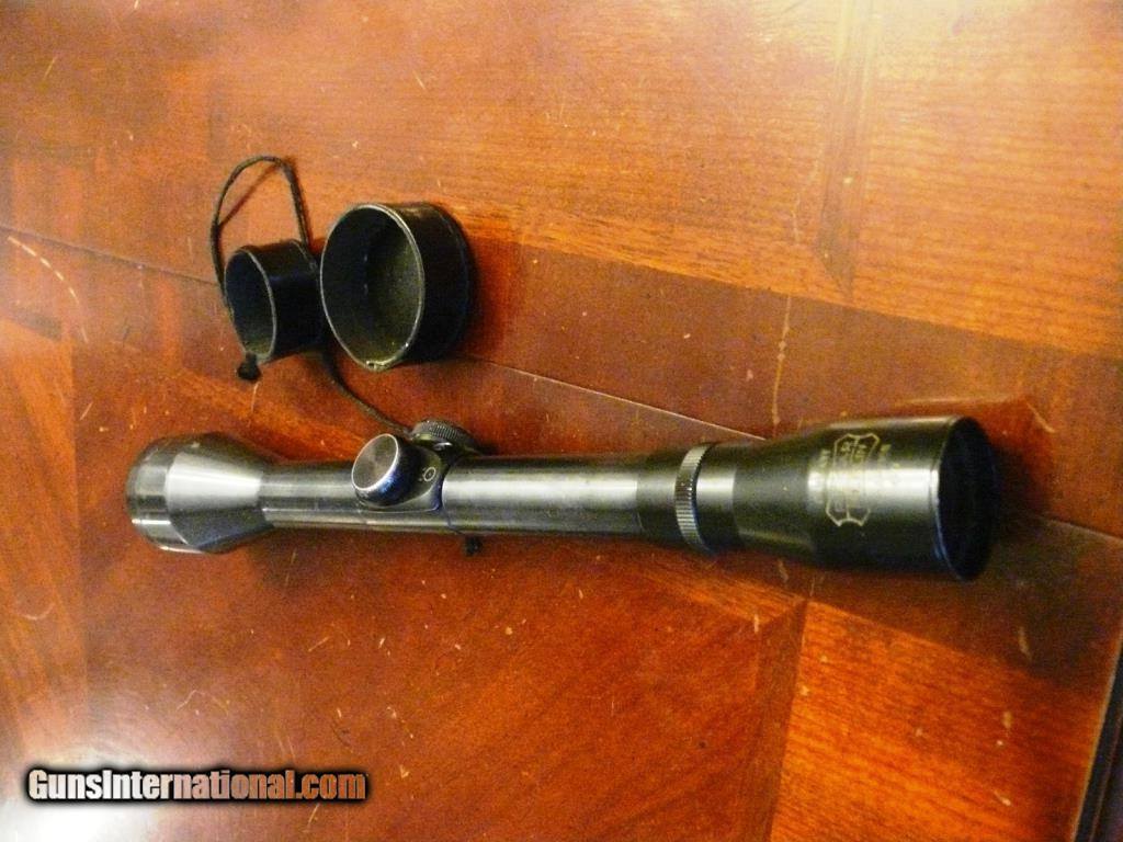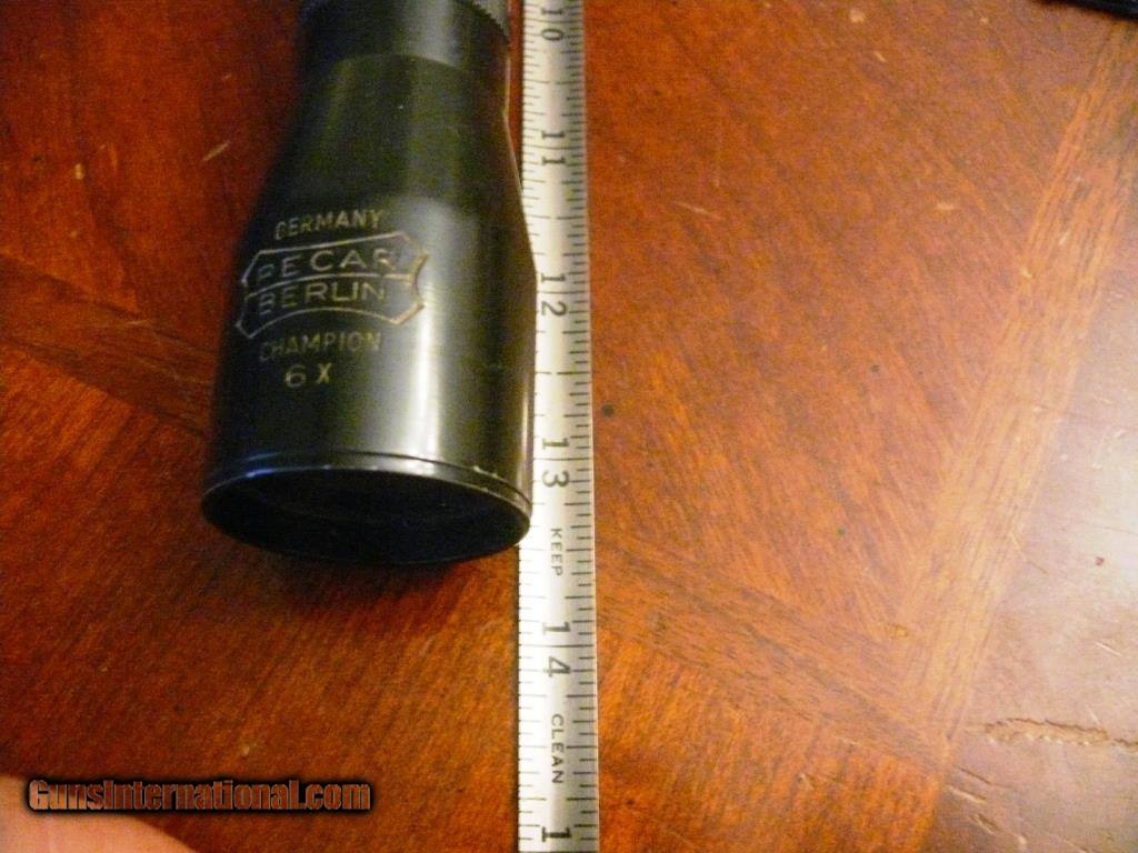 Description: Sold// I think this was one of the last of their product lines before Pecar of Berlin closed their doors forever. The Champion series featured an inter-changeable reticle that also stayed centered in your field of view. The scopes are well made and they also gather a lot of ambient light useful in the early morning hours or early evening hours. The reticle in this scope is a heavy single pointed post. If you watch carefully, you can find other reticles for sale on the other well known global s. Length of the scope is 13.5". The original leather lense caps are there but the elastic band between them needs to be replaced. 26 mm steel tube that was blued, and not painted or dipped. SOLD |