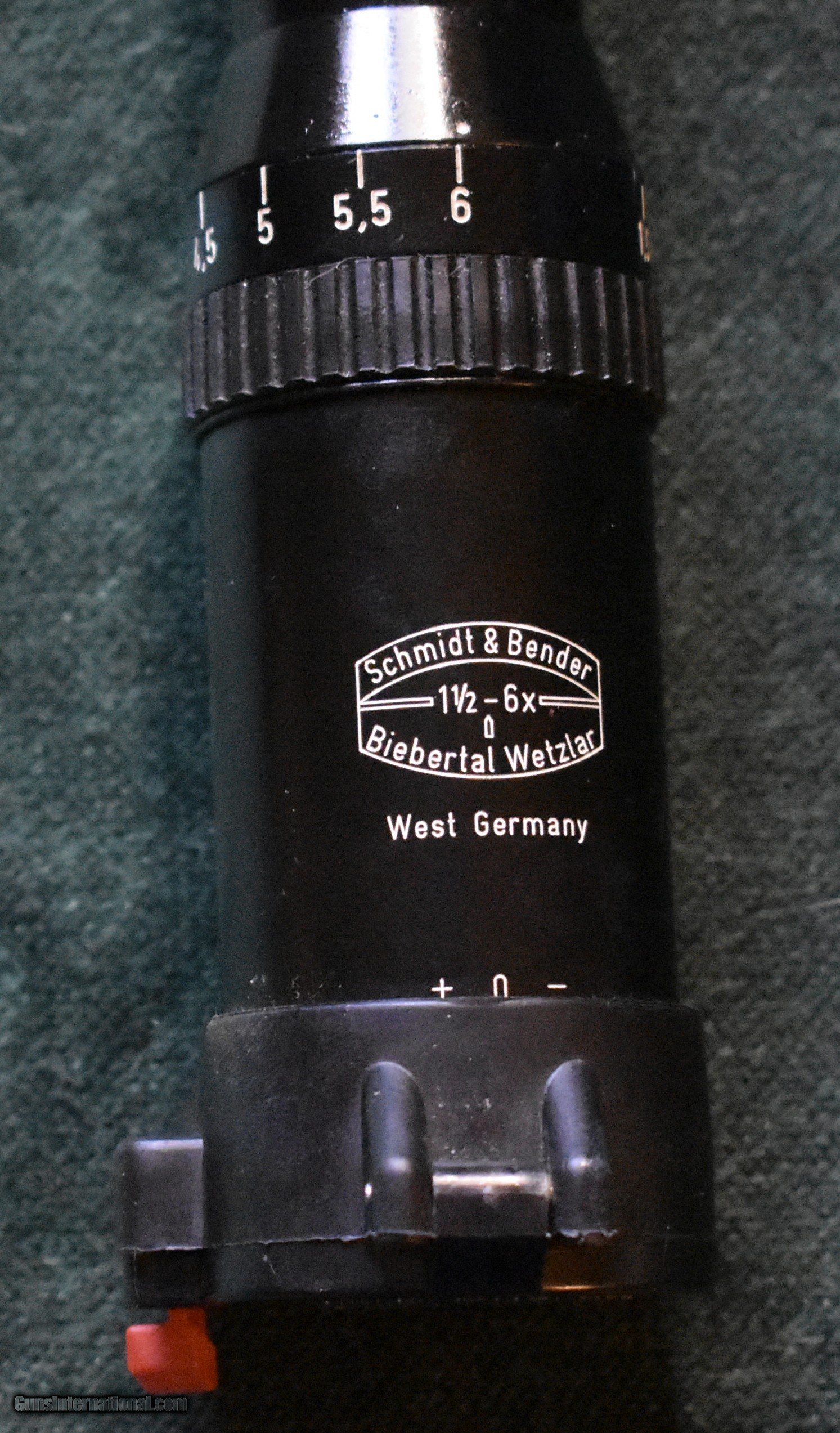 Description: Schmidt and Bender 1.5x6 steel tube rifle scope. Built in West Germany, this scope is in excellent condition. The tube has faint rings marks but otherwise the scope is unmarked. It has the 4A reticle with 3 heavy crosshairs on the side and bottom and the thin verticle. The optics are extremely bright and clear. In my opinion S&B scopes are the best in the market. New ones like this cost $2500. SOLD |