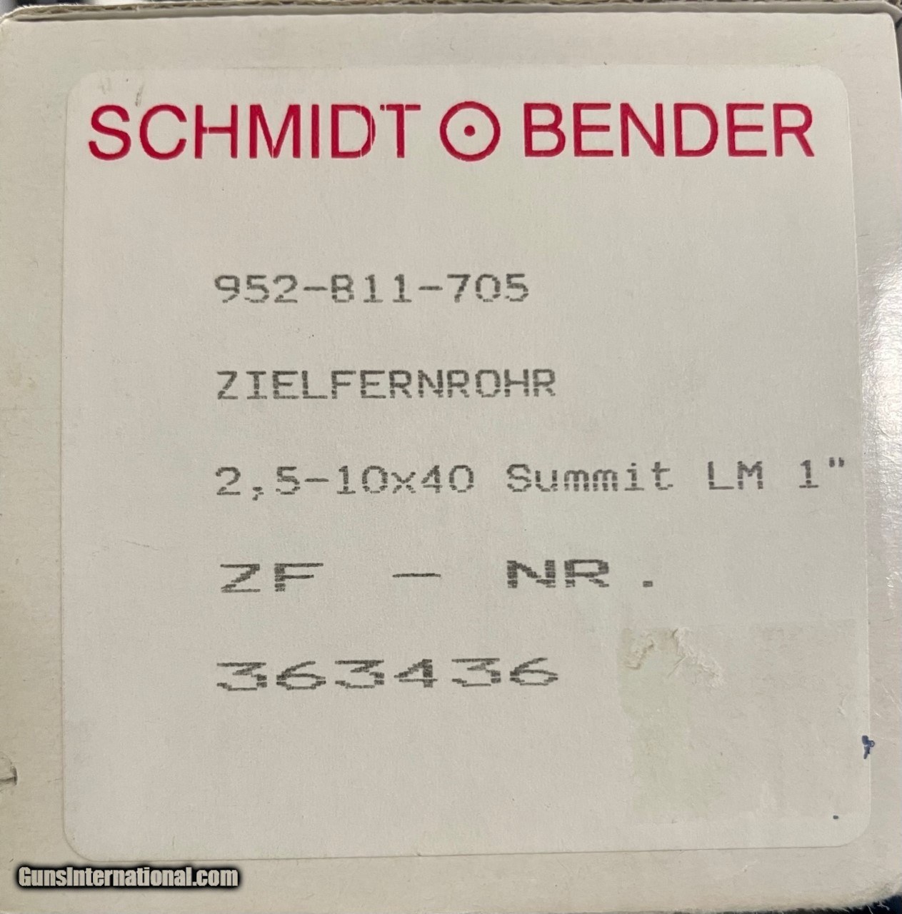 Description: Schmidt Bender 2.5-10x40 Summit, LM Reticle, 1 Inch Tube Scope, Second Focal Plane New in factory package. When hide hunting for wild boars at night and for every hunting situation suffering from poor lighting conditions, this scope is your ideal choice. The large lens diameter helps the scope to make the best use of the last remaining light. And many a hunter is surprised by the image brightness and contrast this scope generates, even in comparison to high-quality binoculars. Specifications: