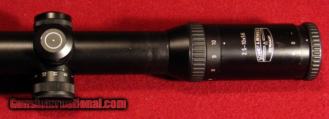 Schmidt & Bender 2.5x10x56 scope with No.7 reticle with heavy bottom and side posts with fine crosshairs and illuminated center . Optics are perfect. Has slight ring marks which are most prominant on the underside of the scope. Also has area of blue loss on underside of front bell where it appears to have rubbed on rear sight. This is straight up the ideal varmint hunting rig for twilight and night shooting. Priced way under retail.
