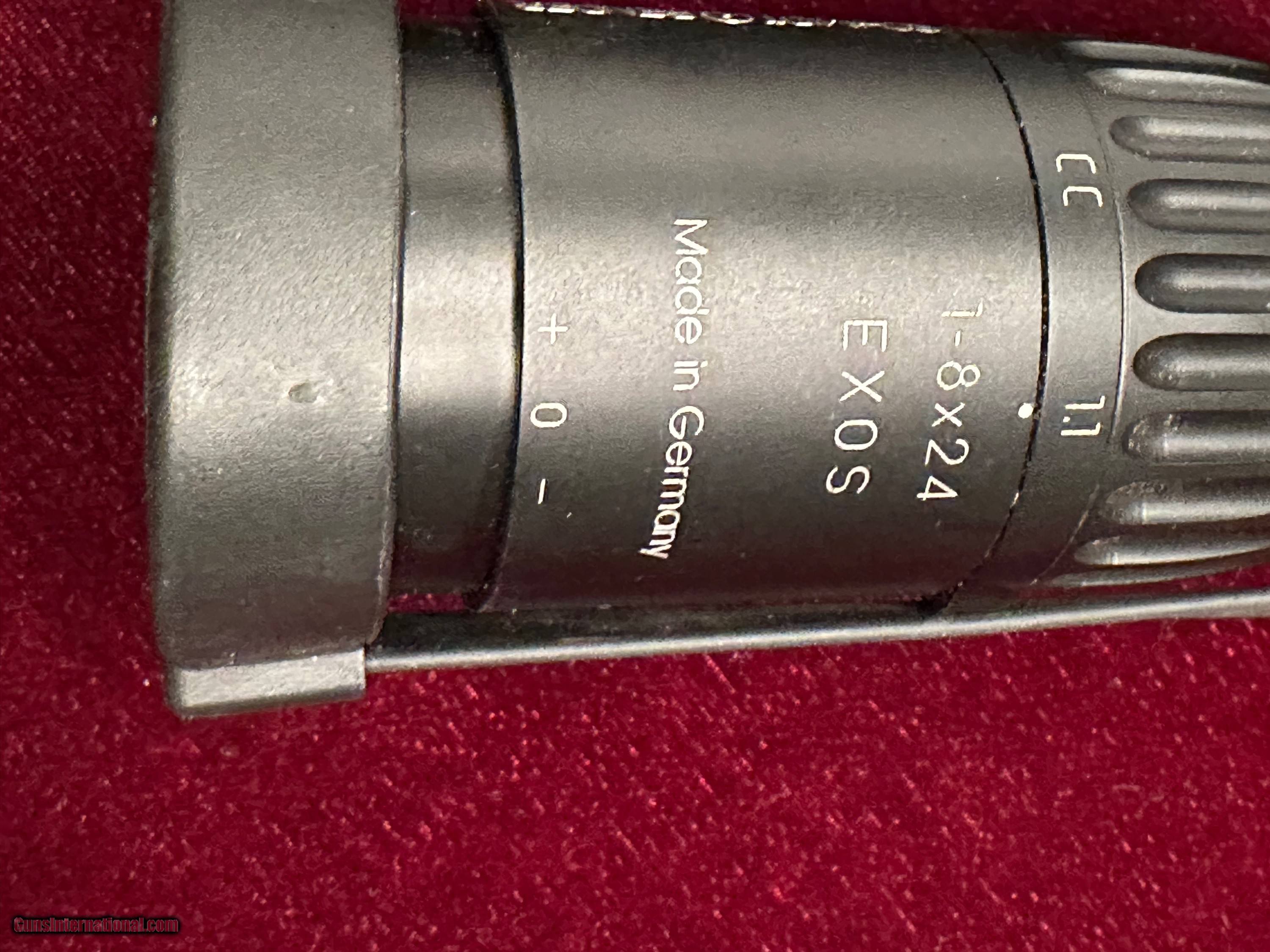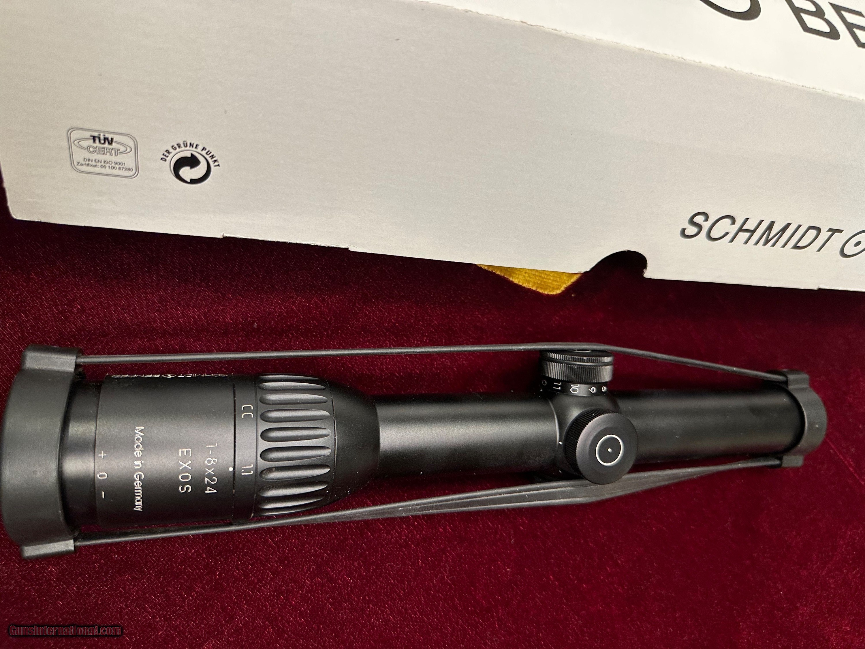 Description: ~New SCHMIDT BENDER EXOS 1-8X24 LM FD7 with all items, box ,paperwork, scope covers. Flash dot illumination, second focal plane. Can use scope with both eyes open on low magnification. Slightest of ring marks from when it was professionally mounted by ACGG rifle builder. Never was on a rifle when fired. Recent EUROOPTIC purchase. SOLD |