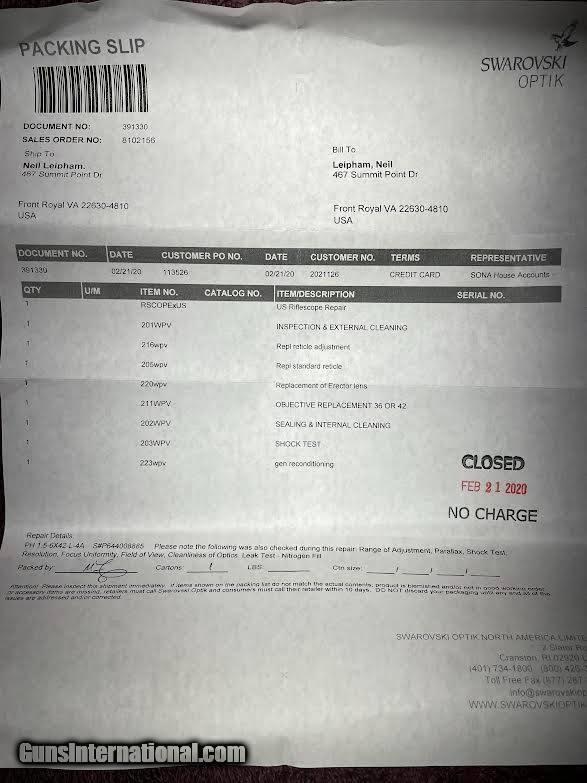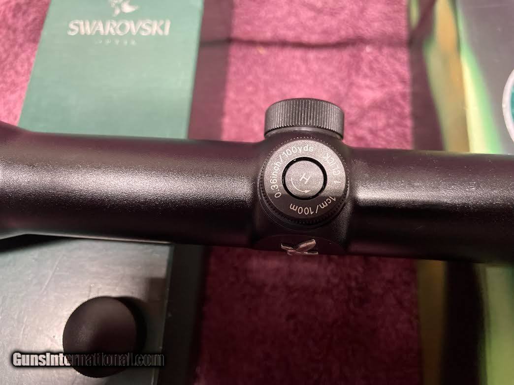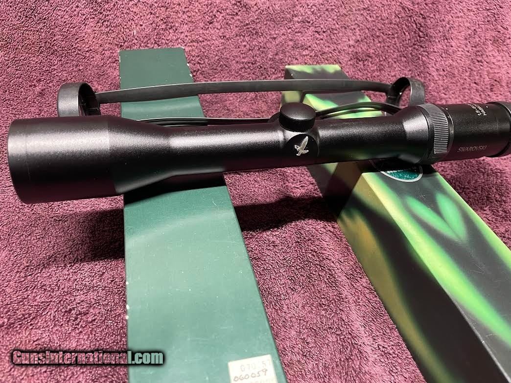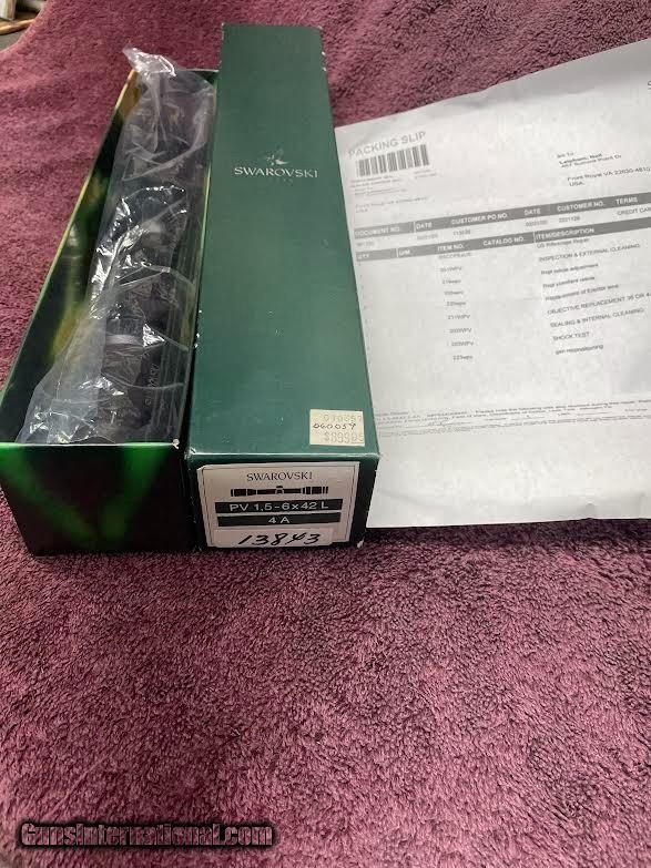 Description: For sale Swarovski Habicht 1.5-6 x 42mm obj. 30mm tube, w/4A reticle in first focal plane. (Cross hairs get larger as you turn up magnification) great in low light conditions. ( Picture of reticle is set on 6x) Twilight Factor: 1.5X = 7.9, 6X = 15.9. Four point coil spring suspension ensure shock resistance with high calibers. Water Proof & Fog Proof, Zero setting adjustment system, Ocular Lens/eyepiece spring loaded w/rubber guard. Length 13", Wt. 15.7 oz. In 2020 Swarovski did a complete reconditioning on this scope (see attached work sheet). Has been in gun safe since. (light marks on tube, see pics) Payment: USPS Money Order, Buyer pays shipping SOLD |