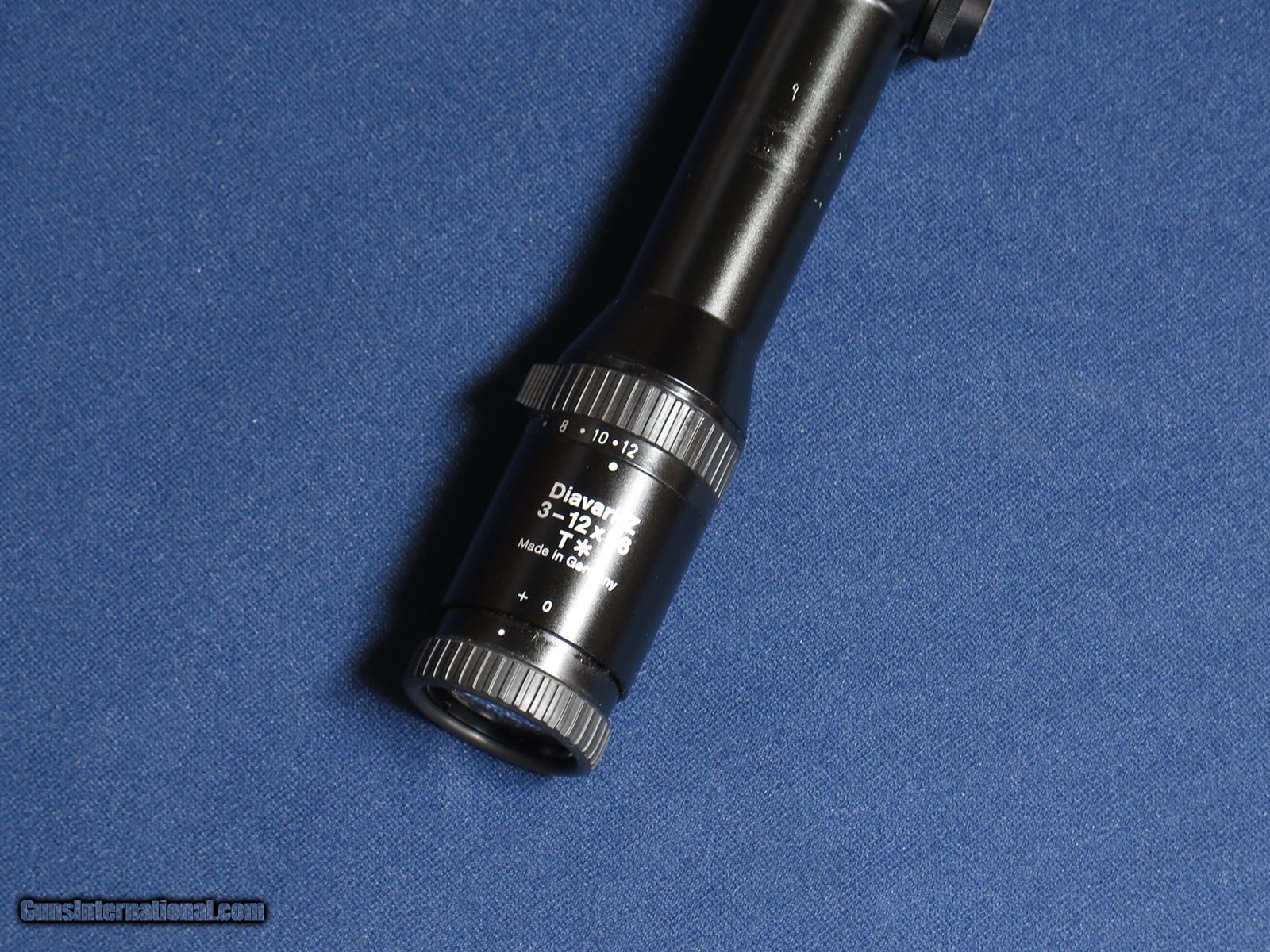 Description: Zeiss Diavari-Z 3-12x56mm. T*. Made in Germany. 30mm tube. Wide post reticle with horizontal cross hair. Shows ring marks but optics are clear. SOLD |