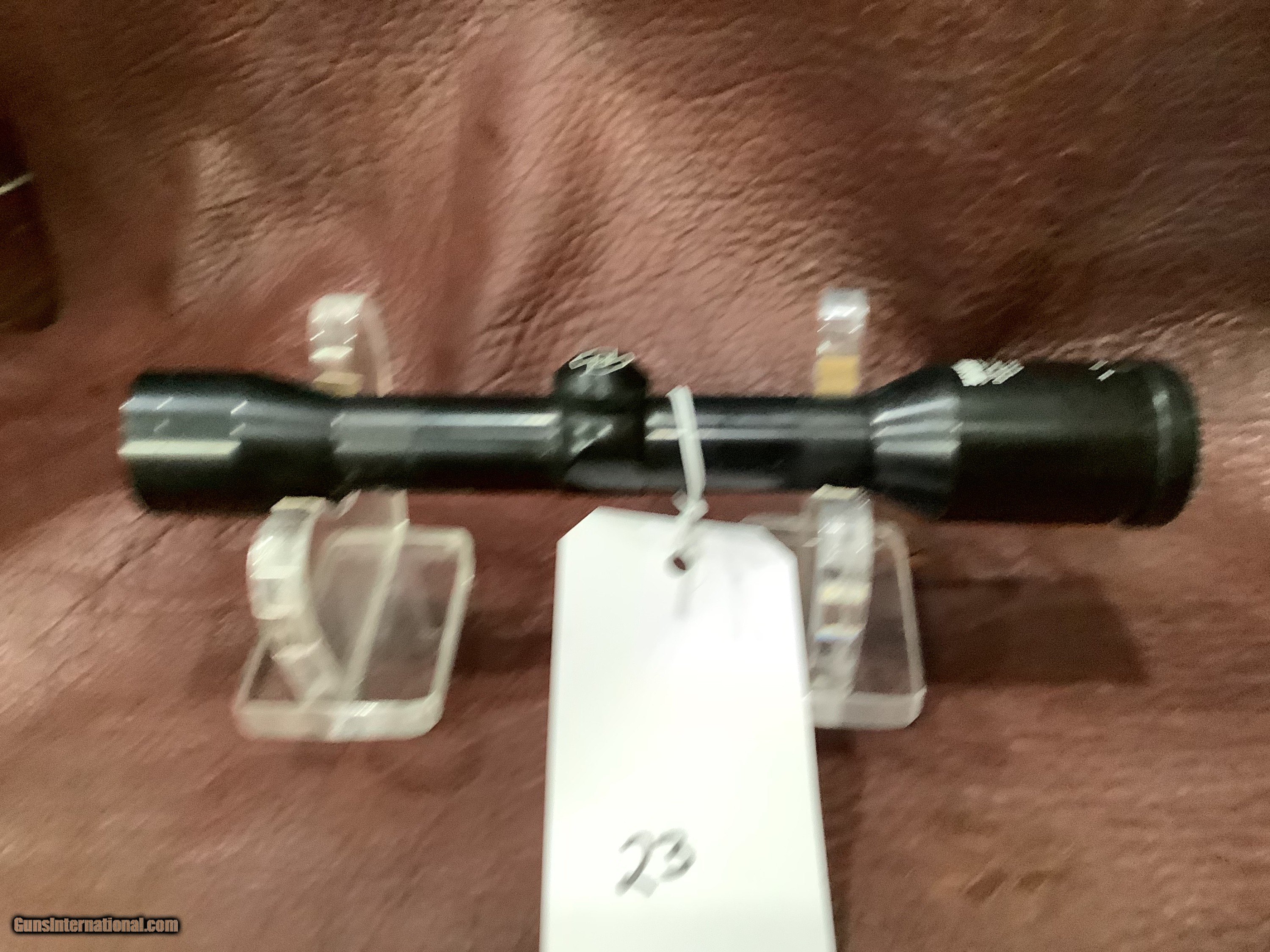 Description: Ziess Diatal 4 X 32 scope with a 32mm bell and 1" tube. It has a number 4 style reticle and ring marks. Excellent optics SOLD |