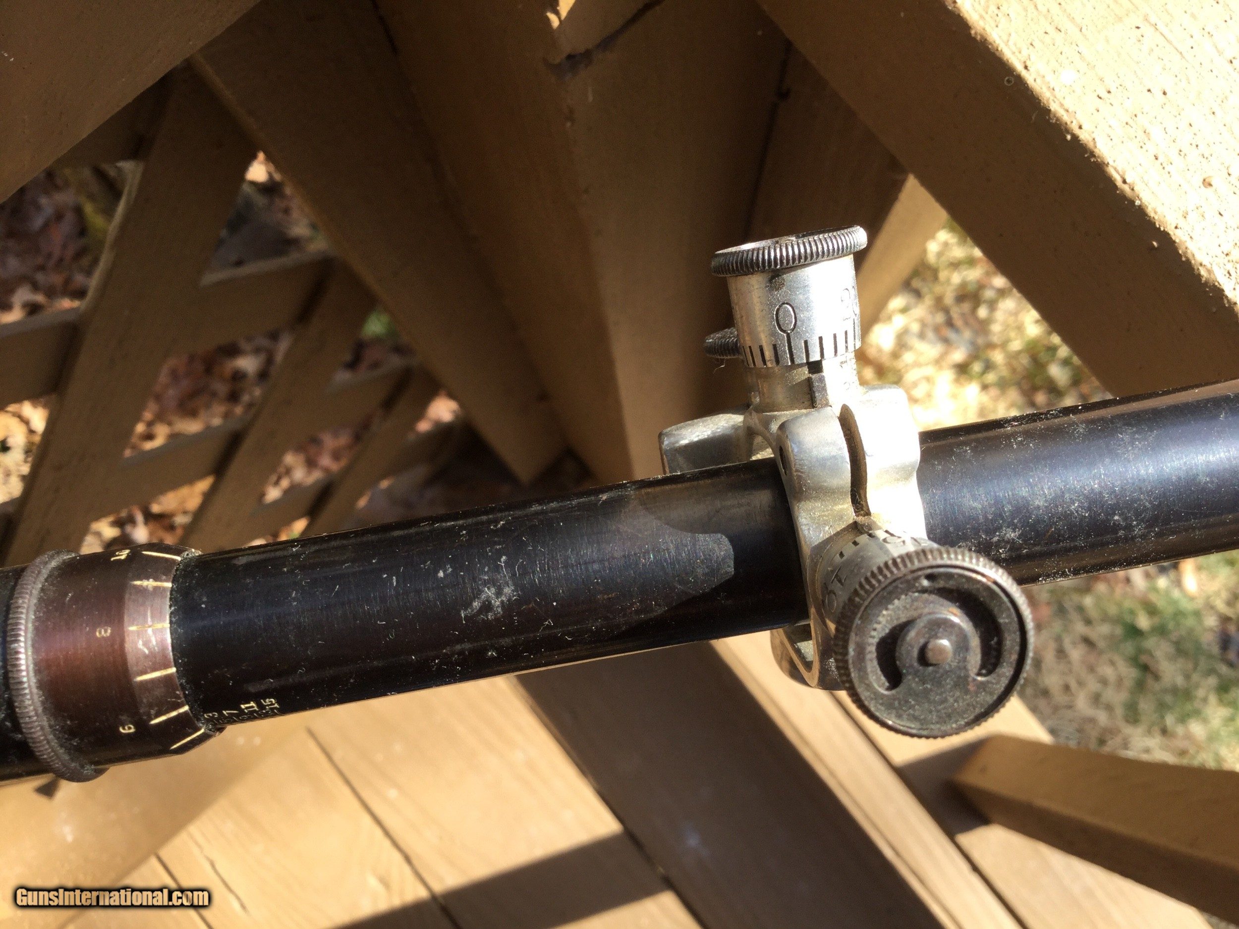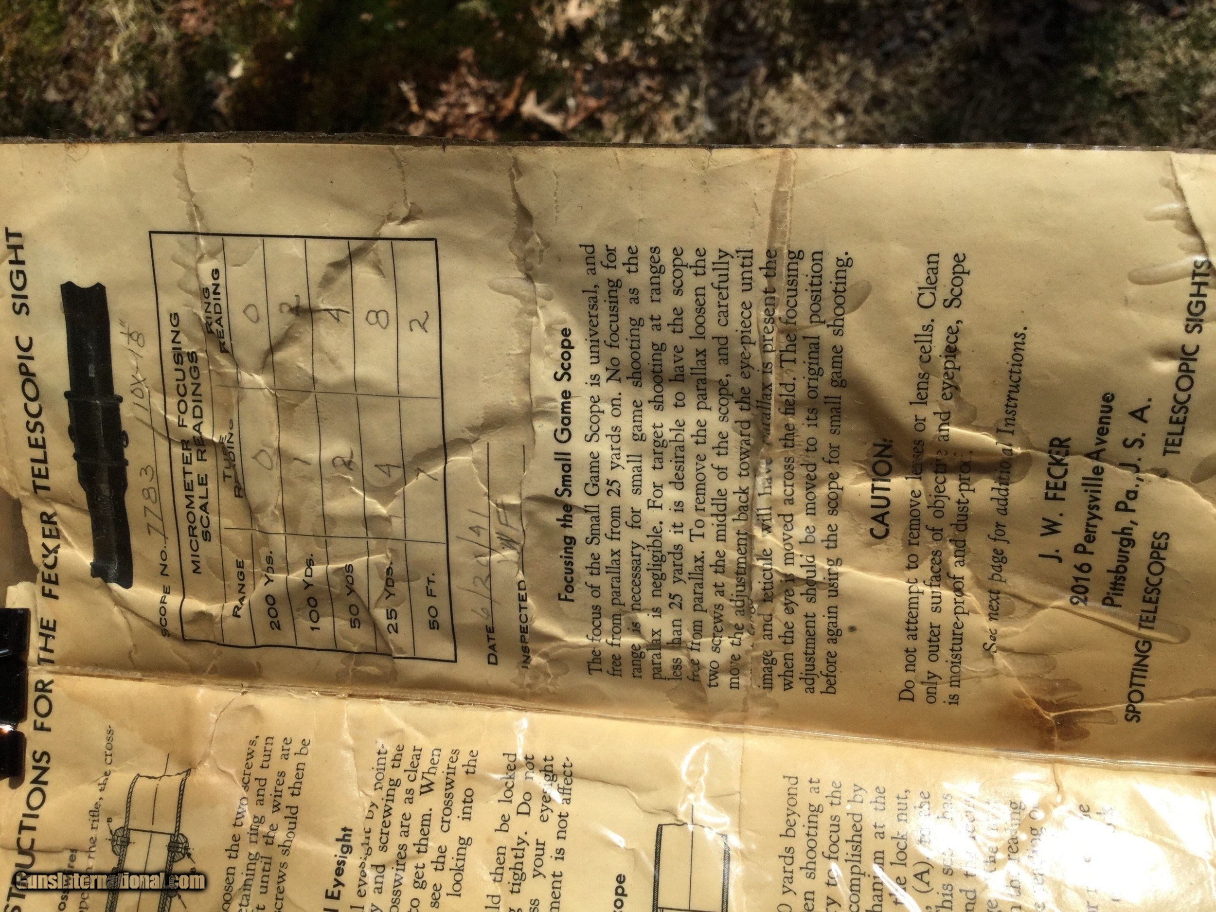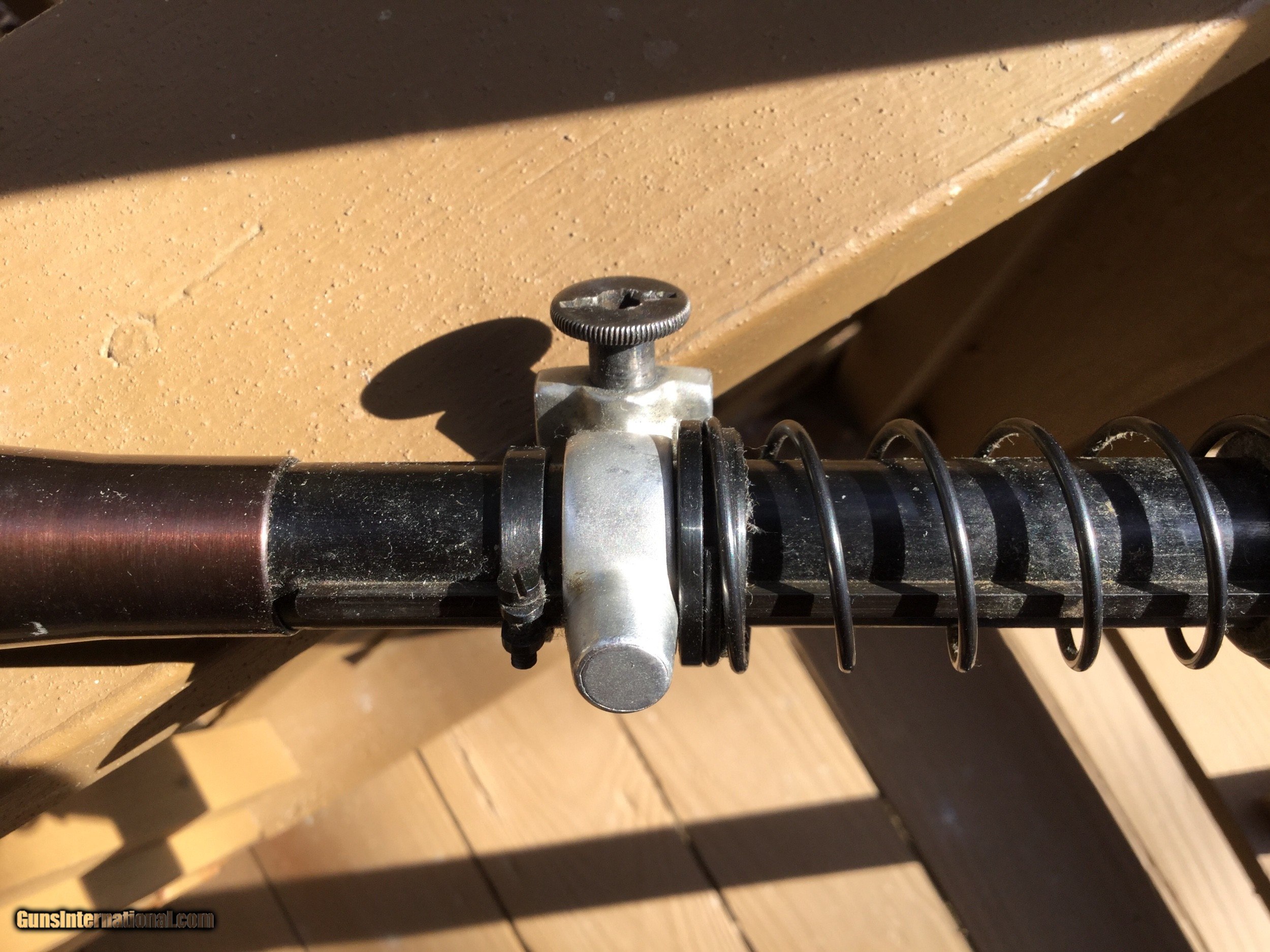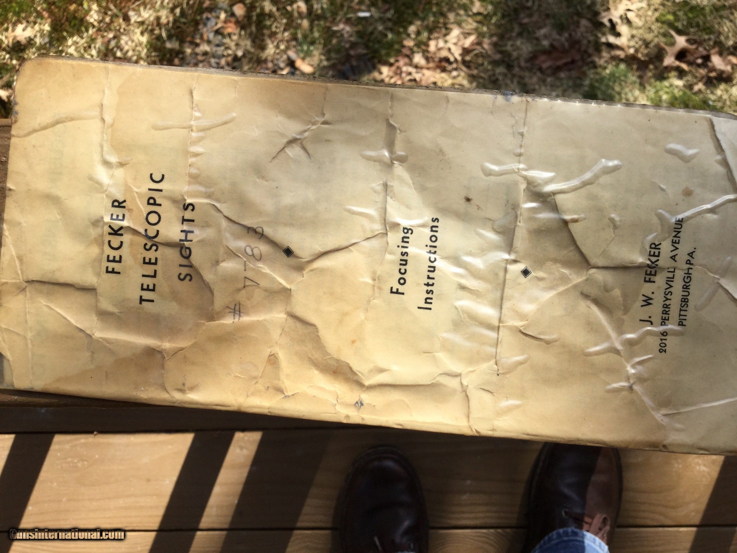 Description: A very good fine crosshairs j w Fecker from 1941 Instructions included initialed by mr fecker. Has added return spring. Mounts and end caps. Add 30. For shipping/ins. ON HOLD!!!!! Awaiting funds. SOLD |