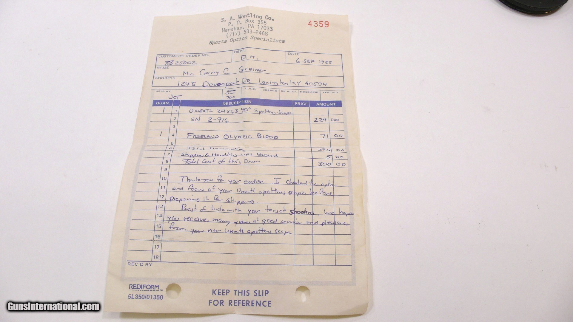 Description: PENDING SALE. Unertal 24x63 Spotting Scope with Freeland Adjustable Base in Hard Shell Case.Sold in 1988 as shown in paperwork.As new condition with no signs of wear or abuse.Can ship worldwide.Please ask any questions that you may have. SOLD |