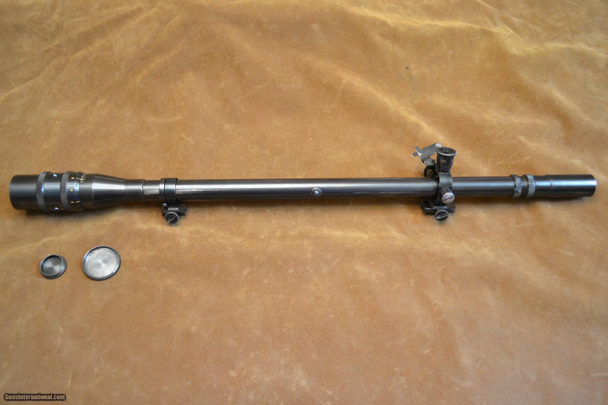 Description: An Unertl scope, target model in 10X fixed with the adjustable objective front and adjustable focus rear. The tube measures 3/4" and the AO is at 1.375, overall length is 21", lenses are clear and bright with the fine cross hair and screw in lens caps are included.I believe this is and older scope serial number 871 and it has the older blue Unertl 1/4 click adjustable mount. The scope has about 97% original blue with a very small amount of thinning, it also has the usual scrape marks attributed the the sliding mounts.There is no recoil spring, this scope was mounted on a 52A Winchester 22. Actual shipping to your door with insurance to the purchase price. SOLD |