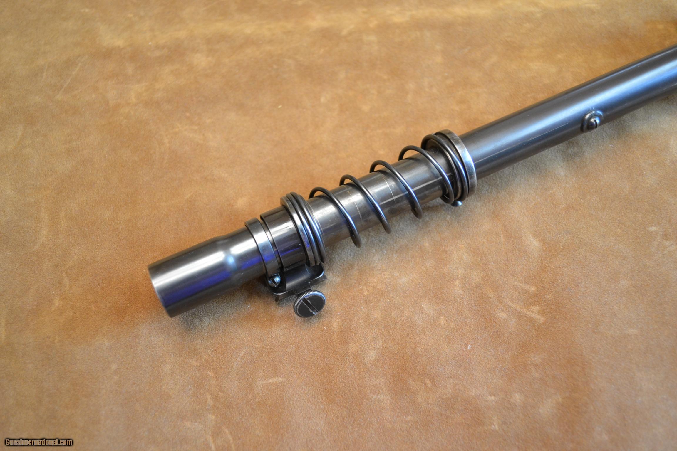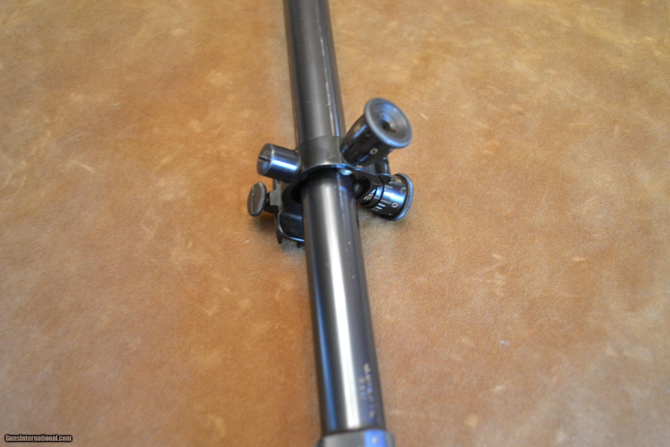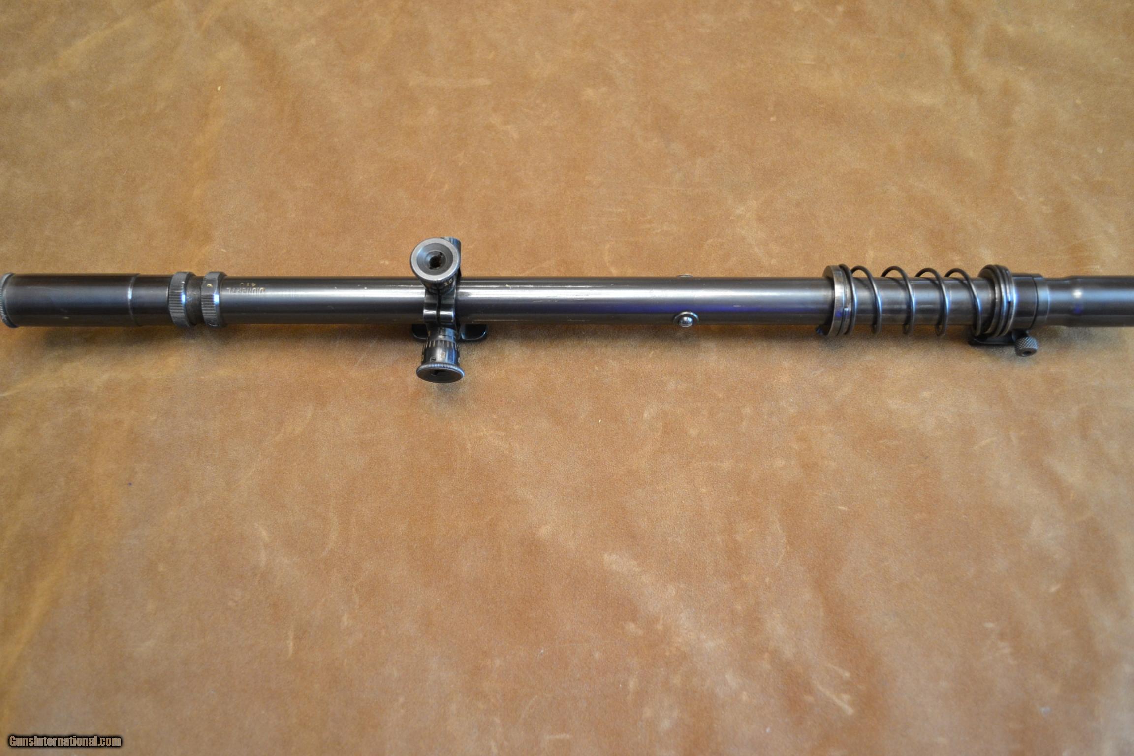 Description: An Unertal Target Scope in 6X with fine crosshairs, 3/4" tube and .850 front lens and .830 adjustable focus rear lens and measyures 17 3/4" OAL. Serial number 410 and has about 96%+ original blue ( In sunlight there is some areas turning a brown patina) with the usual scrape marks by the moveable mounts including the micrometer adjustment to 1/4" per click It also has the recoil spring and screw in lens covers. Note: The mounts are only marked with a US Patent number 2,004,489. The lenes are bright and clear. Actual shpping charges to your door with insurance to the purchase price. SOLD |