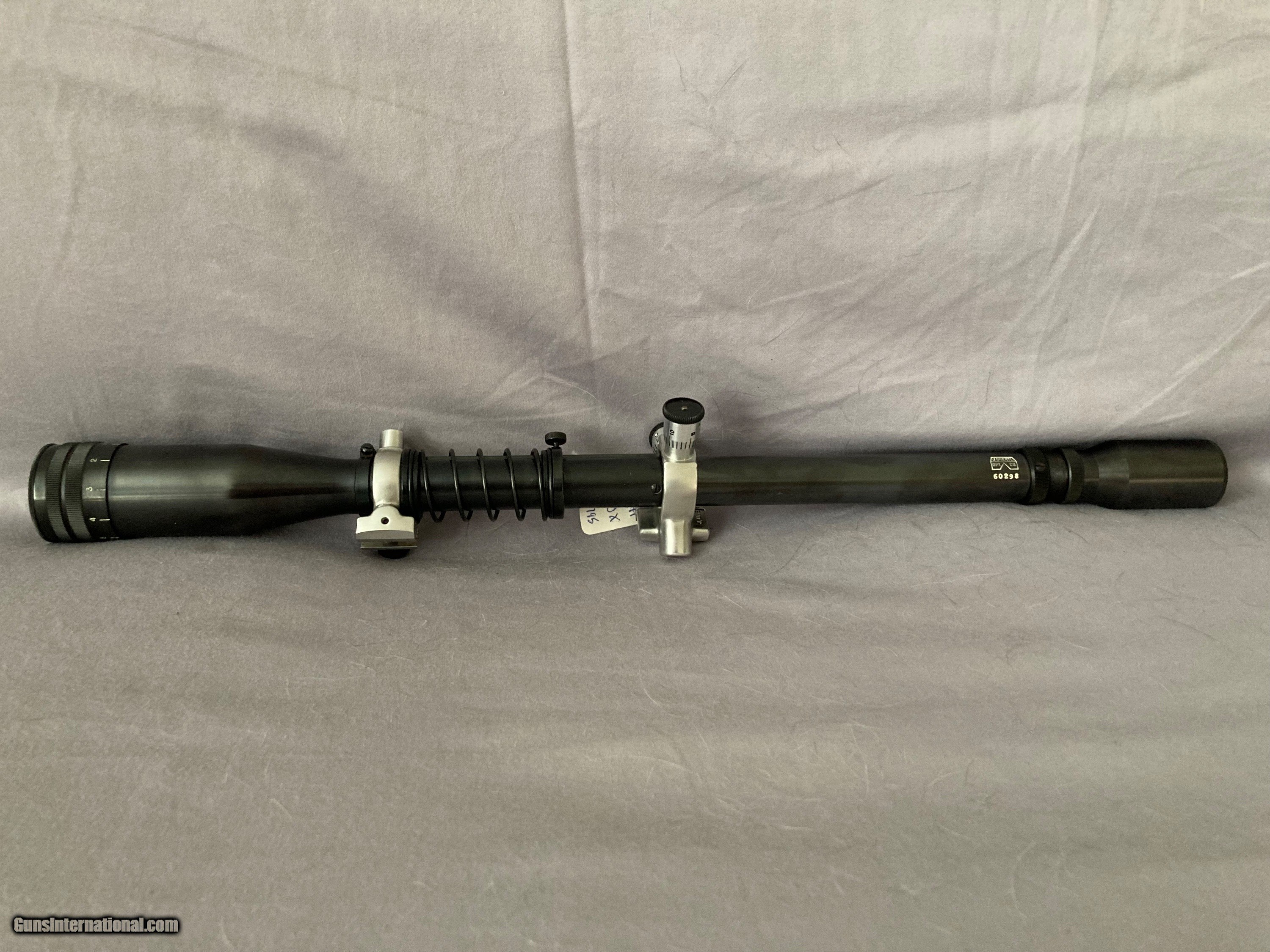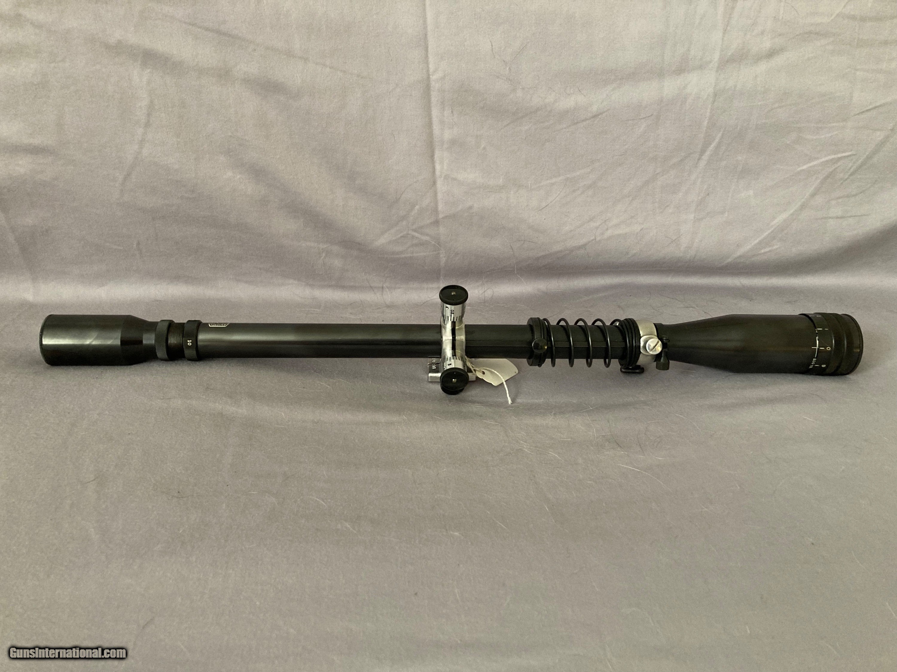 Description: Unertl Target 10X with standard Unertl mounts and standard recticle, 1" tube, 1 1/2" adjustable objective, recoil spring, lens covers, 20" length, 100% finish, as new overall, ($30.00 shipping) SOLD |