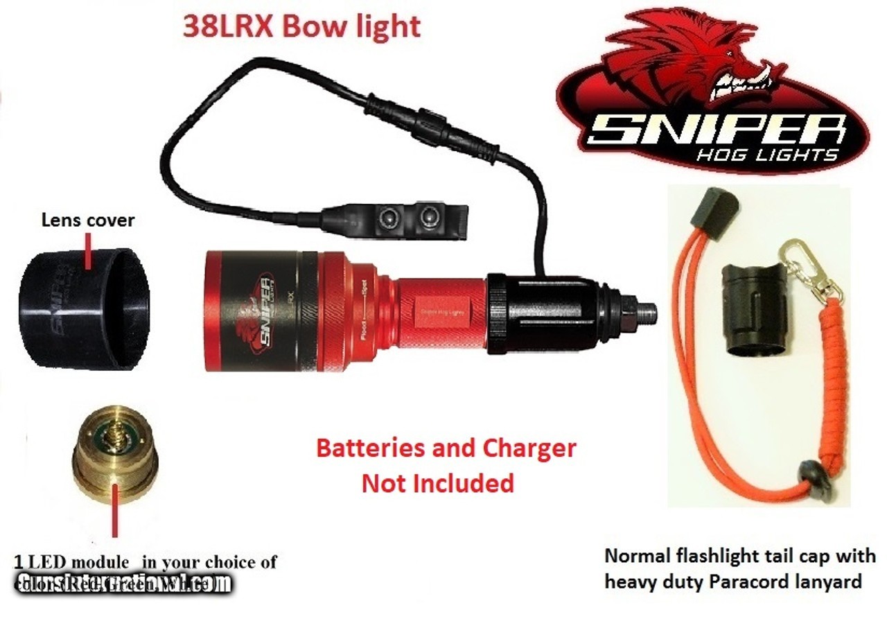 Description: 38LRX Bow Light with 1-3 colors ON ITS BEST PRICE BUY NOW!! Focusable beam so you can go from spot beam to flood beam allowing you to put just the right amount of light on the animal without spooking it with too bright of light. The two Mode wired switch mounts to your bow so you can turn the light on at half power or full power while at full draw. The switch has two buttons on it, 1 for low mode and one for high mode. Each button can be operated as a pressure switch or on/off switch. When operated as a pressure switch it will not make any noise. When operated as a on/off switch it will make a slight click sound. Fast focus only takes 3/4 of a turn of the head to go from full flood to full spot beam.