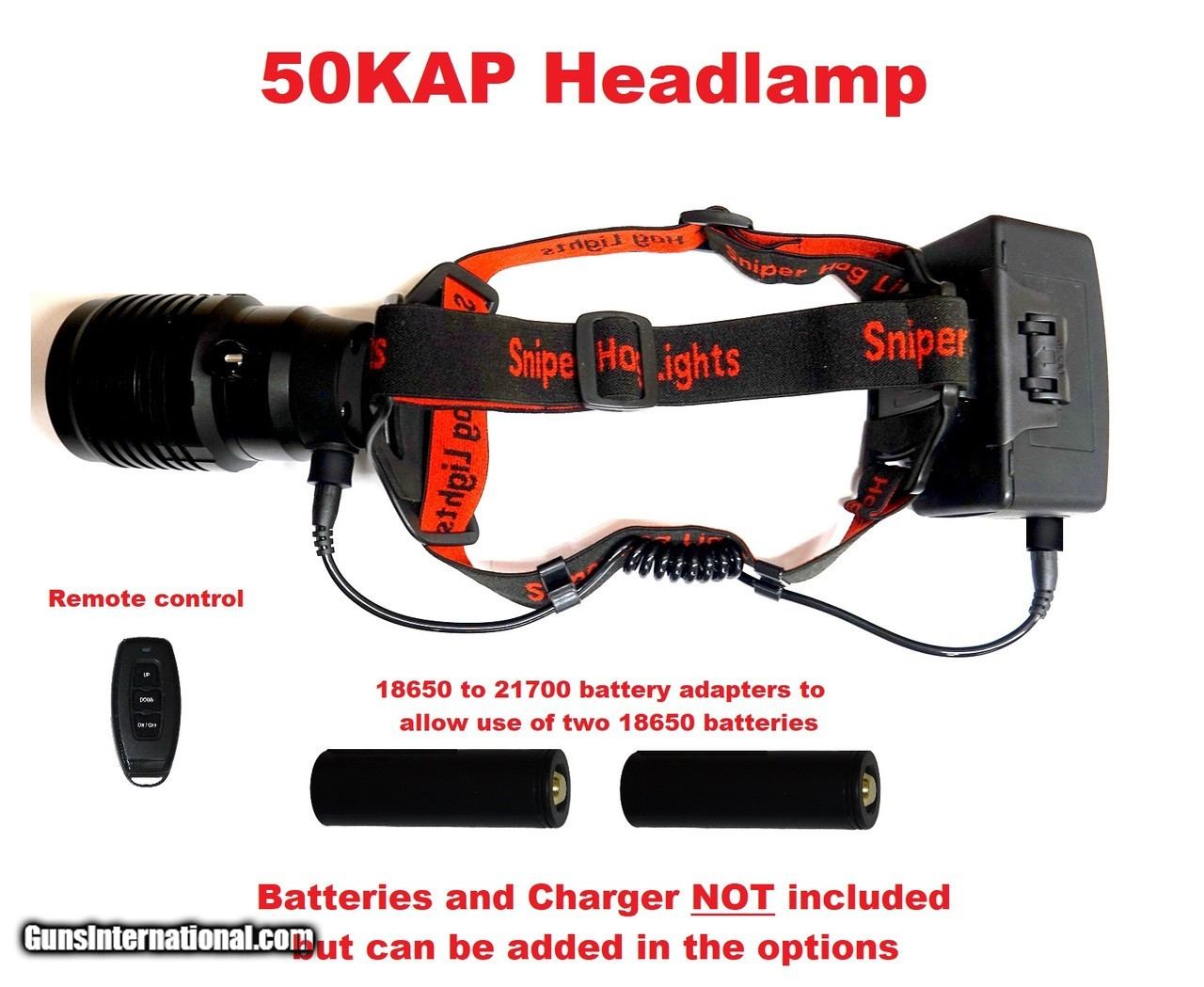 Description: 50KAP Headlamp ON ITS BEST PRICE BUY NOW!! Full dimmer for adjusting the brightness from 10-100%. Focusable from full flood beam to full spot beam. Remote control that turns the light on/off and up and down in brightness. This is a short range remote that will work a max distance of about 8ft from the headlamp. Operates on two Protected 21700 or 18650 batteries. Please note that batteries and charger are not included unless you add them in the options above. Interchangeable LED modules so you can change the color the light emits. You can add extra LED modules in the options above. Available colors, Red, Green, White and IR. The LED module color determines the color of light the headlamp will emit. Optional Light Shield available in the options above. The light shield is to remove any unwanted light hitting the hunter or the hunters equipment. Power plug so you can unplug when not in use so the light doesn't come on accidentally. Adjustable head strap, headlamp can be worn with or without a hat. Will run about 4.5 hours at full power with almost no dimming the entire time with all colors with two of our Protected 21700 5000mA batteries. Simply the furthest shining headlamp on the market for it's size and our nearest competitor doesn't even come close to the distance this headlamp shines. This headlamp is perfect for scanning or shooting when predator hunting, Camping, backpacking, walking to and from your hunting stand, and really anything you need a light for.
