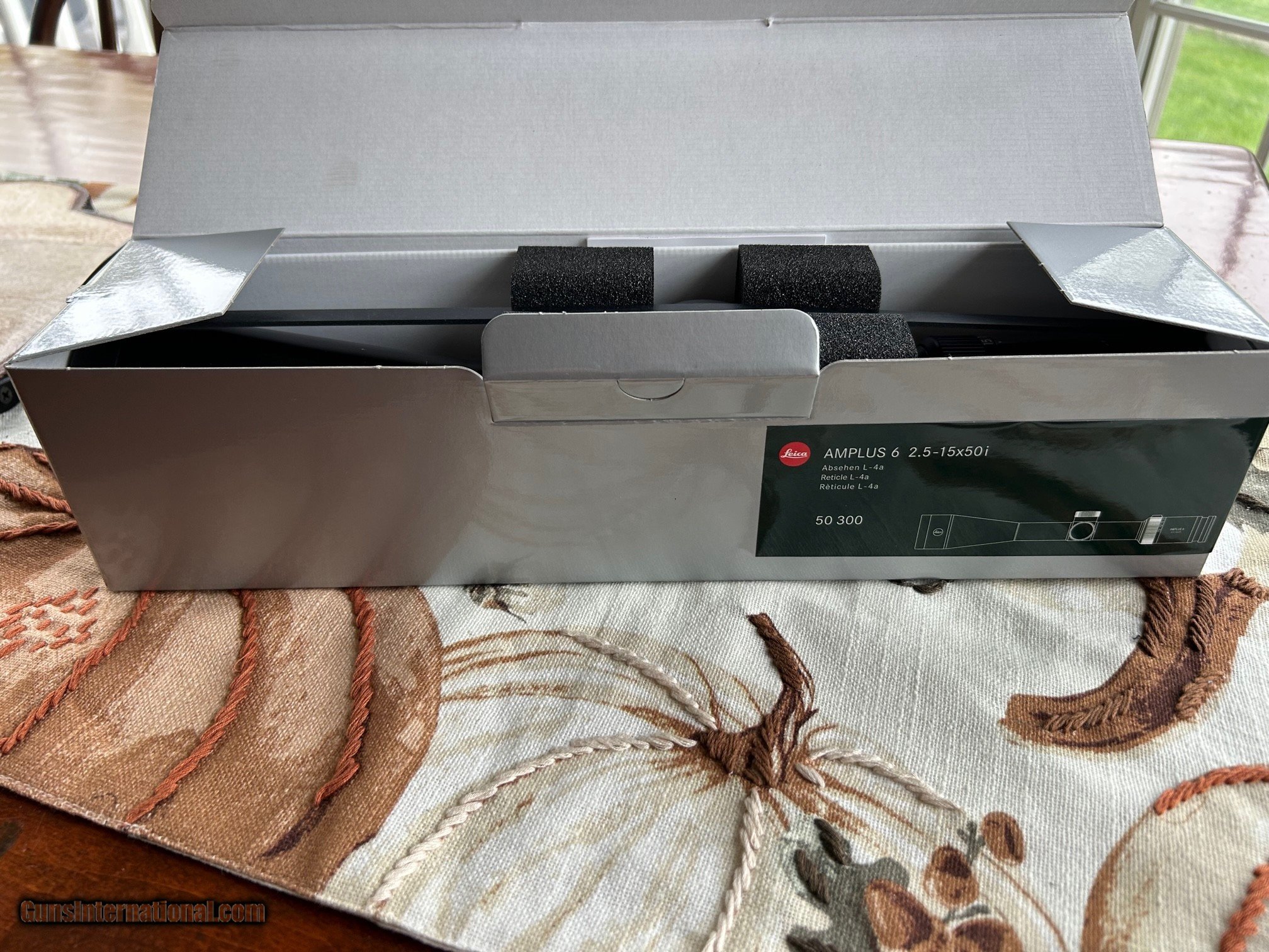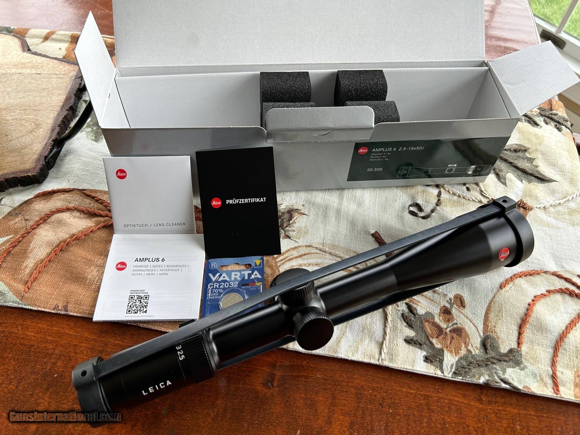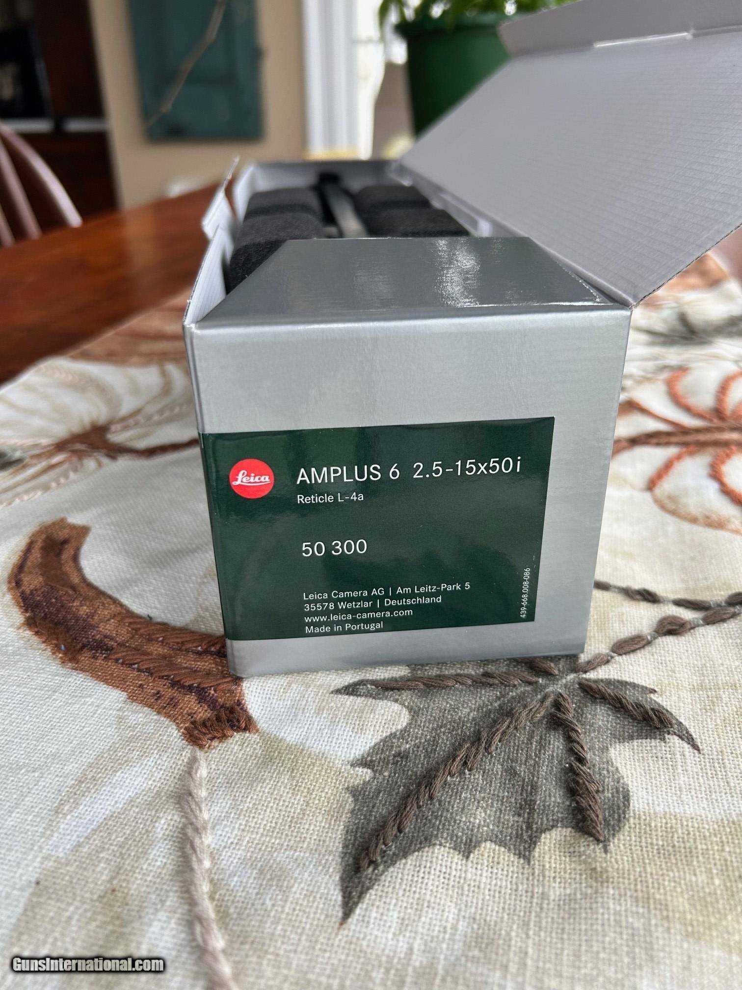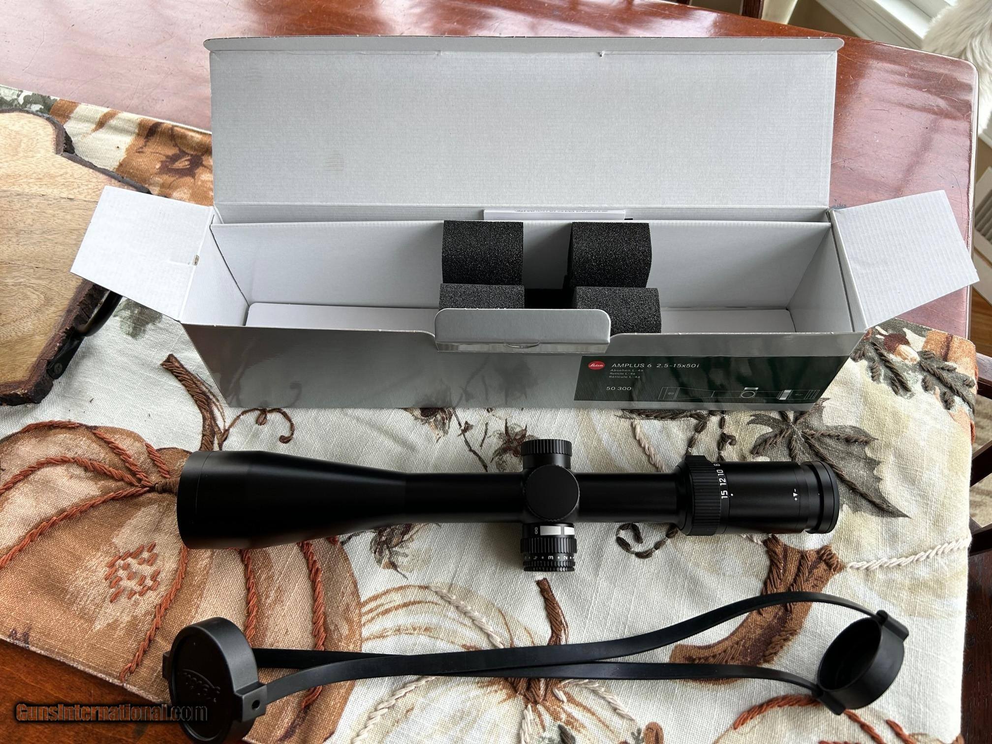 Brand new, never mounted Leica Amplus 6 2.5-15x50i L-4a riflescope with lens caps (Model 50300). Factory fresh. Superior optics. $35 insured shipping to CONUS. No sales outside the US. Only payment form are US Postal Money Orders.Nearly 20% off published retail price. Won't last long.