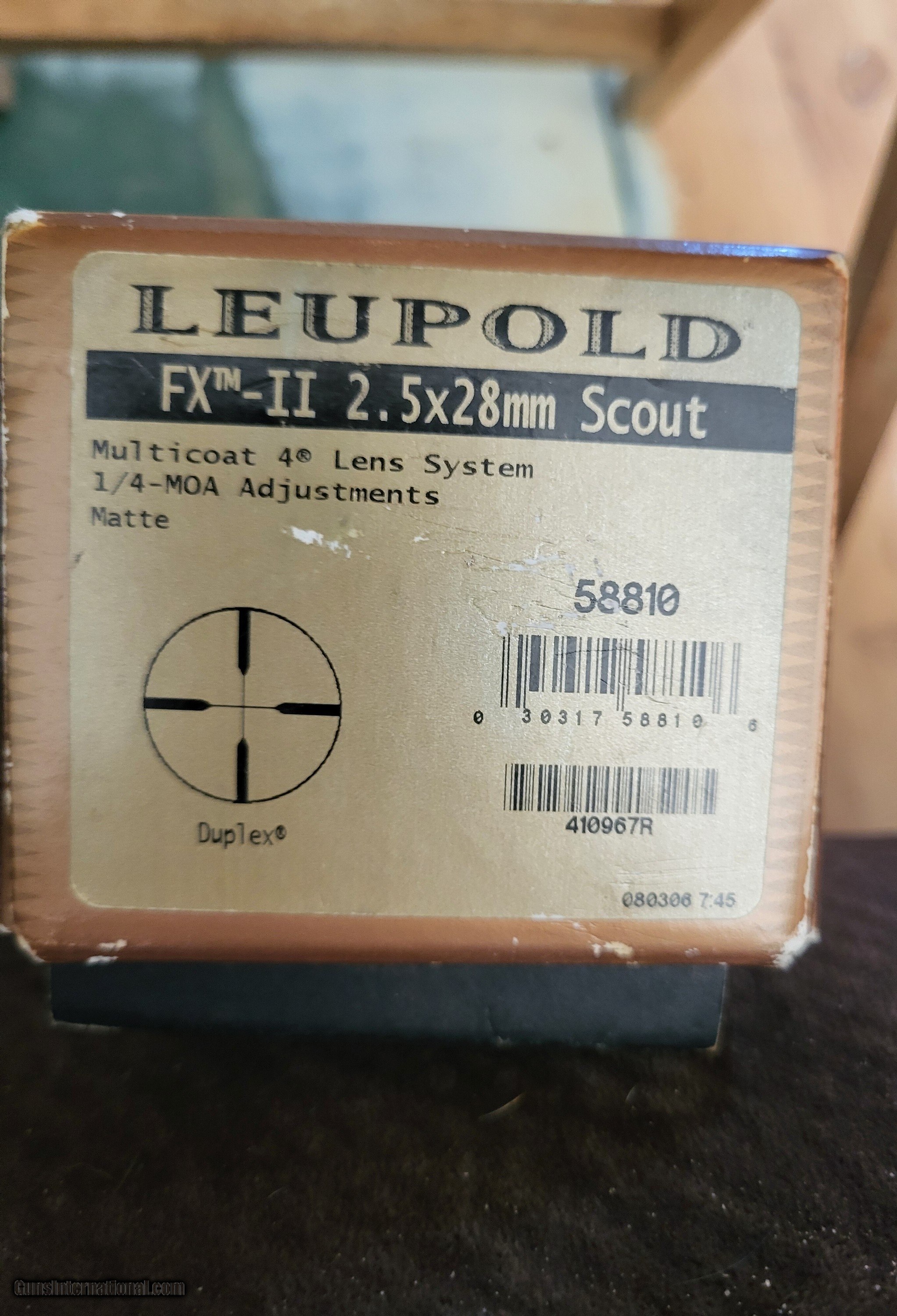 Description: Like new Leupold FX-II 2.5x28 mm Scout Scope. Duplex reticle, matte black finish. Included Quick Detach rings for picatinny rail. In box with all factory paperwork. Price: $550.00 Buy Now Contact Seller |
