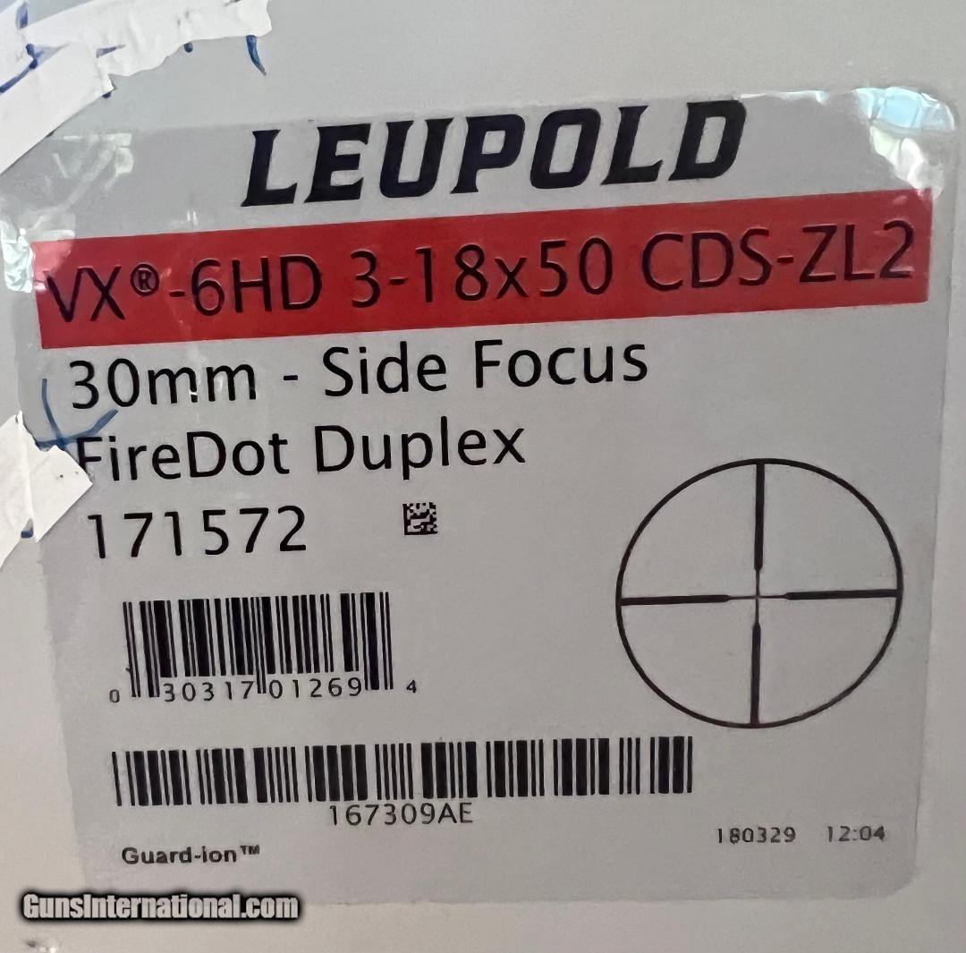 Description: Leupold VX-6HD 3-18x50 CDS-ZL2 Side Focus Illum. FireDot Duplex Used in Box Retail 1999.00 Part # 171572 Like New Buyer can order CDS dial from Leupold Shipping is $50.00 UPS insured from Zip Code 81147 Contact me for shipping to Alaska No International Shipping . Three Day inspection . 3 day inspection will begin on the first day of attempted delivery It is your responsibility to make sure you are available to receive shipment on scheduled delivery day as 3 day inspection will begin on the first day of attempted delivery To prevent misunderstandings please be sure of what you are buying before purchasing don’t hesitate to ask questions or request more pictures you can contact me at 970-443-0190 as Insured Return is at the buyers expense and refunds are minus original Shipping fees . . Returns accepted only if merchandise is not as advertised , pictured or grossly misrepresented and in exact condition as received .