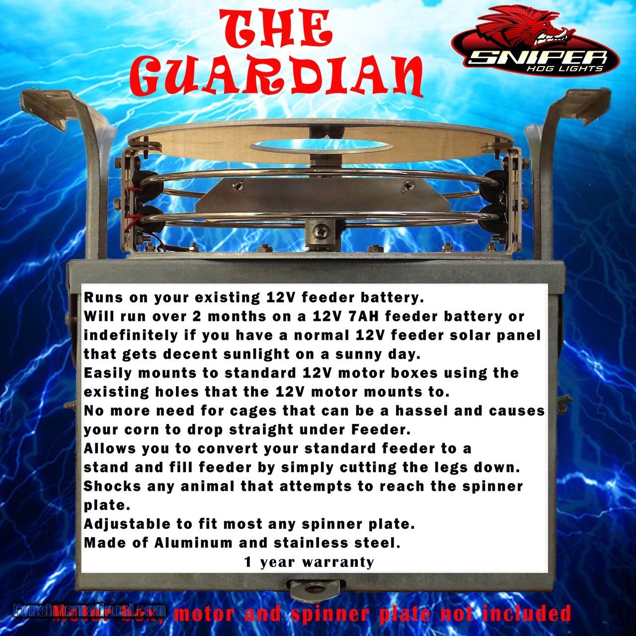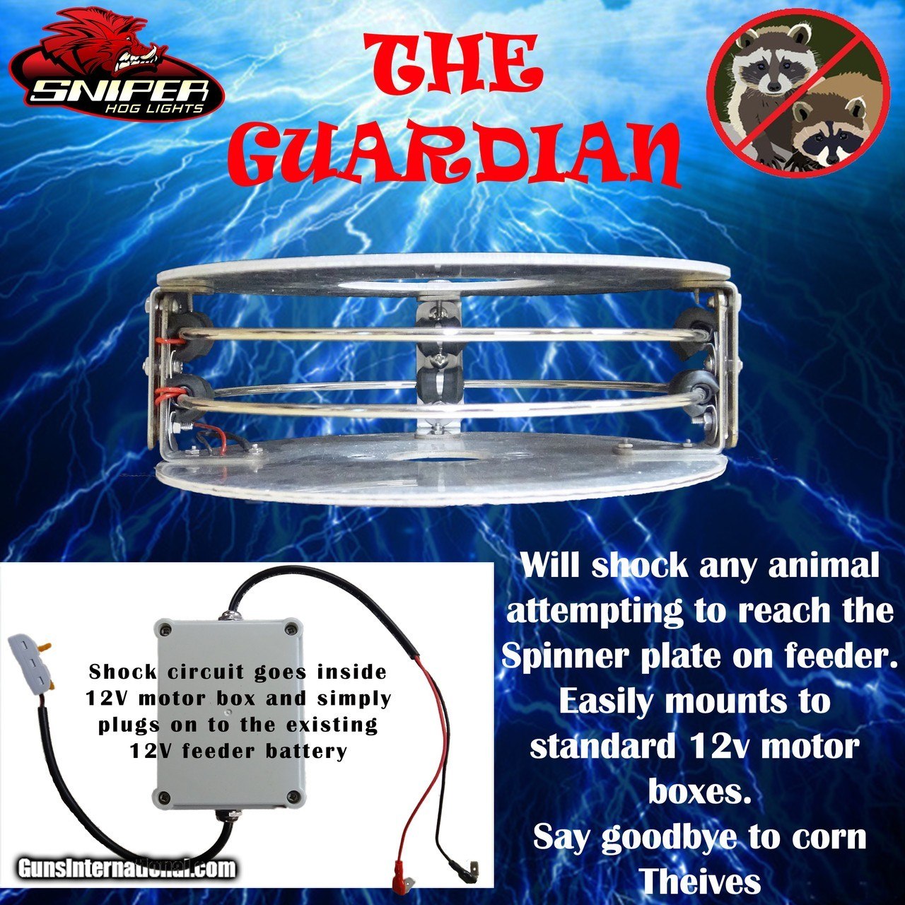 Description: The Guardian ON ITS BEST PRICE BUY NOW!! We have seen Raccoons drain a 1000 pound corn feeder in less then 30 days. The Guardian will save you money in the long run by shocking all Raccoons, Squirrels, birds and more that are trying to reach the spinner plate on feeder. The Guardian could easily pay for itself in 1 year by not letting unwanted animals spin your corn out. No more need for cages that cause most of your corn to drop straight under the feeder and can be a pain to get in and out of to change feed times or to work on something in the motor box. Guardian is designed to allow maximum spread of your corn.