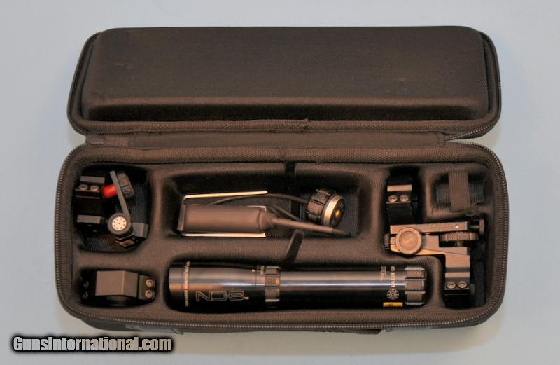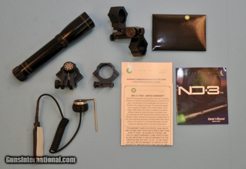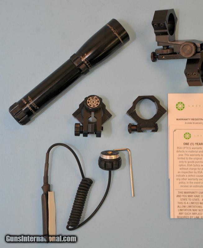 Description: Long distance all weather laser designator. Green laser technology night vision device illuminates target up to 250 yards. Rotary optical beam collimeter for quick beam & intensity adjustment. Sealed nitrogen charged 1" black anodized tube with multi coated optics. Uses 1CR123Abattery (included). Accessories consist of; binocular-spotting scope mount, 1" Weaver style ring, 1" scope mount with adjustable windage-elevation & pressure switch. As new condition with case,box & papers. Priority mail $15.00. SOLD |