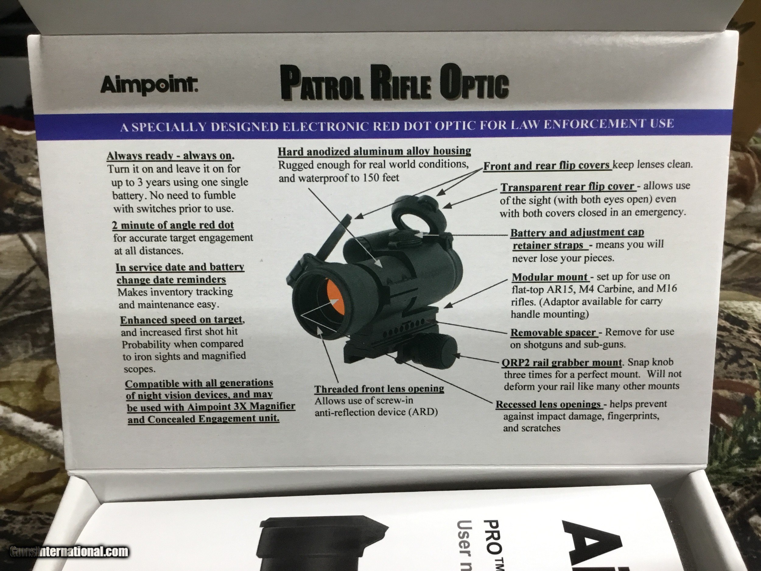 Description: Aimpoint Patrol Rifle Optic 30mm 2 MOA Red Dot Sight........... #12841 $399.00 $21 to ship. Will be shipped with insurance. Thank you for looking at our items. If it is listed on the site, we still have it in the shop. If you wish to buy, hit buy it now and call the shop to pay. Ask for Bree....... (803) 874-1060. NO sales to California EXCEPT under certain conditions. If you are in California, please DO NOT push buy it now and just CALL the shop first. ...... (803) 874-1060 NO INTERNATIONAL SALES. SOLD |
