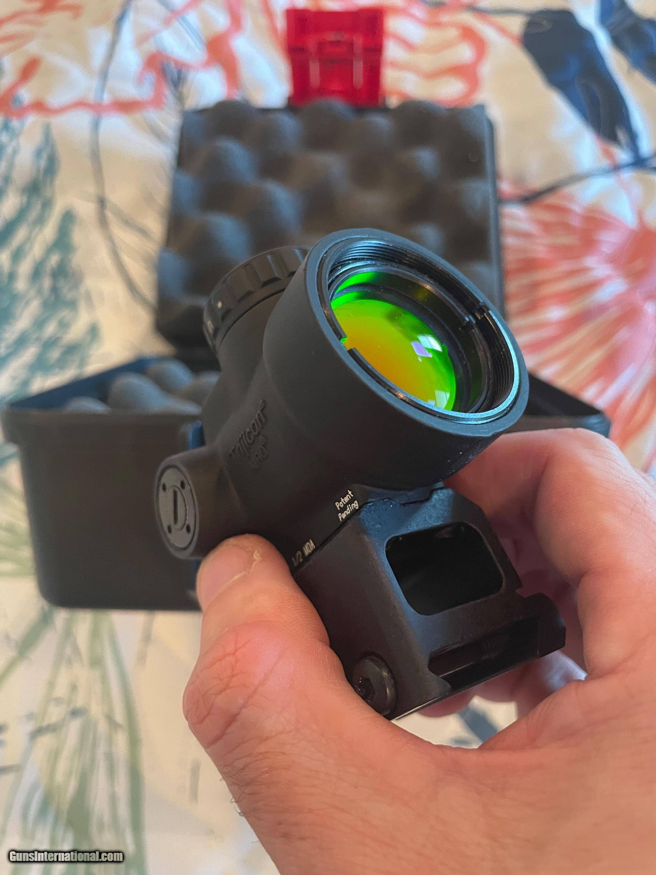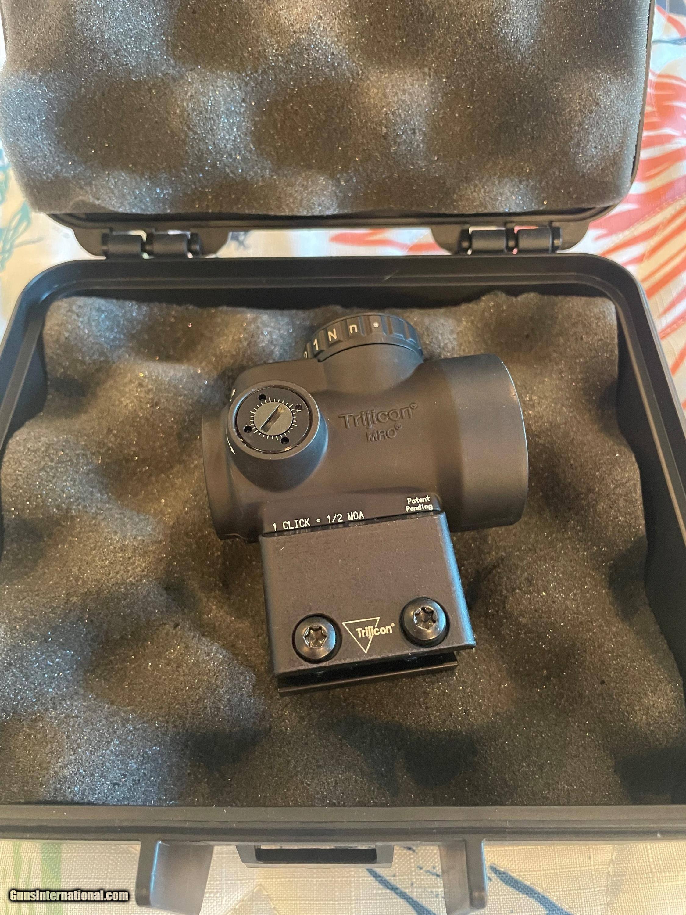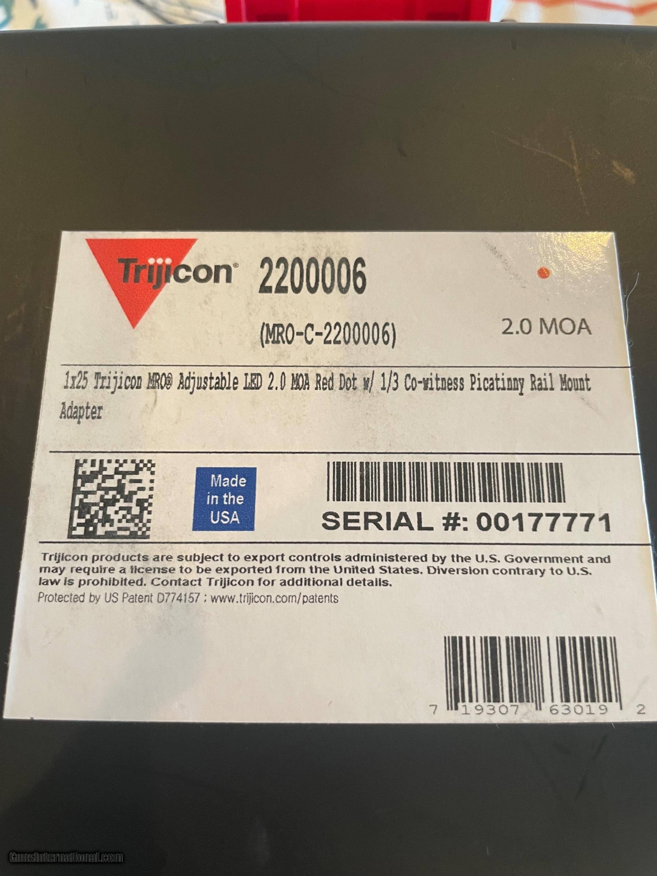 Description: PRICE LOWERED!!!! USED Flawless 1x25 Trijicon MRO Adjustable LED 2.0 MOA Red Dot with 1/3 Co-witness Picatinny Rail Mount. This is the standard MRO (non HD), purchased about one year ago. Around 30 rounds fired while attached to an AR15. Original box and all paperwork, tools included. This MRO is entirely scratch free and flawless. Pay via Zelle or PayPal and I will ship it via UPS immediately (same day or next morning depending on order placement time). I pay for shipping! SOLD |