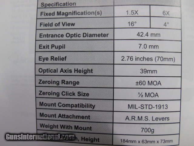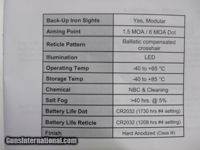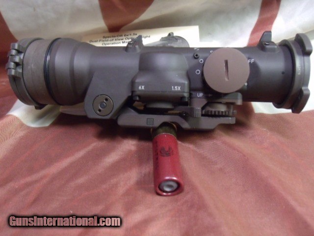 Description: Elcan SpecterDR 1.5x-6x Dual Role Optical Sight The Elcan SpecterDR 1.5x-6x Dual Role Optical Sight is a crystal clear optics with a generous eye relief. This makes it the ideal optic for designated marksman rifles and other long range applications. As with all SpecterDR sights, the magnification and field of view can be changed instantly with the throw of a lever. Depending upon the situation, the user may adjust the sight to illuminate the crosshair or just a brilliant red dot in the center. Because the reticles are etched in glass, they are plainly visible even in the case of loss of electrical power due to battery failure or EMP. vThe Specter DR provides two reticle modes: A Red Dot at the center of the crosshairs, and a Range Estimating and Drop Compensation Reticle. Each reticle mode has multiple brightness settings and is set by the Illumination switch on the left side of the sight.