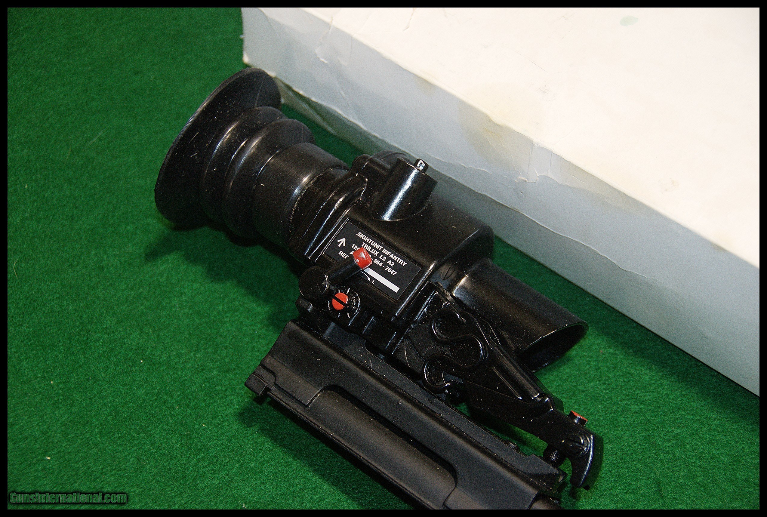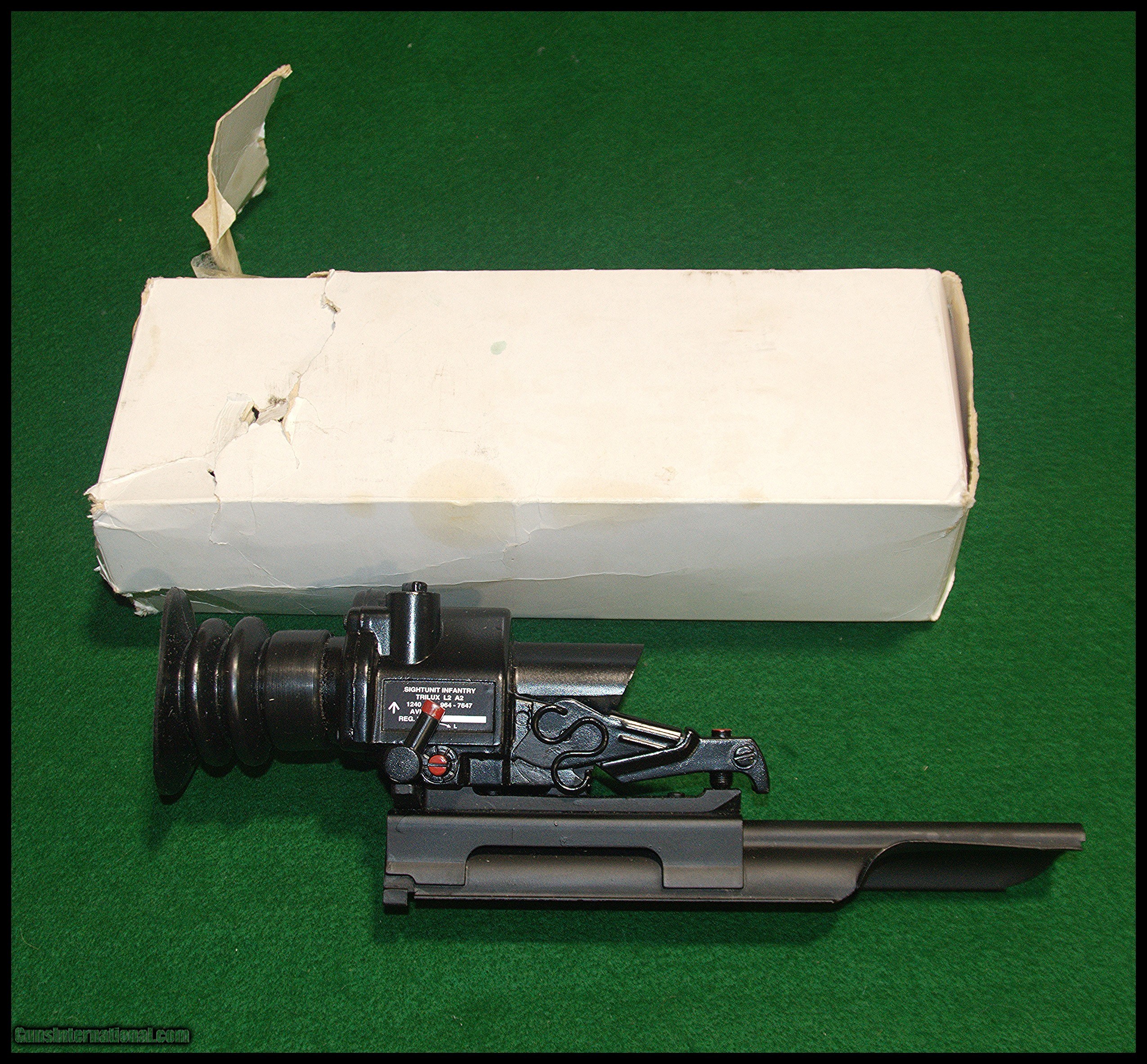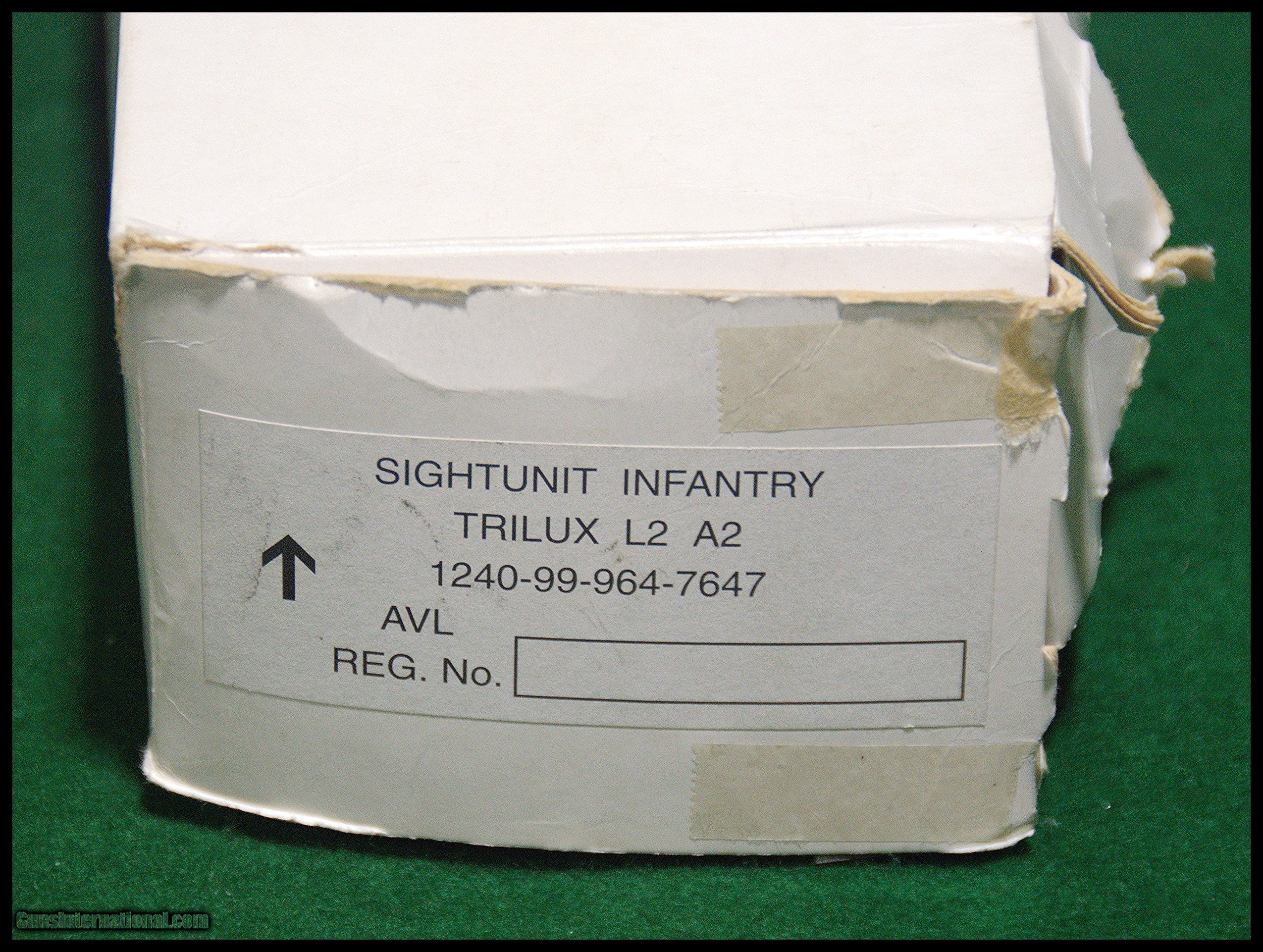 Description: New in box Trilux L2A2, SUIT Infantry sight for FAL.With dust cover. Brand new in damaged box. Sight is perfect SOLD |