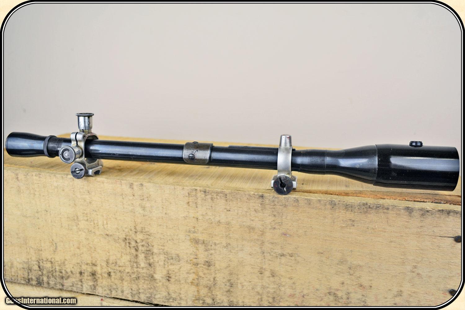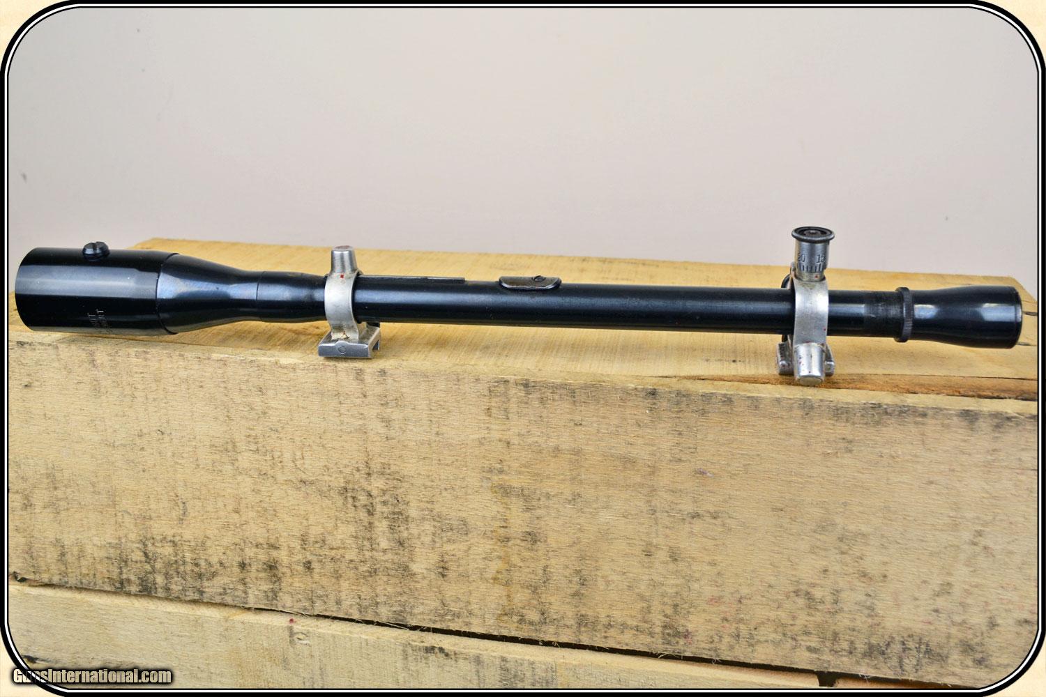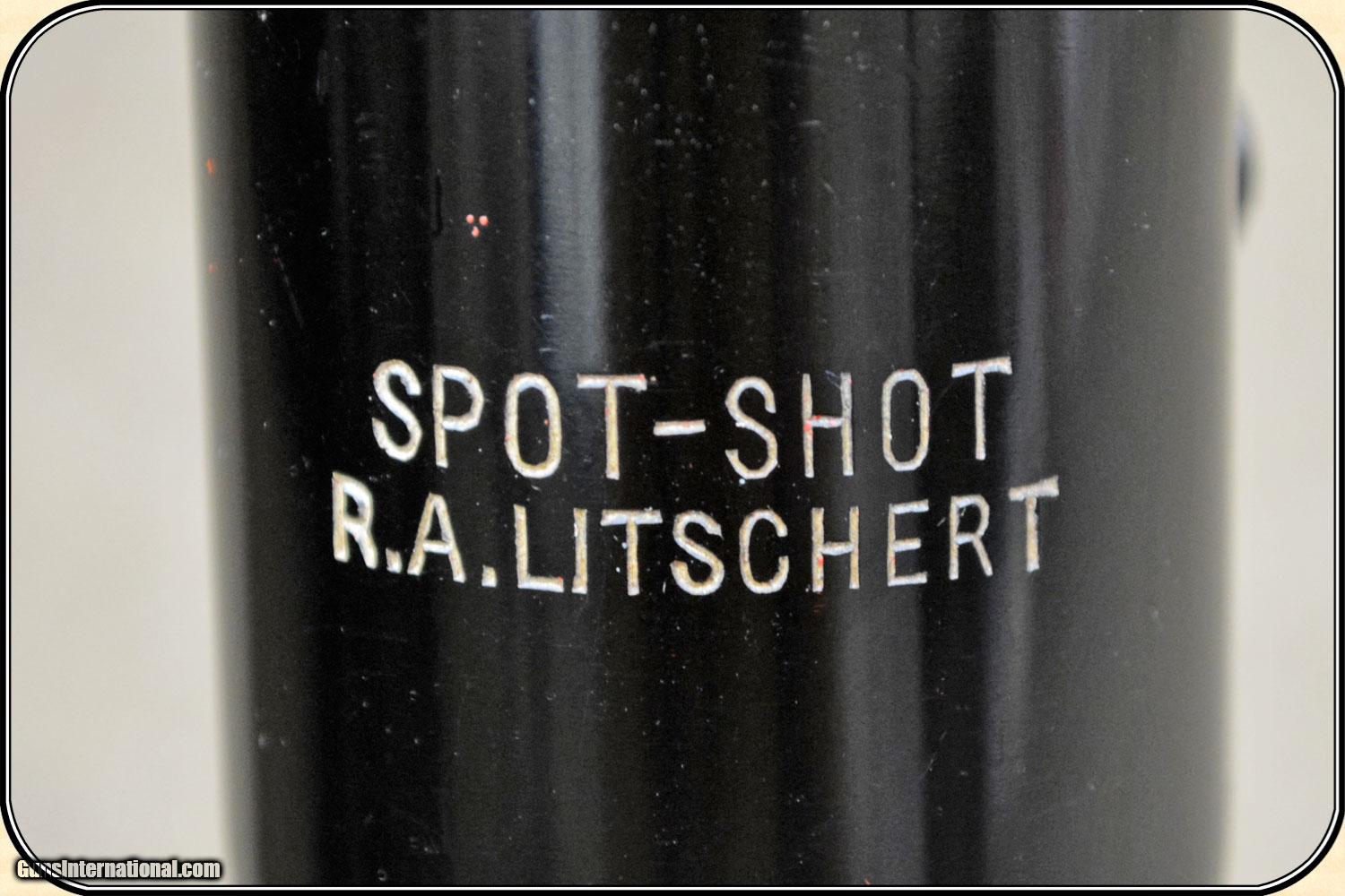 Description: Spot-Shot 4-Power Rifle Scope and Rings, by R.A. Litschert, with field of view of 12' at 100 yards; eye relief is 2.5'', length of 16.5'', weighing 17 ozs., with _'' tube and 1.25'' objective lens. Mfg'd 1951-1952. Standard crosshair reticle. Condition is fine with light scuffs in actioning area and general overall micro-scratching. Clear optics. SOLD |