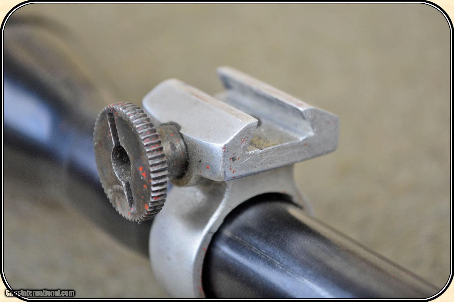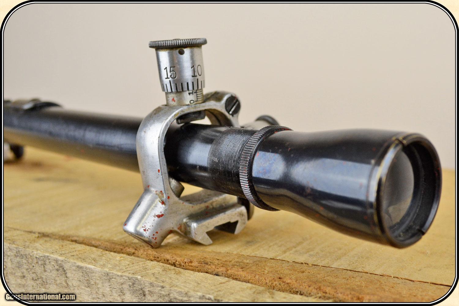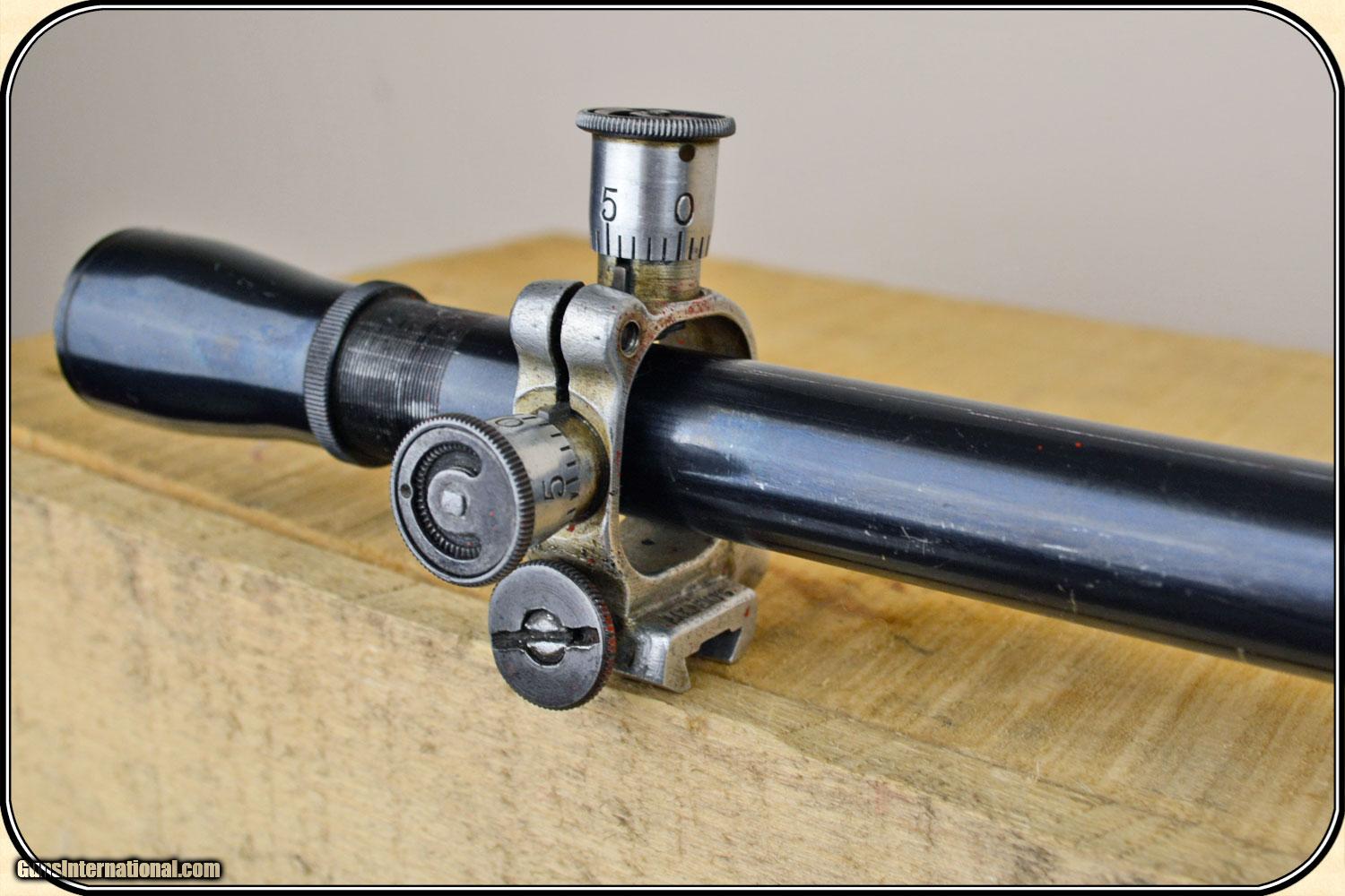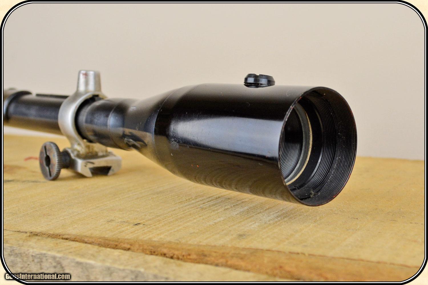 Description: Spot-Shot 4-Power Rifle Scope and Rings, by R.A. Litschert, with field of view of 12' at 100 yards; eye relief is 2.5'', length of 16.5'', weighing 17 ozs., with _'' tube and 1.25'' objective lens. Mfg'd 1951-1952. Standard crosshair reticle. Condition is fine with light scuffs in actioning area and general overall micro-scratching. Clear optics. SOLD |