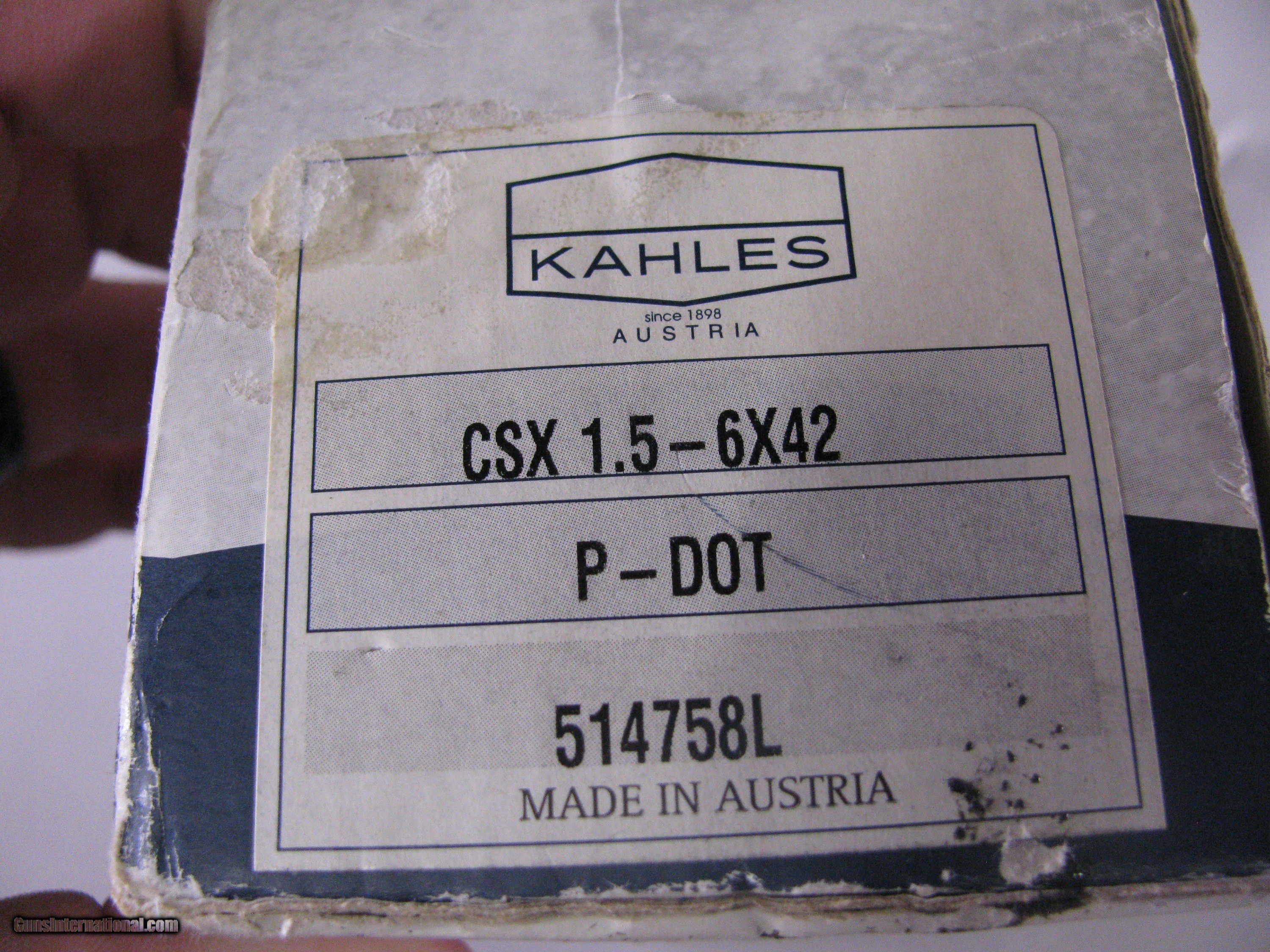 Description: 8057-- Kahles csx 1.5-6x42 P-DOT, 30mm tube, Only the P dot reticle is available right now, Very generous eye box, AMV multi-layer lens coating provides close to 100% light transmission for crisp, clear images in twilight hours, Light weight rugged construction, water and shockproof design, machined from a single piece of high grade aluminum… includes Prismatic rail, Extremely precise adjustment mechanism creates absolute repeatability SOLD |