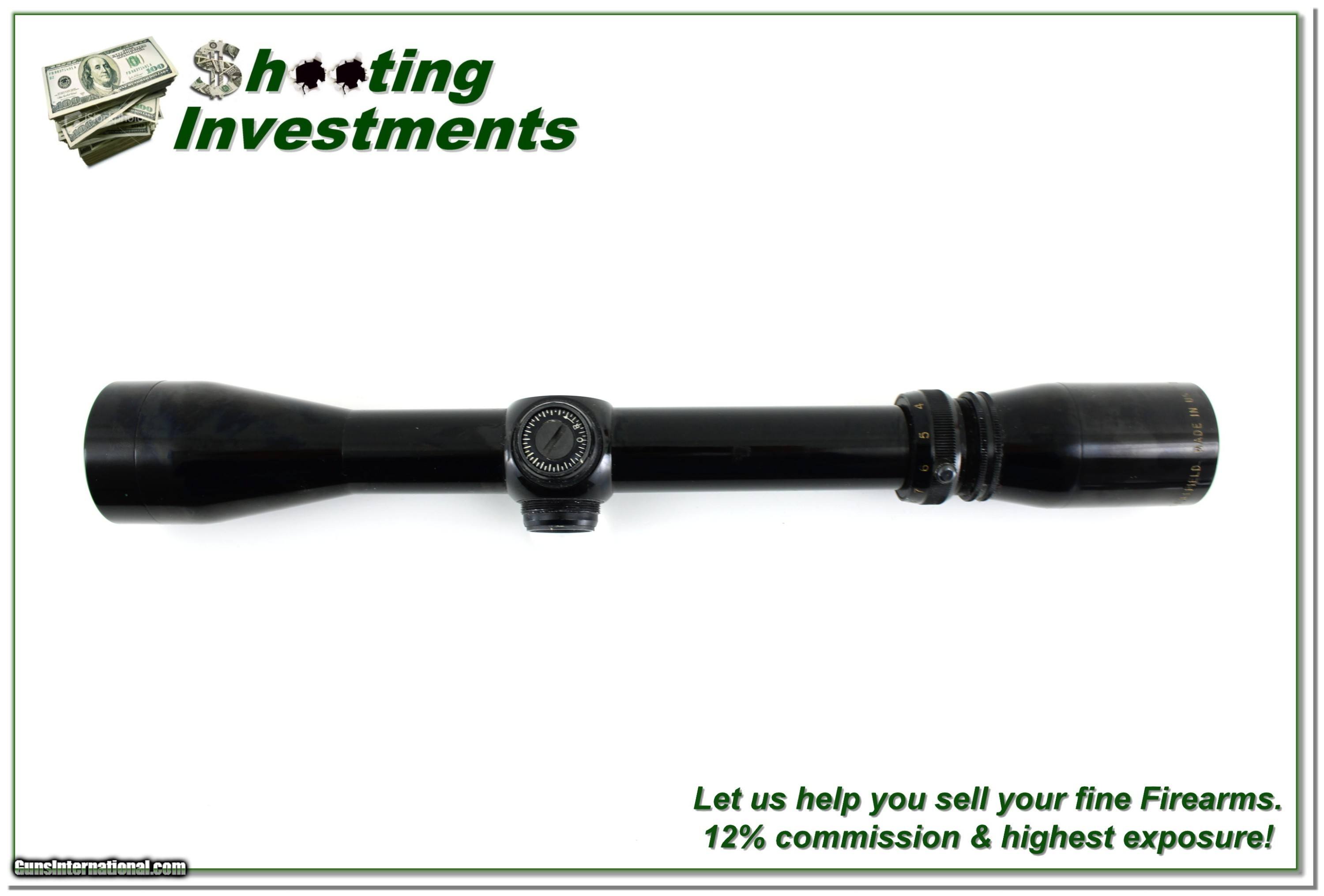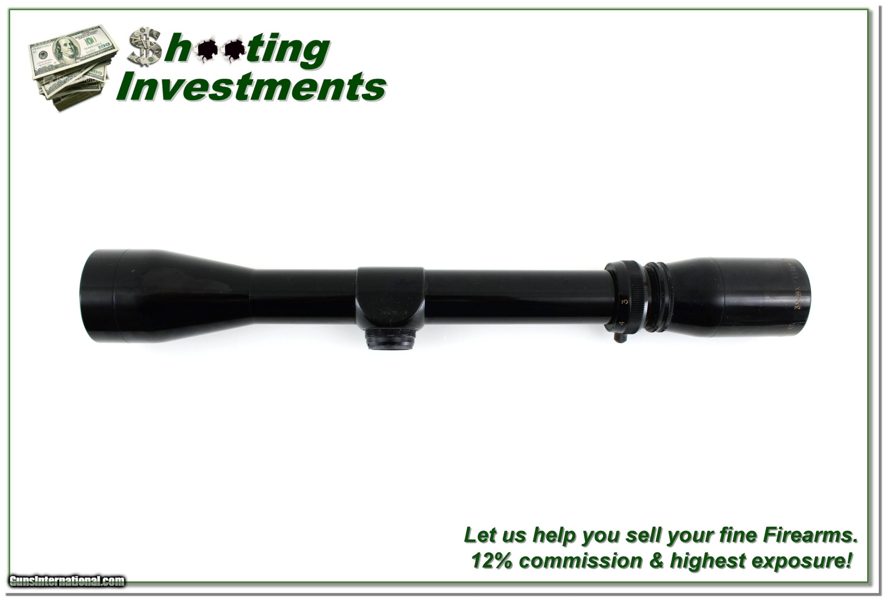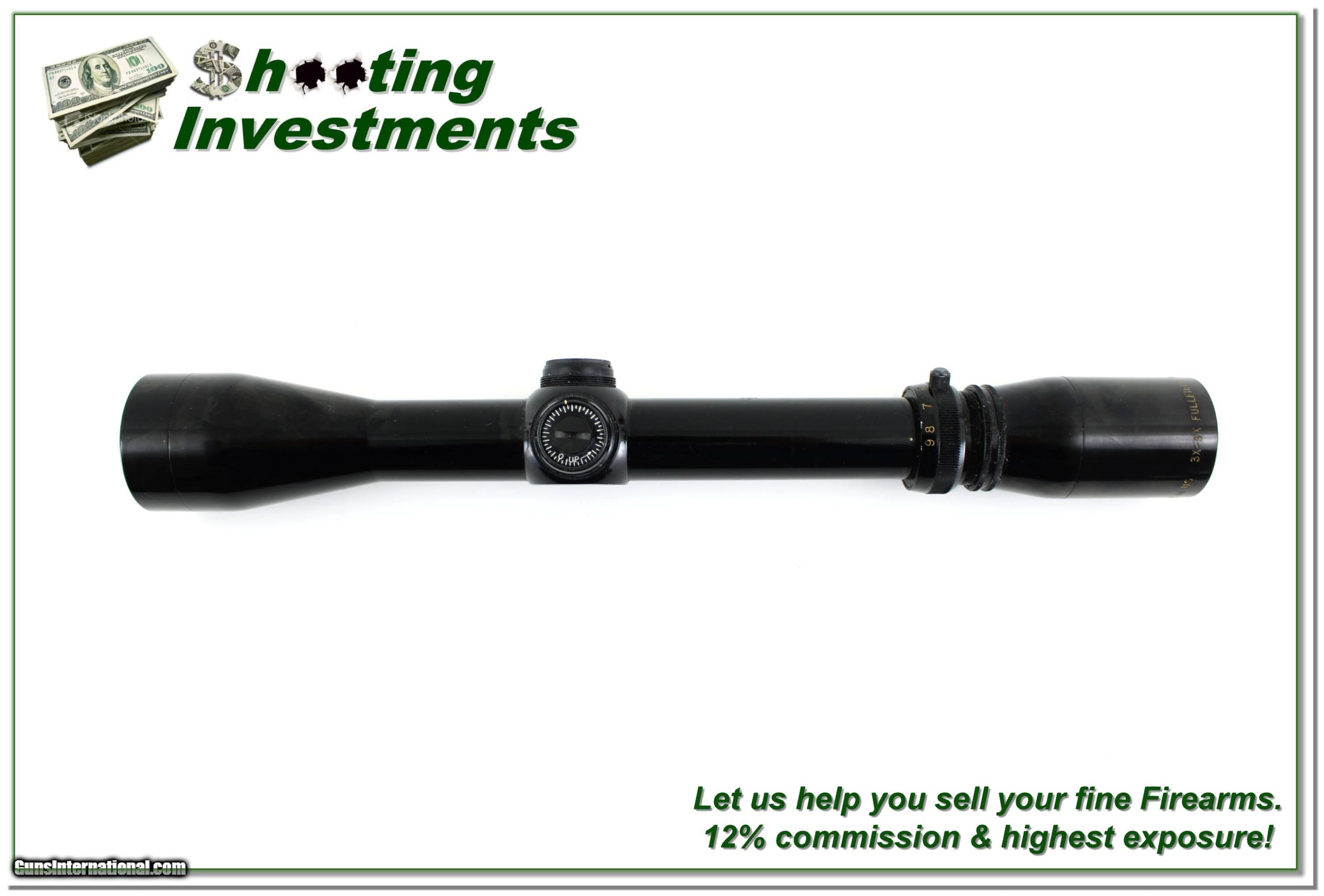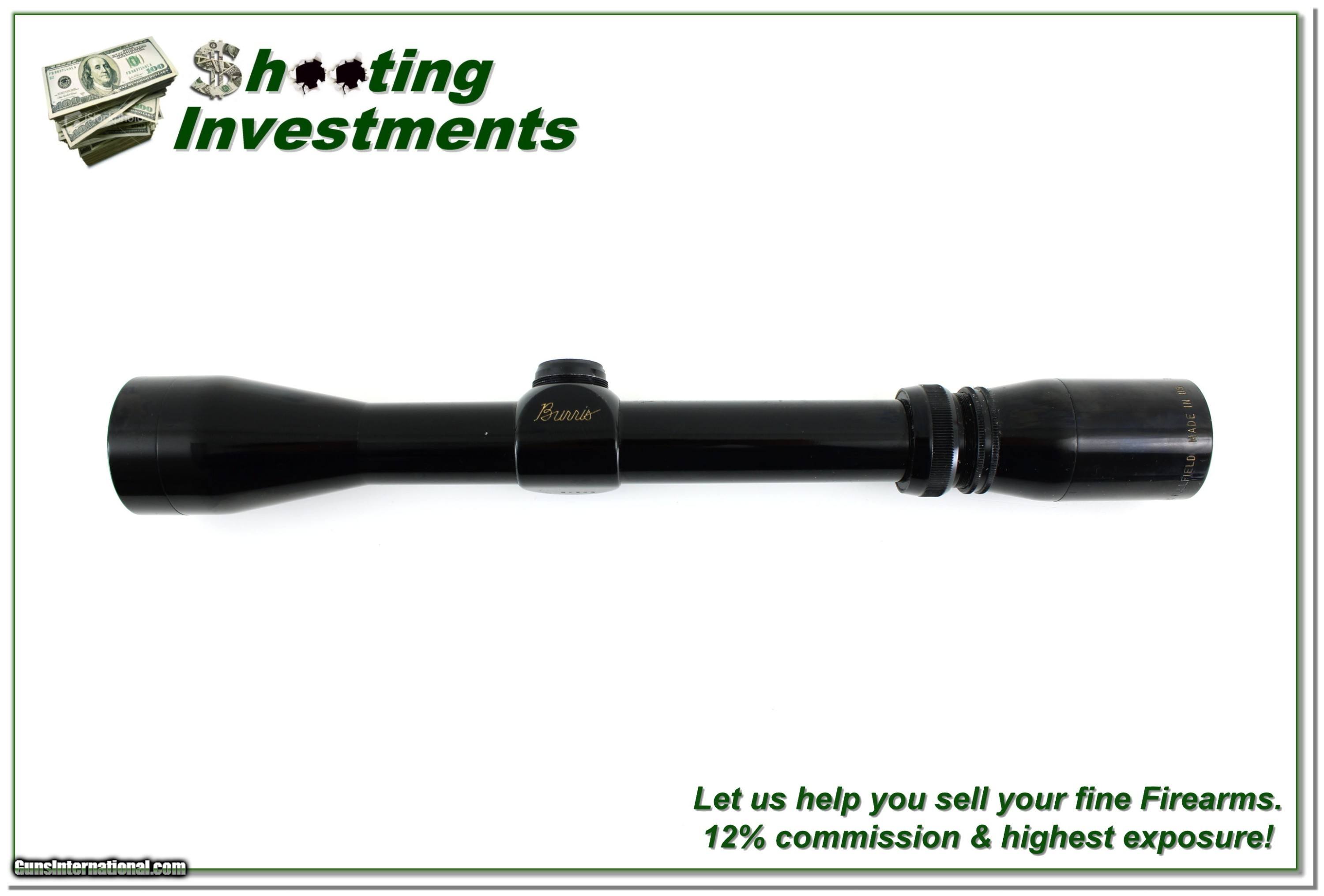 Description: Burris 3-9x Fullfield Rifle Scope (Gloss finish) with Duplex Reticle, made in the USA. This scope is in excellent condition with only a few tiny marks from previous mounting. Clear optics, solid construction, and classic styling make this a great choice for hunters or collectors. Scope caps are not included. A reliable, high-quality scope with traditional American craftsmanship. Shipping is $14.95 and please email me with any questions or larger pictures. (Consign your quality firearms with Shooting Investments for only 12%! Let me know if you have any you would like to sell!) 24-0601s Payment: Payment is by Money Order, Cashier’s Check or Personal Check. I can now also accept Credit Cards (MasterCard, Visa, Discover & American Express) with a 3% convenience fee. Shipping: The shipping charge will be listed in each description. It is $49 for most firearms. Some heavy guns or those insured for over $2000 will be higher. Shipments to Alaska and Hawaii are higher because air shipment is required. Most firearms are shipped on Tuesday and Thursday and usually in 5 days of receipt of payment. We package all shipments carefully and insure them. Optics are shipped Priority Mail and most other non-firearm shipments are shipped First Class. Returns: Our return policy is simple. If for any reason you are not pleased with your purchase, you may return your item for a full refund of purchase price. Ammunition cannot be returned. It is important to us that you are happy. Guns cannot be fired or dissembled before returning them and they must be returned in the same condition as received. Notification of a return must occur within 3 days of receipt at your dealer. Shipping, convenience and dealer fees are not refundable and are the responsibility of the buyer. Lay-a-way: If needed, we offer a 60 day lay-a-way option on most firearms. It is 1/3 now, 1/3 in 30 days and 1/3 in 60 days. Lay-a-way firearm sales are final and cannot be returned. If a lay-a-way is not completed the first payment cannot be refunded. Consigning your firearms with Shooting Investments: We will help you get top dollar for your firearms. While most local guns shops charge 20% or more, our fee is only 12% with a minimum of $100. At your local gun shop it might take months to sell. Selling on-line provides instant access to thousands of interested buyers. You won’t find any other on-line dealer willing to sell your firearms for only 12% or listing every gun on 3 separate s. Selling through an House typically costs the seller 15% and the buyer an addition 15% (so 30%) and you have to wait several months to sell and longer to receive funds. If properly priced, we will sell your firearms within a few weeks. Send us an email or give us a call and we’ll explain how easy it is for you to get top dollar. Trading: Trading for us is really just buying your gun to re-sell. If you have a gun you want to trade, please email a picture and we will let you know what we can give for it. You will always get more if we sell it for you on consignment. SOLD |