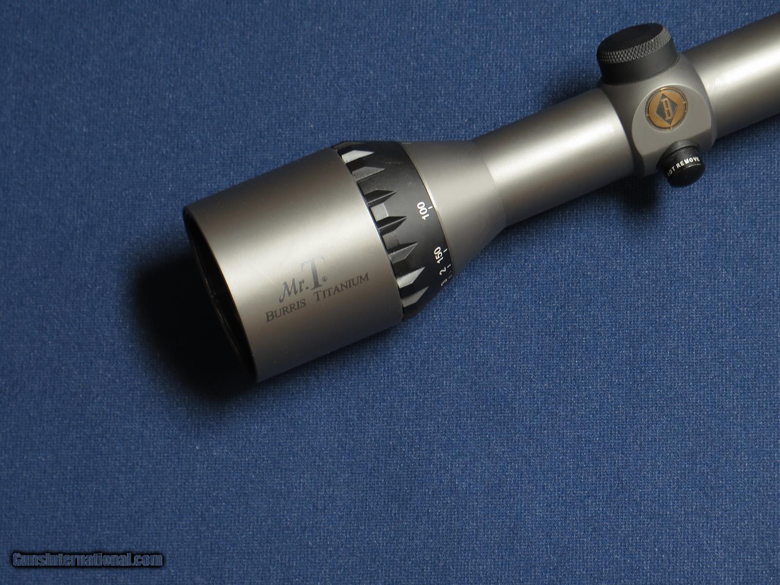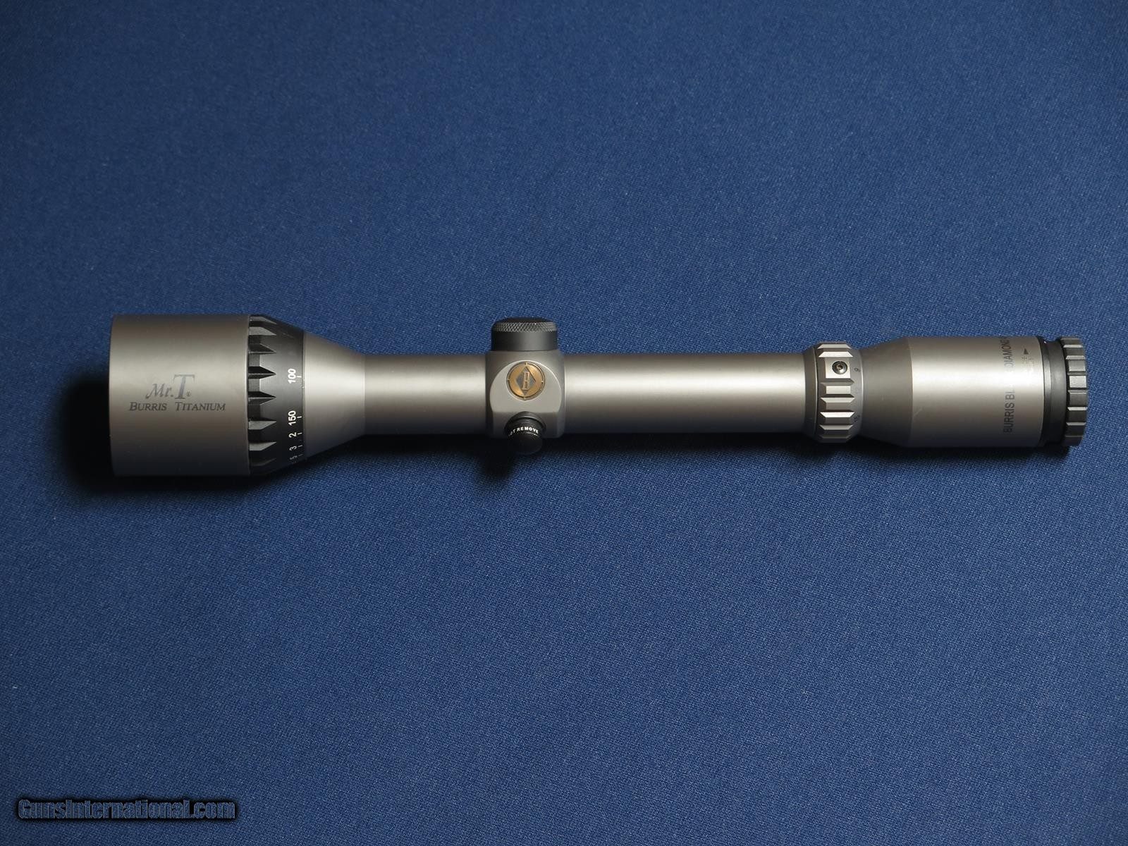 Description: Burris Mr. T Black Diamond Titanium 4-16x50 scope. 30mm tube. Duplex. Excellent condition. Buyer pays shipping cost. SOLD |